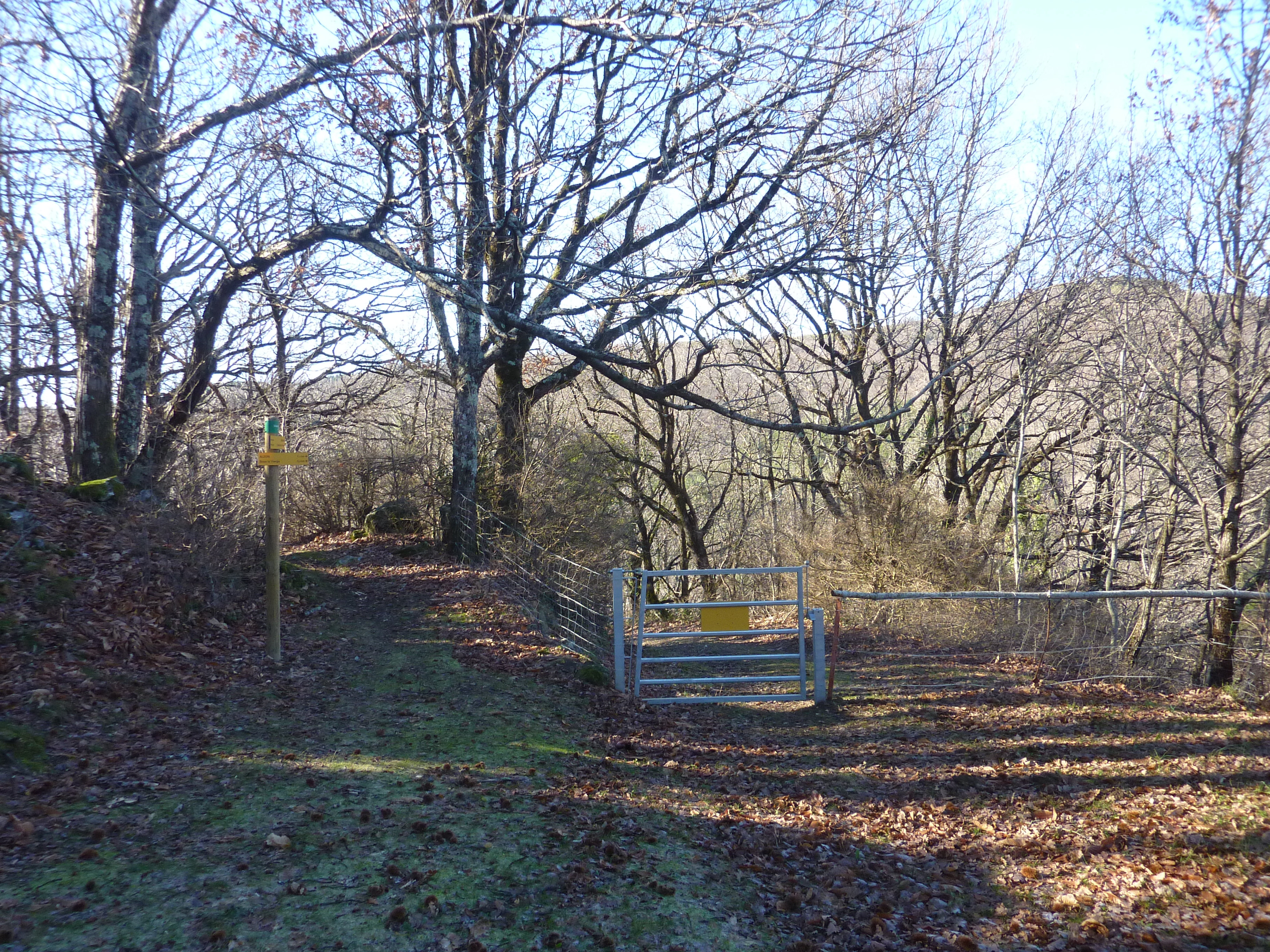 A ce croisement marqué par la présence d'un portail (700 mètres après le précédent), suivre le chemin partant sur la droite direction Alzon, balisé en jaune