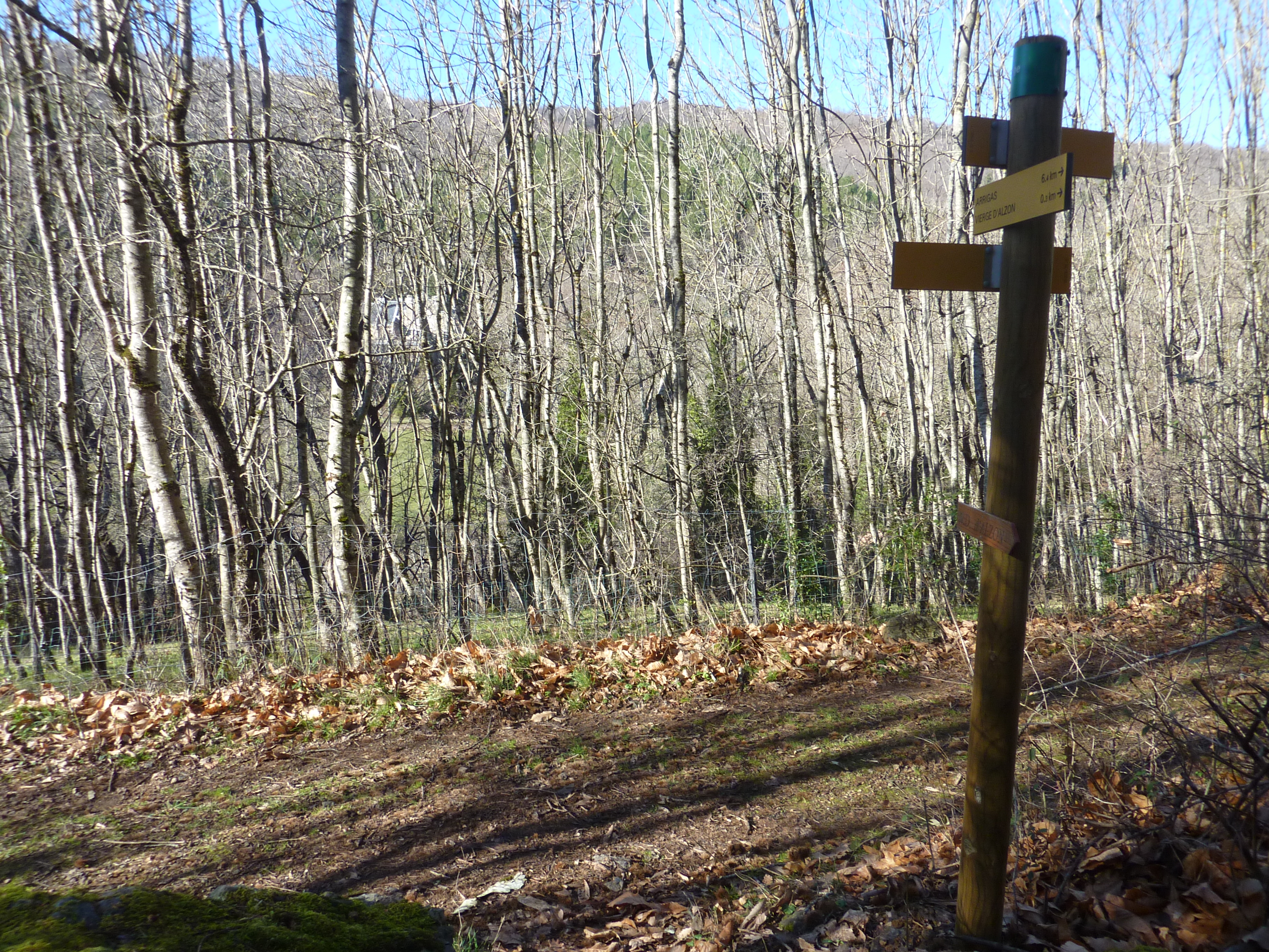 A ce croisement (350 mètres après le précédent) (1035 m), suivre le chemin montant raidement tout droit direction Saint-Guiral, balisé en rouge et blanc, et en jaune
