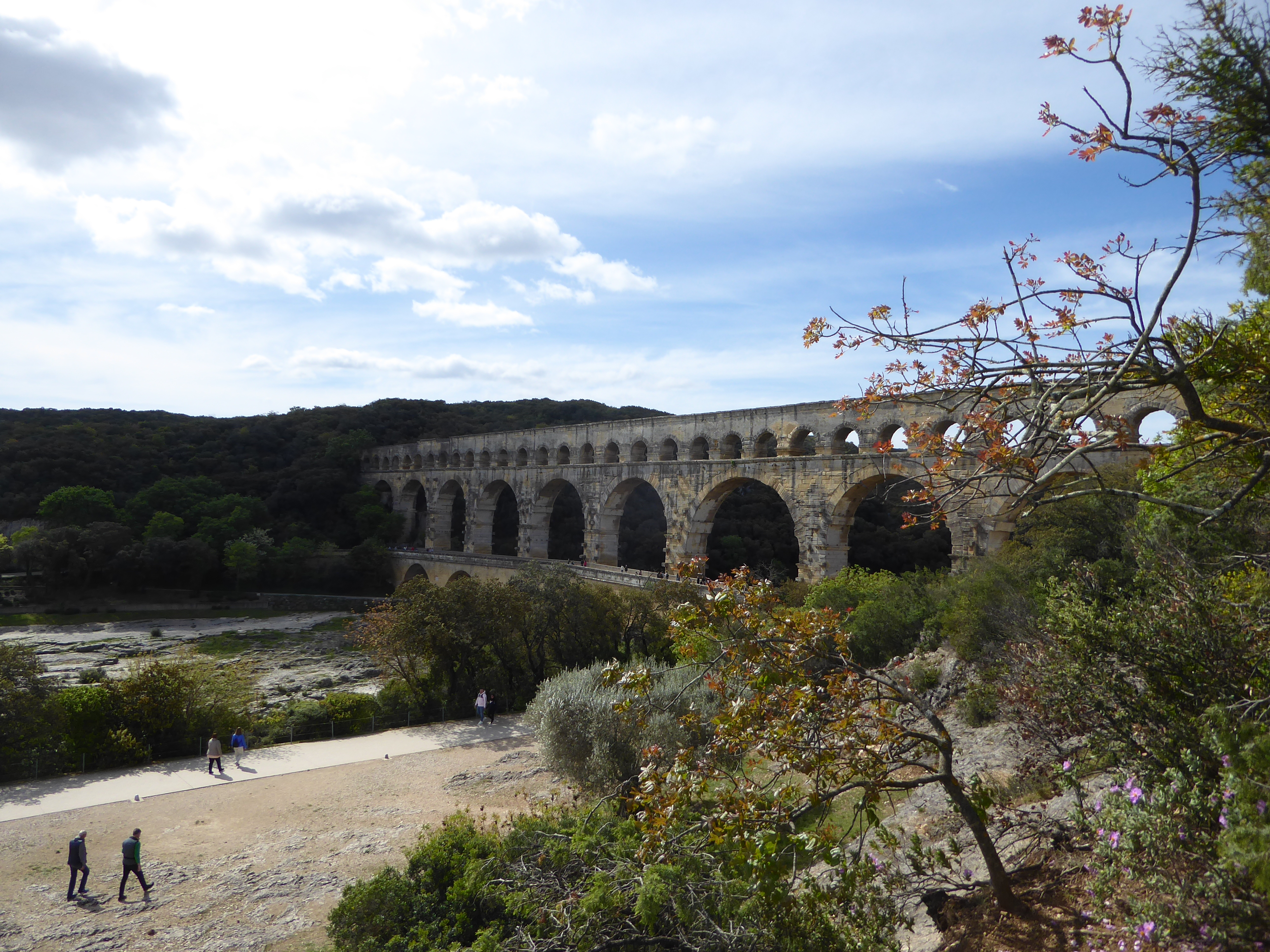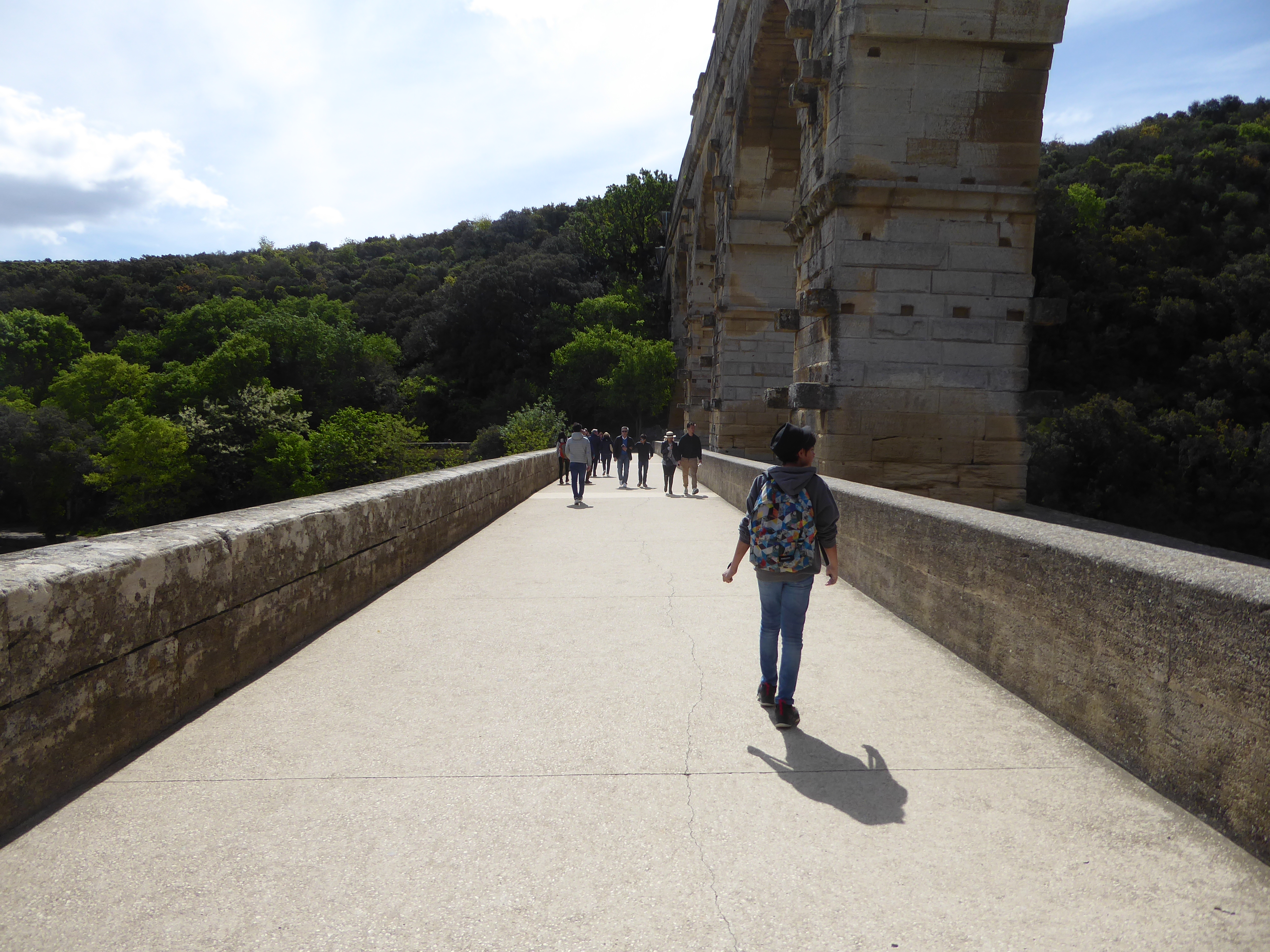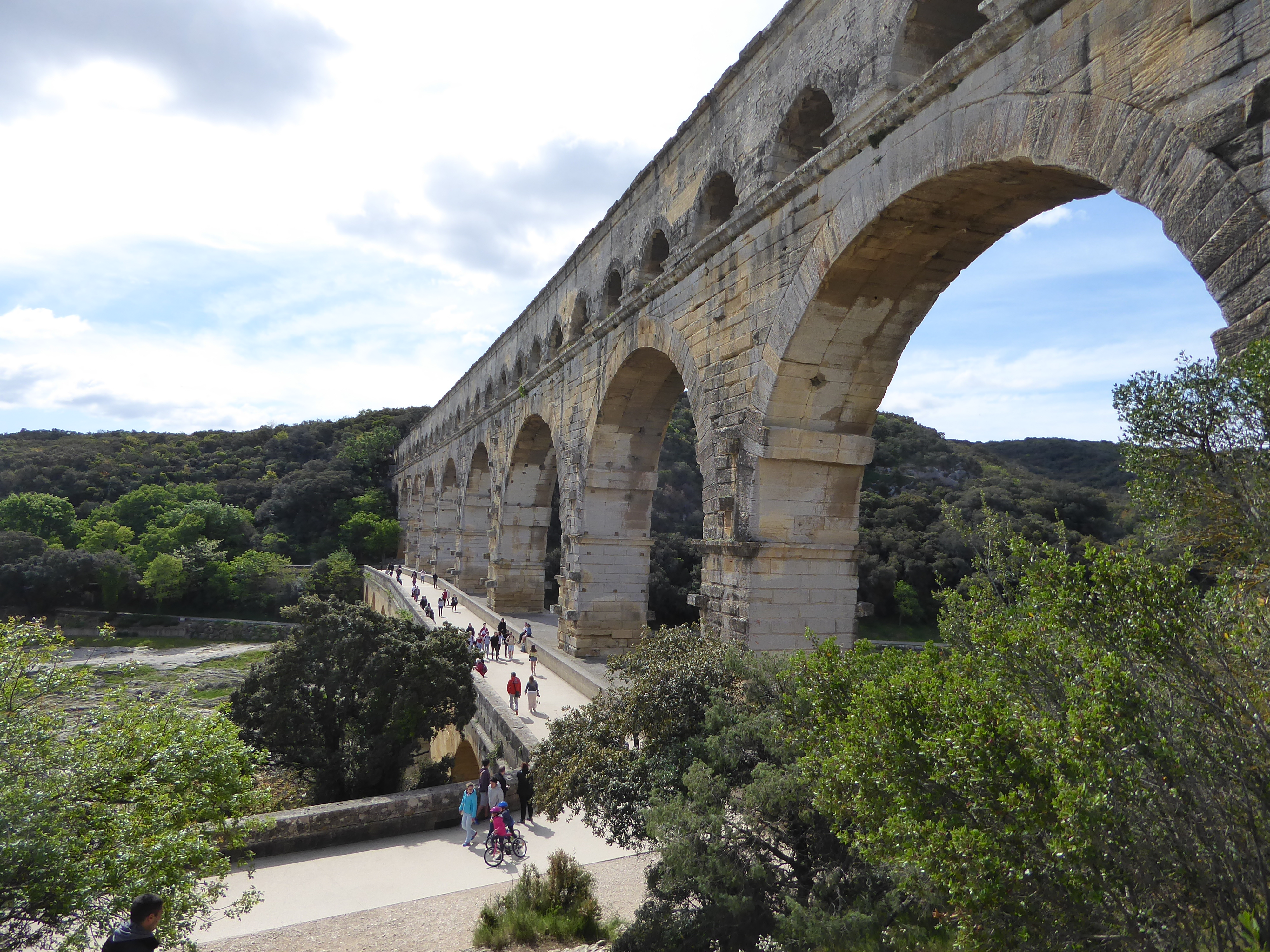 Arrivée au Pont du Gard (39 m) : beaucoup de monde aujourd'hui avec le beau temps malgré le Mistral qui rafraîchit l'atmosphère ... profitez du lieu et de la vue en hauteur sur le Gardon !