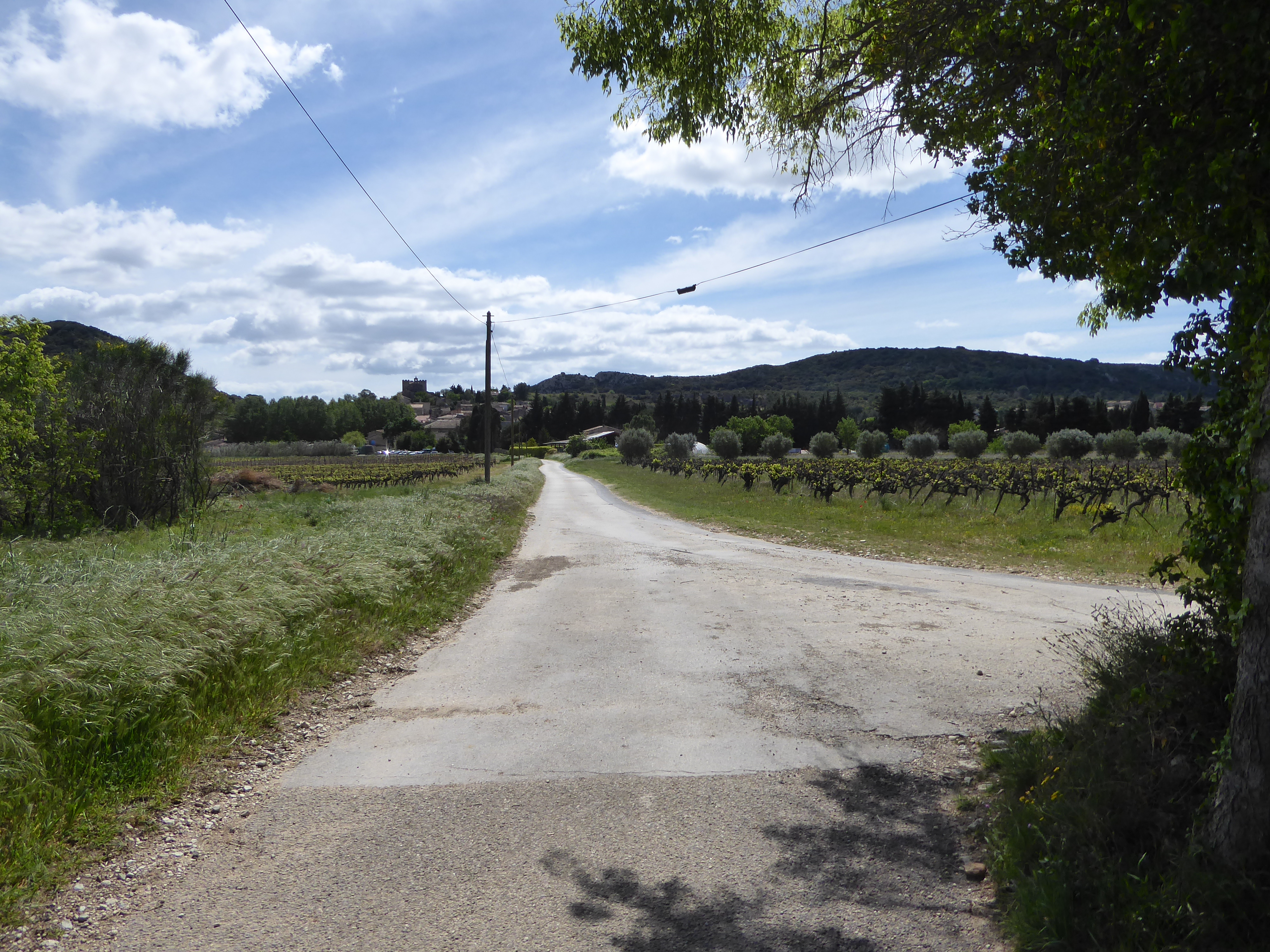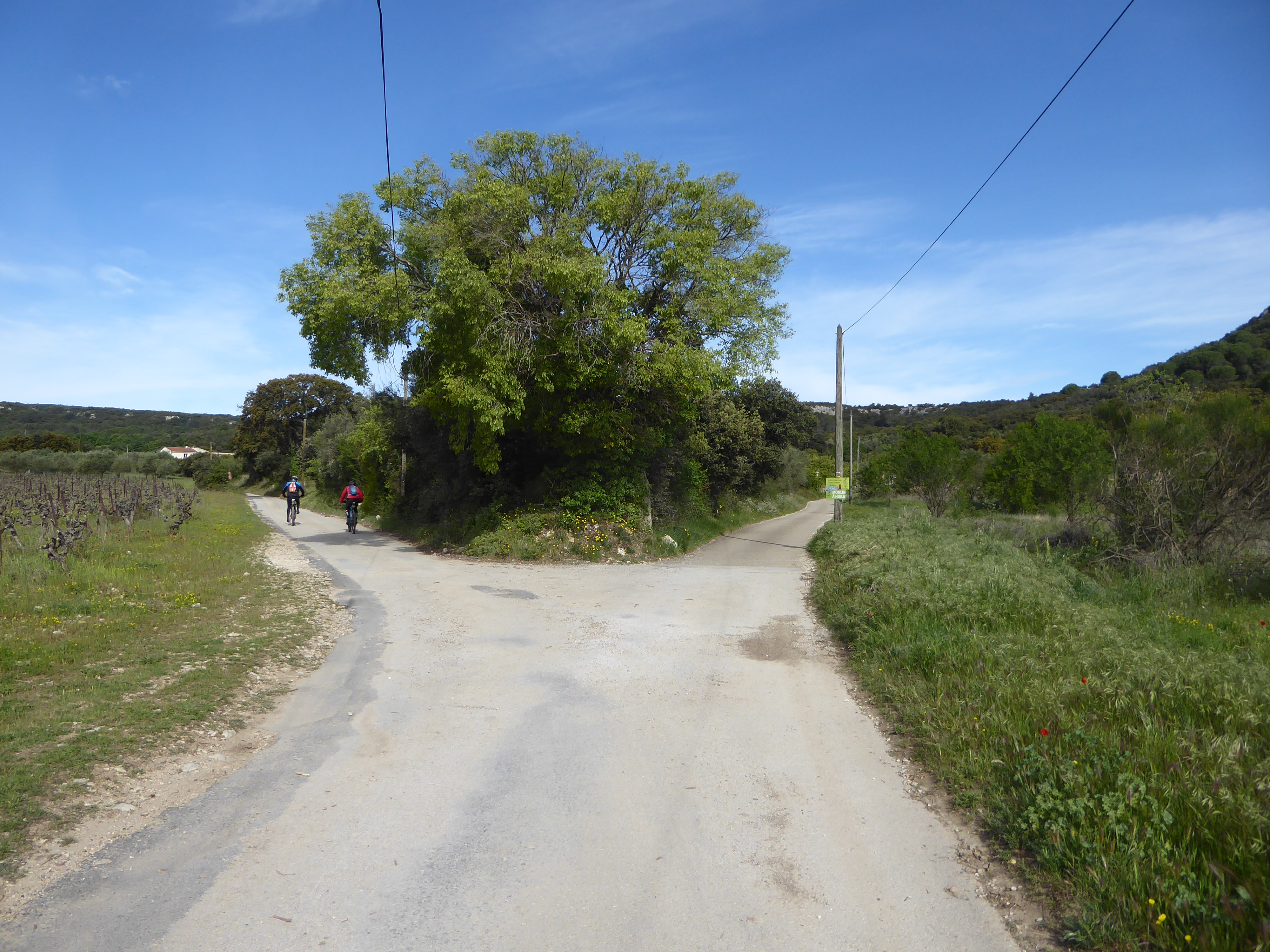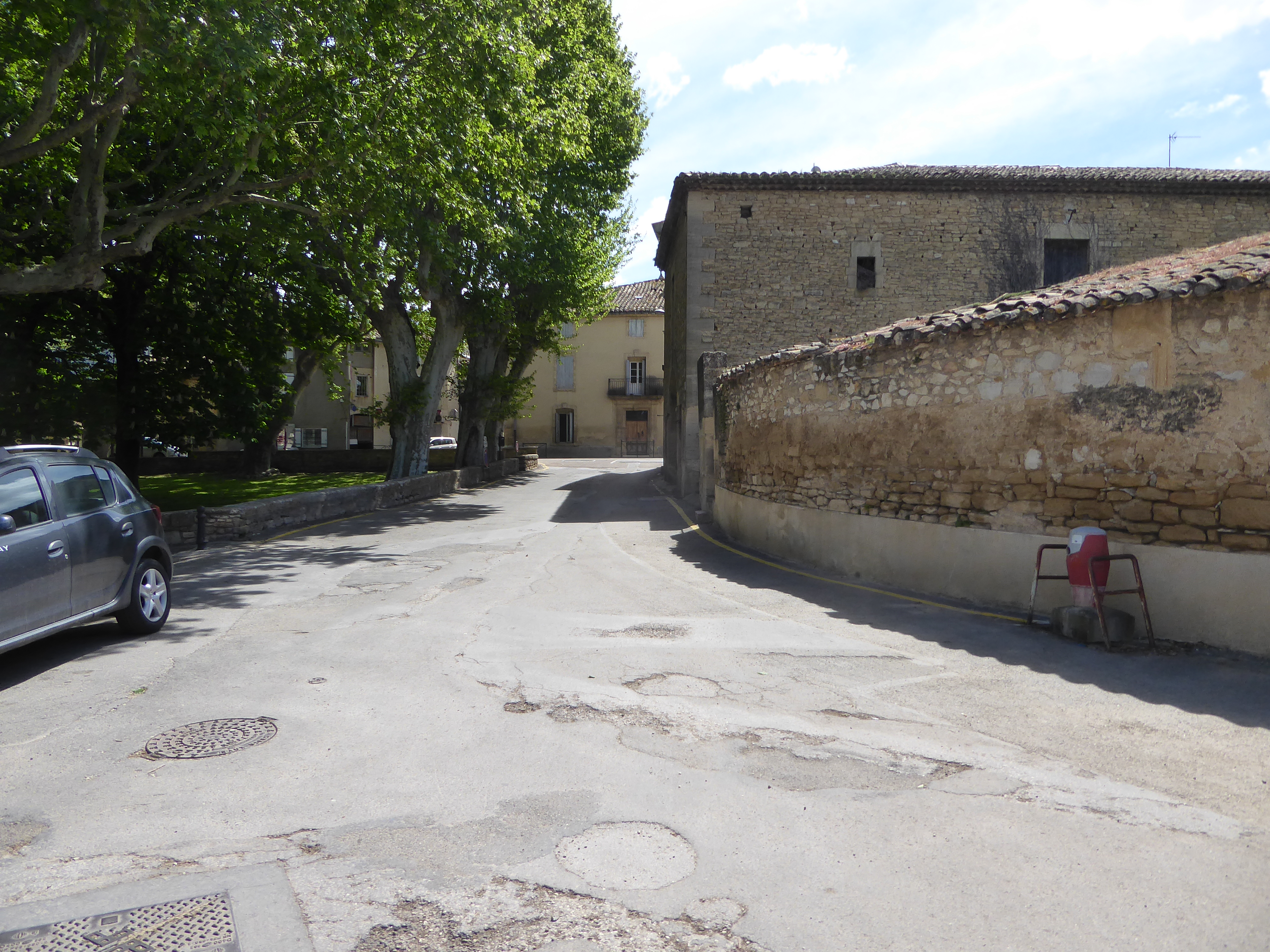 A cette intersection à l'approche du village, suivre la route partant tout droit direction Saint-Bonnet-du-Gard, balisé en rouge et blanc