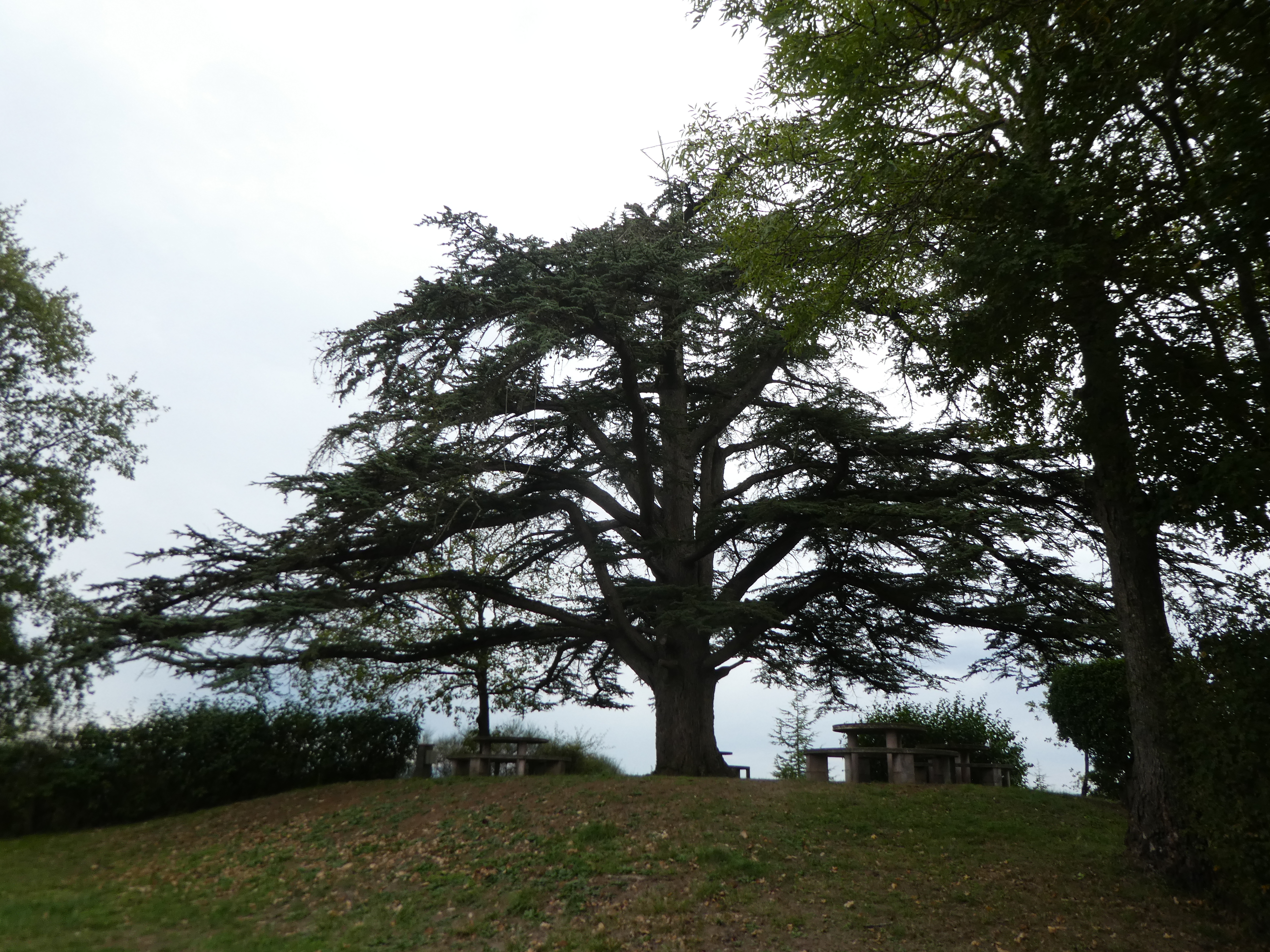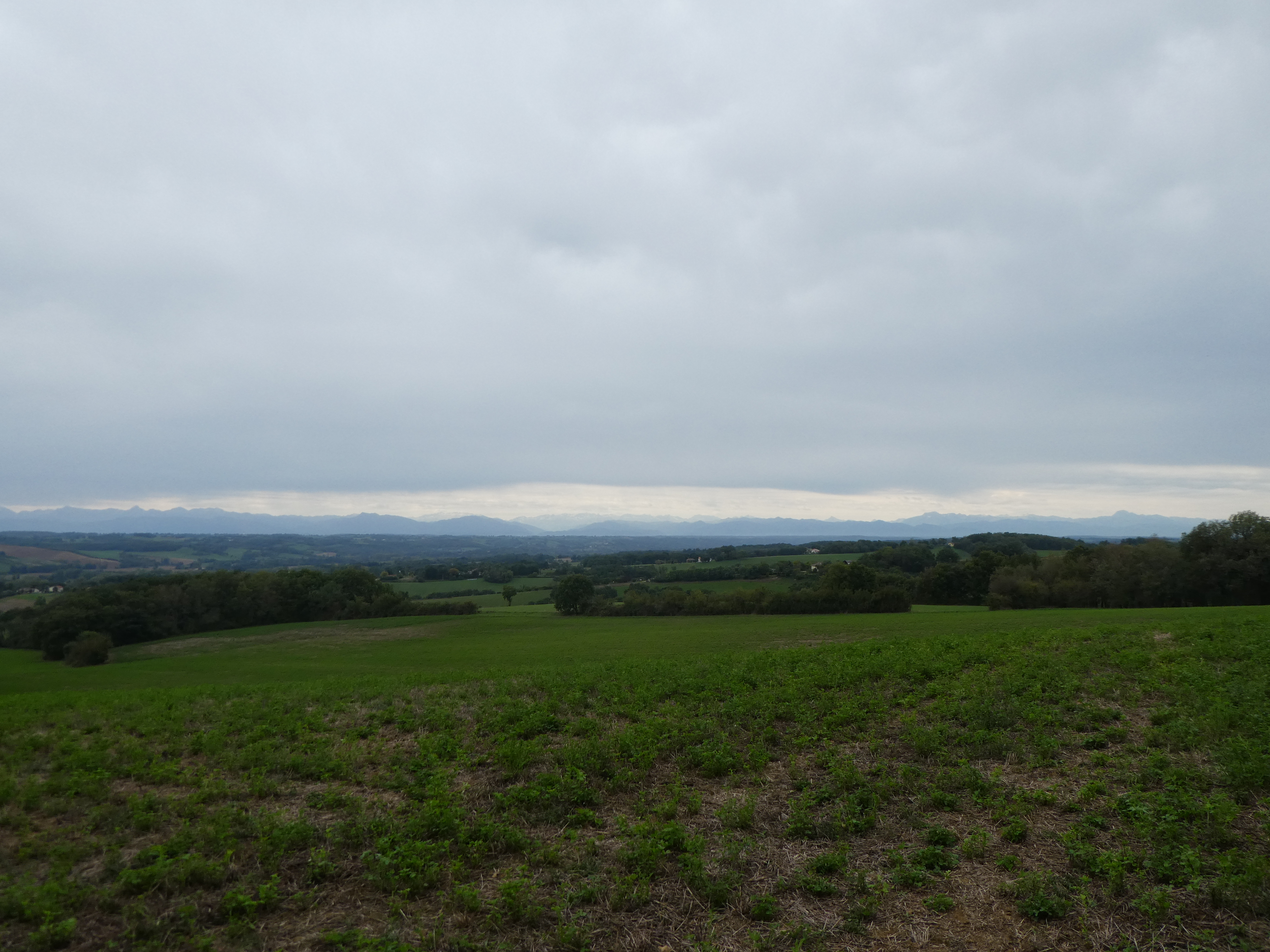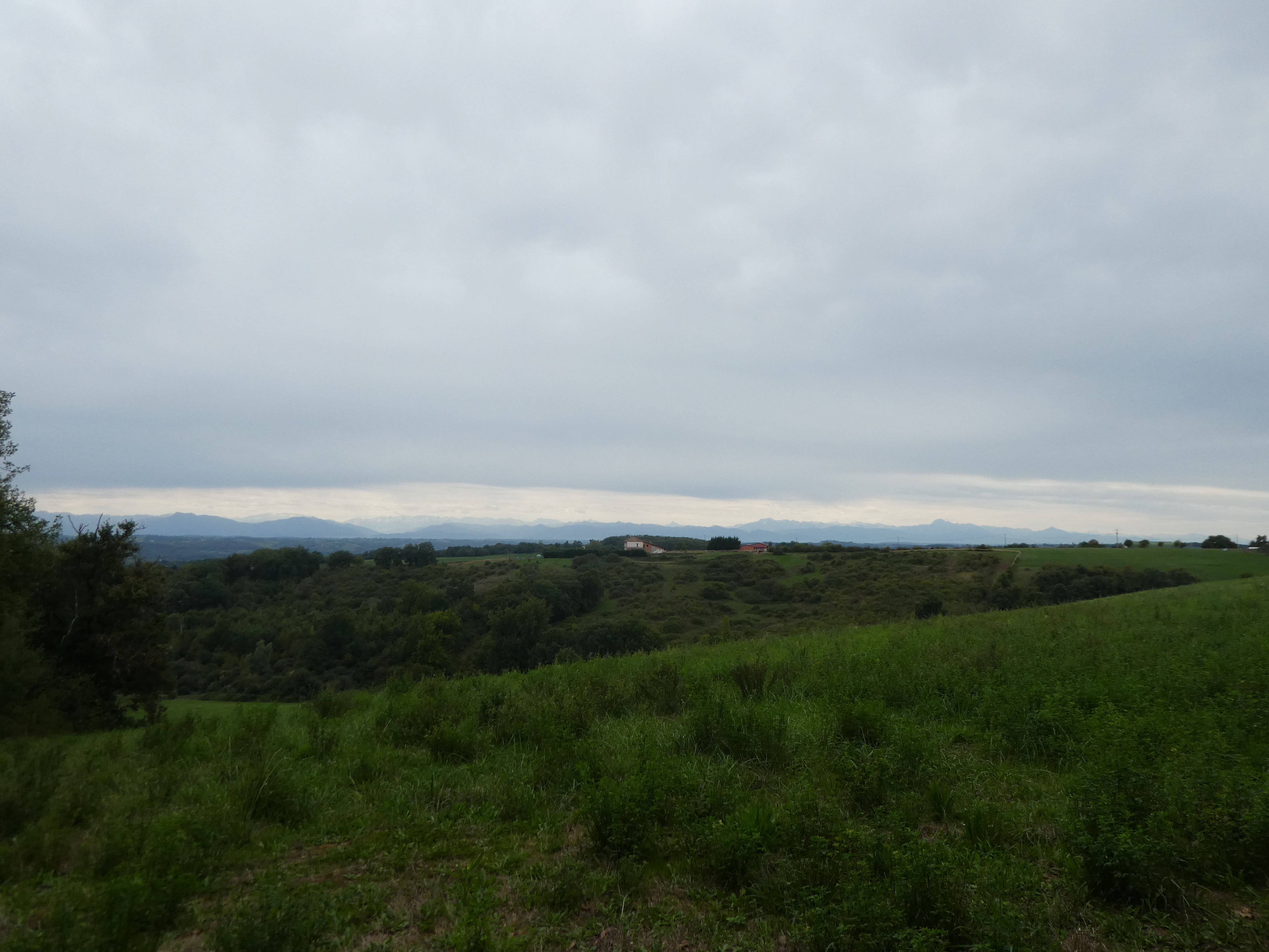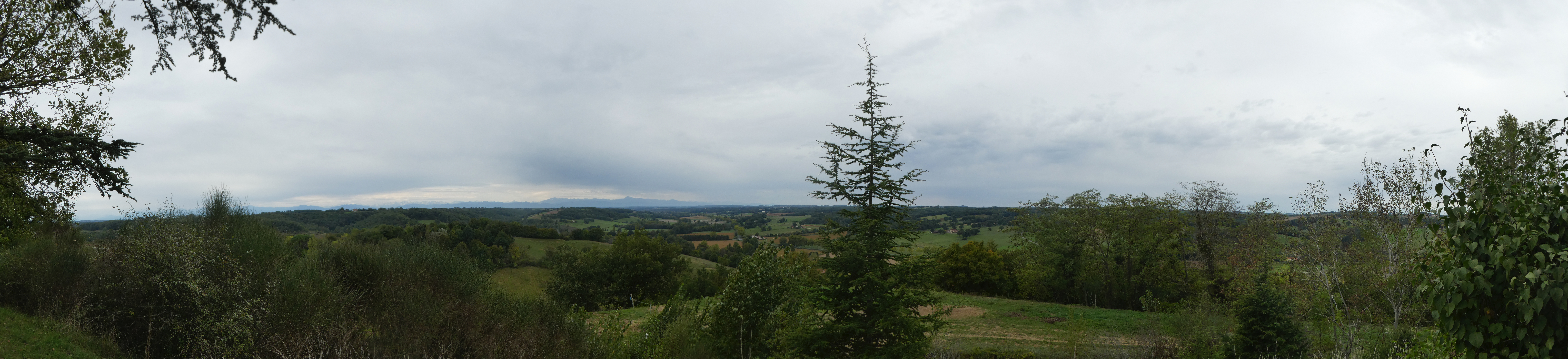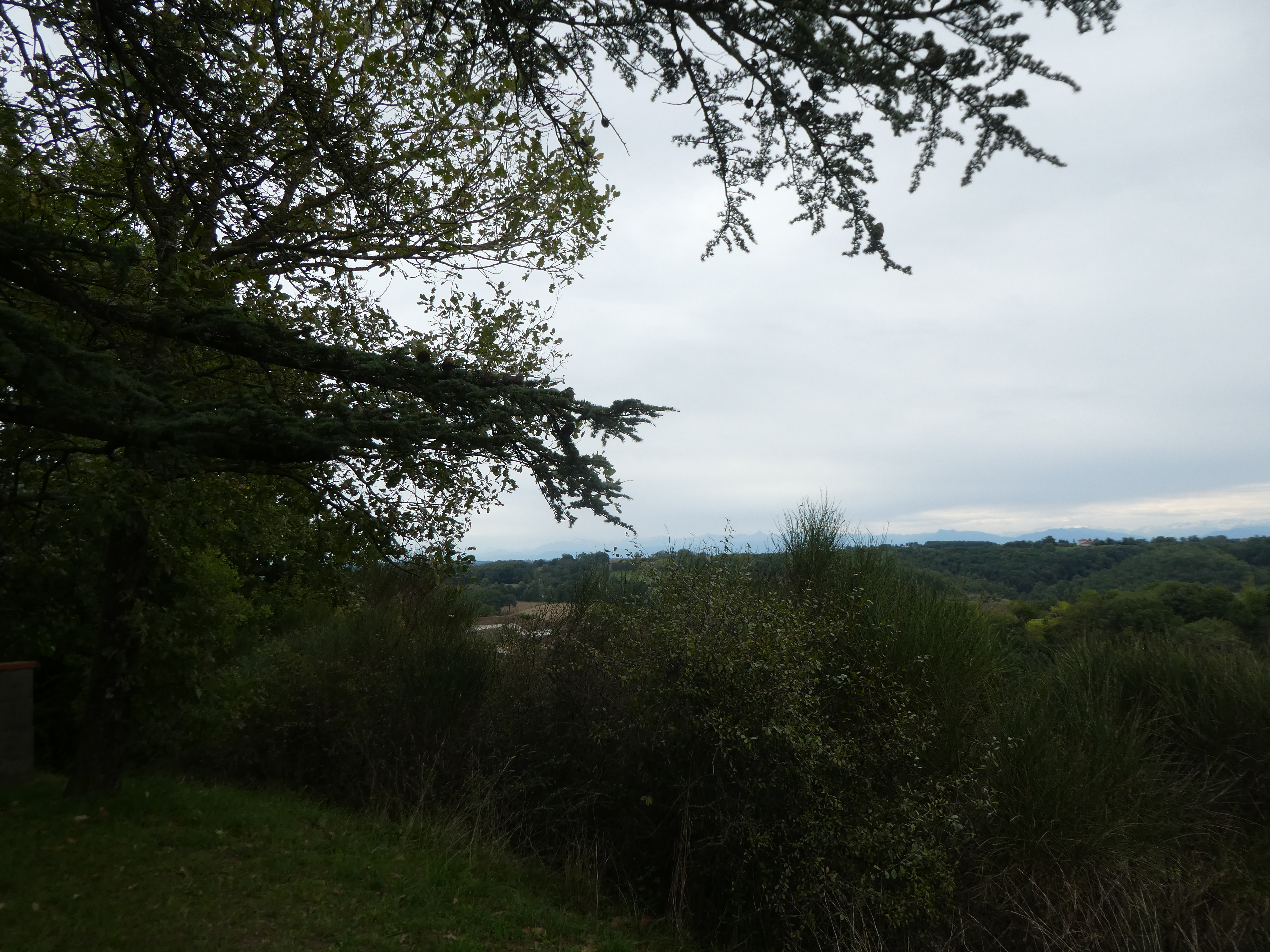Arrivée au sommet du Plèche (290 m) : beau panorama malgré le ciel couvert sur les sommets de la Haute-Ariège, du Couserans, des Pyrénées Haut-Garonnaises, de la Vallée d'Aure et du Louron, de la Haute-Bigorre, de la Vallée des Gaves, de la Vallée du Valentin et de l'Ouzom ainsi que sur la plaine haut-garonnaise