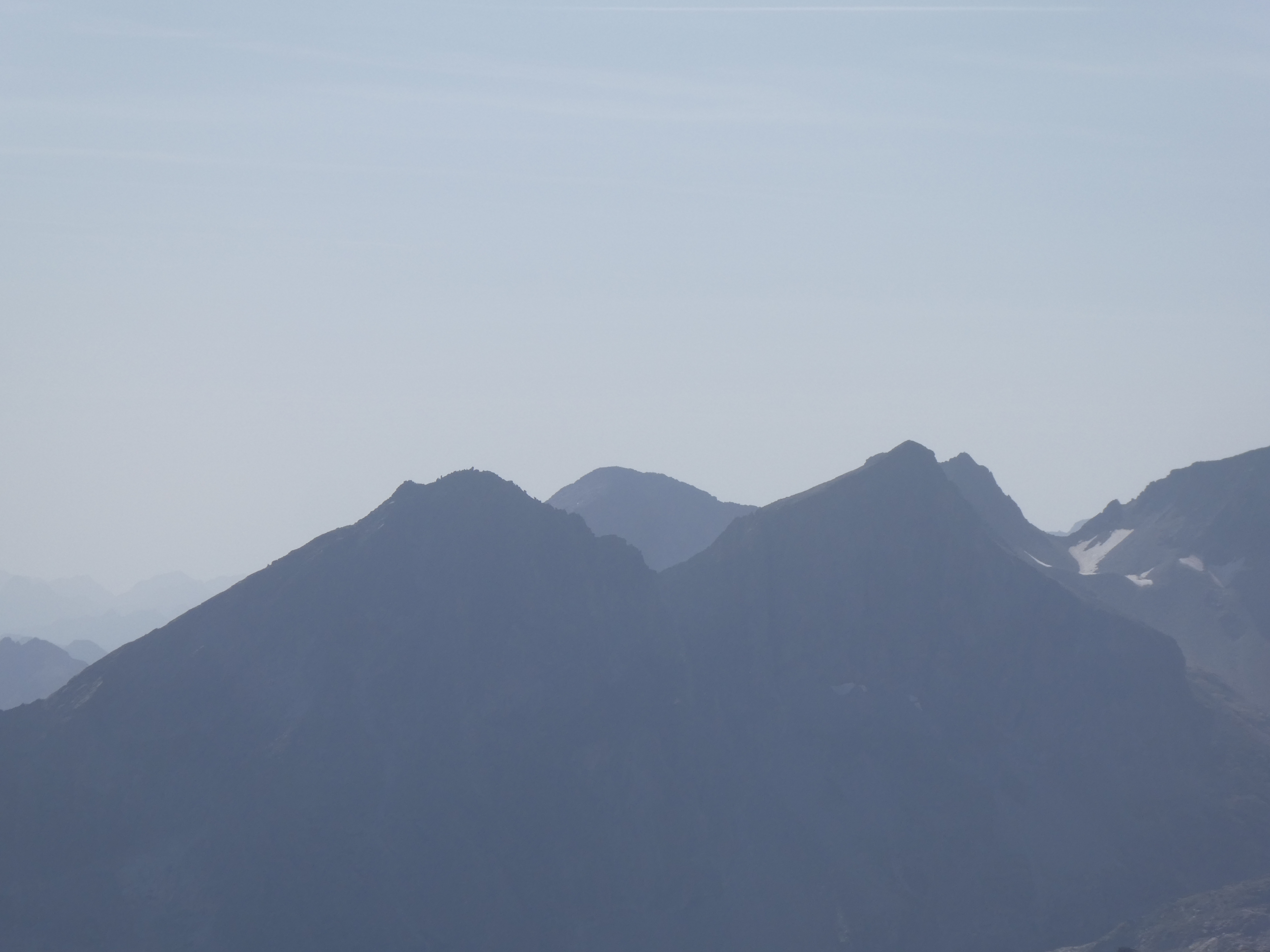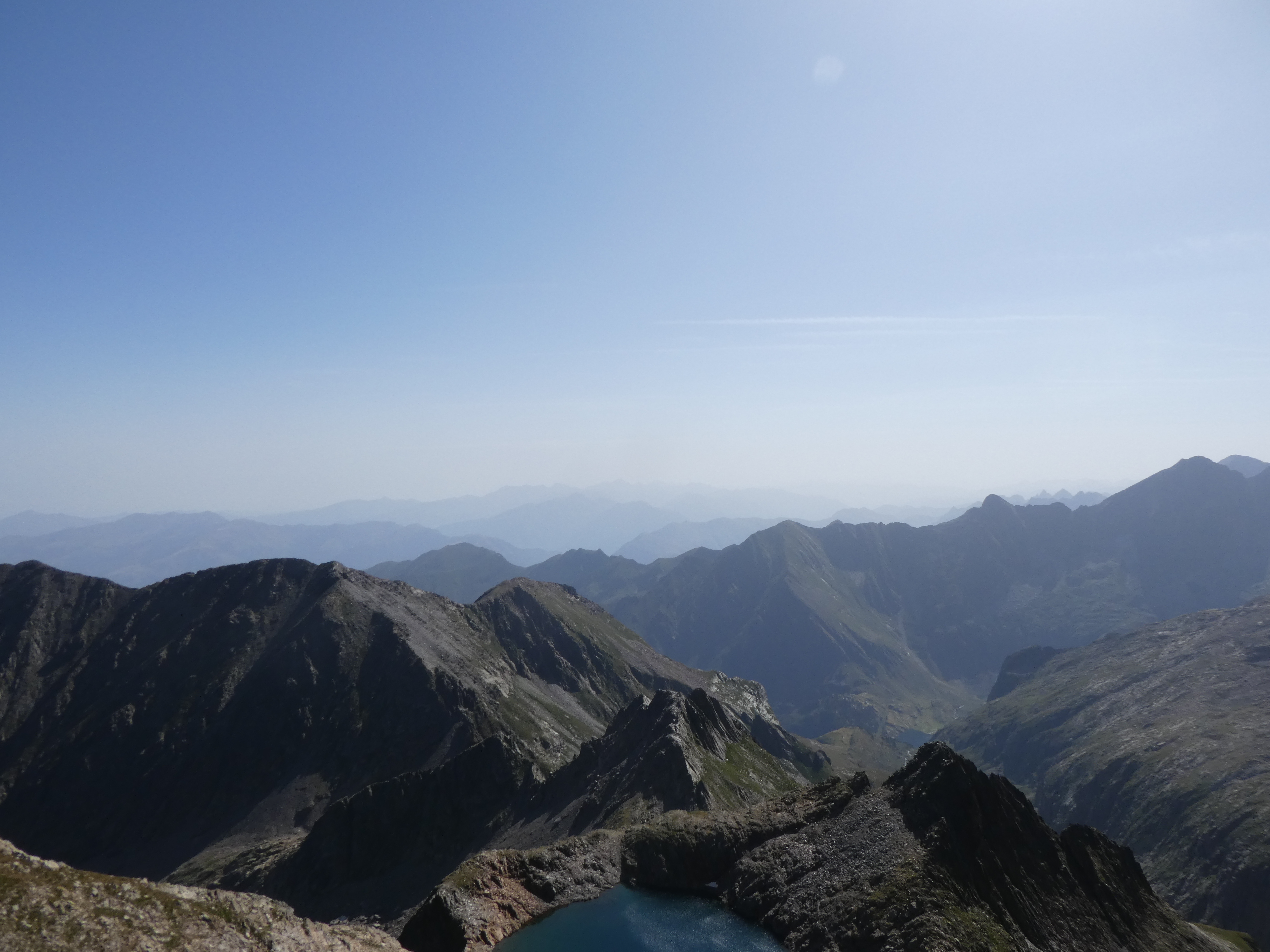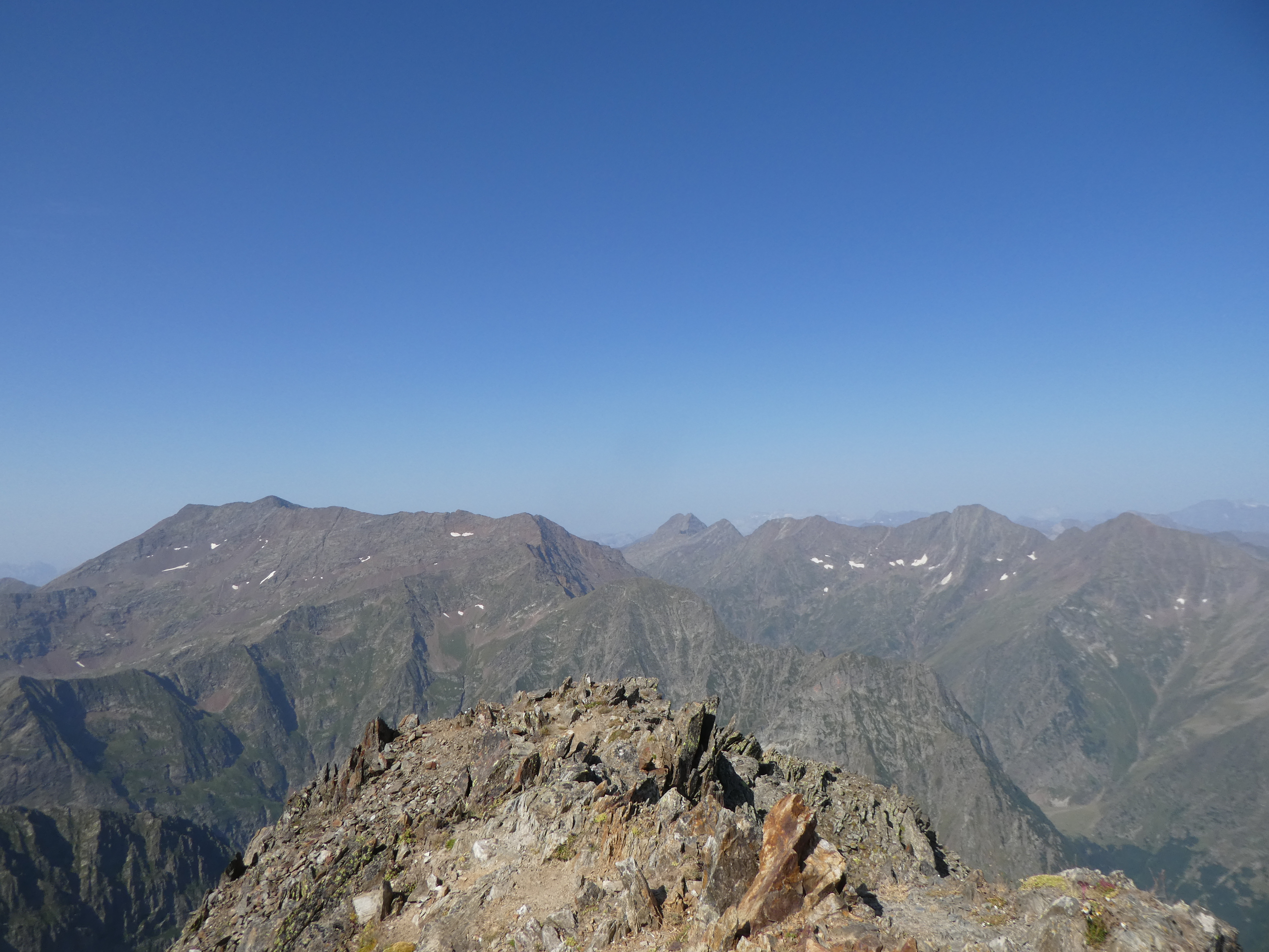 Arrivée au sommet du Pic de Hourgade (2964 m) : beau panorama malgré la présence de brume de chaleur sur les sommets des Pyrénées Haut-Garonnaises, de la Vallée d'Aure et du Louron, de la Vallée des Gaves, de la Haute-Bigorre, du Couserans, du Pallars Sobirà, du Val d'Aran, de la Ribagorza, du Sobrarbe ainsi que sur la plaine haut-garonnaise