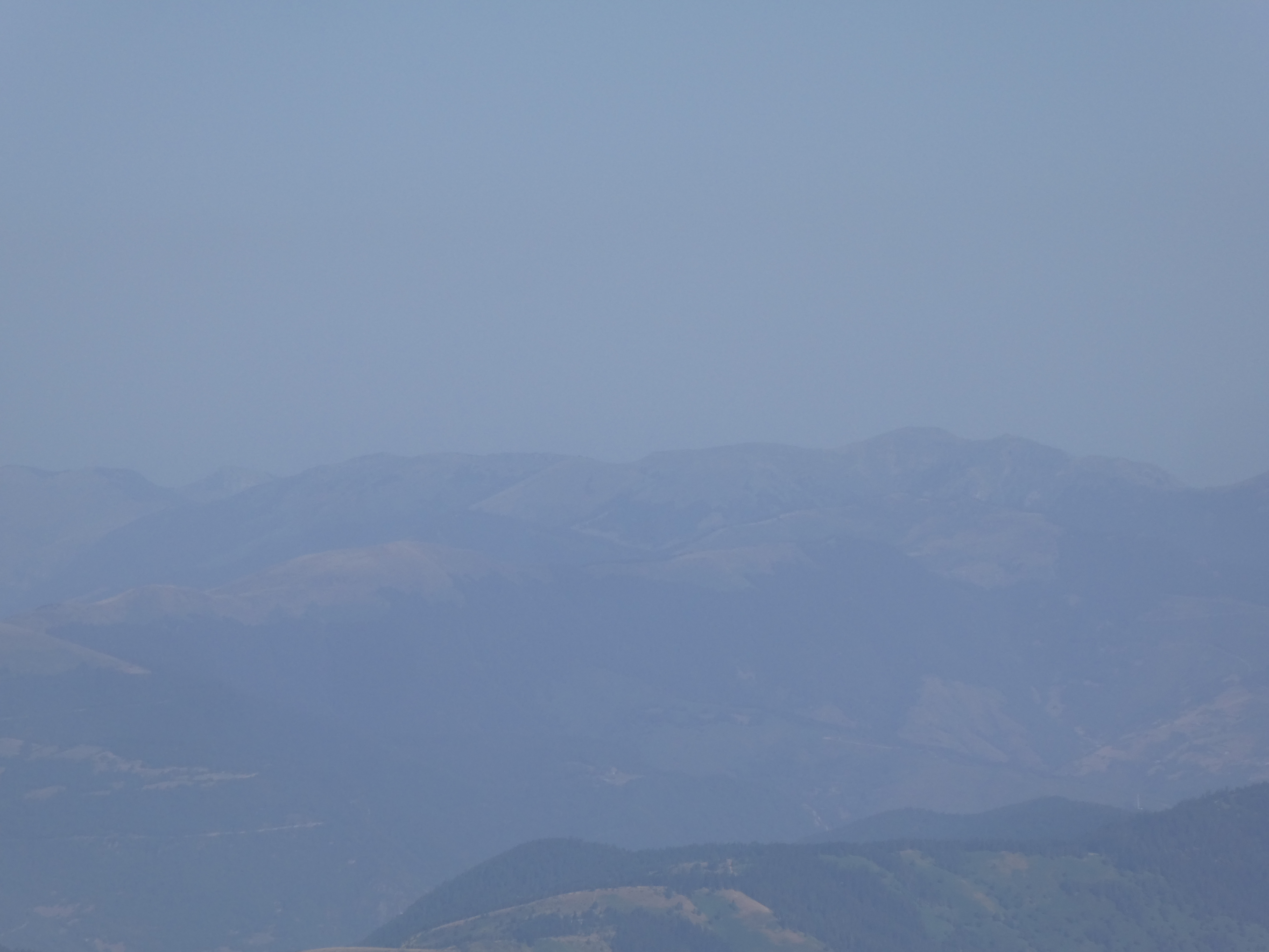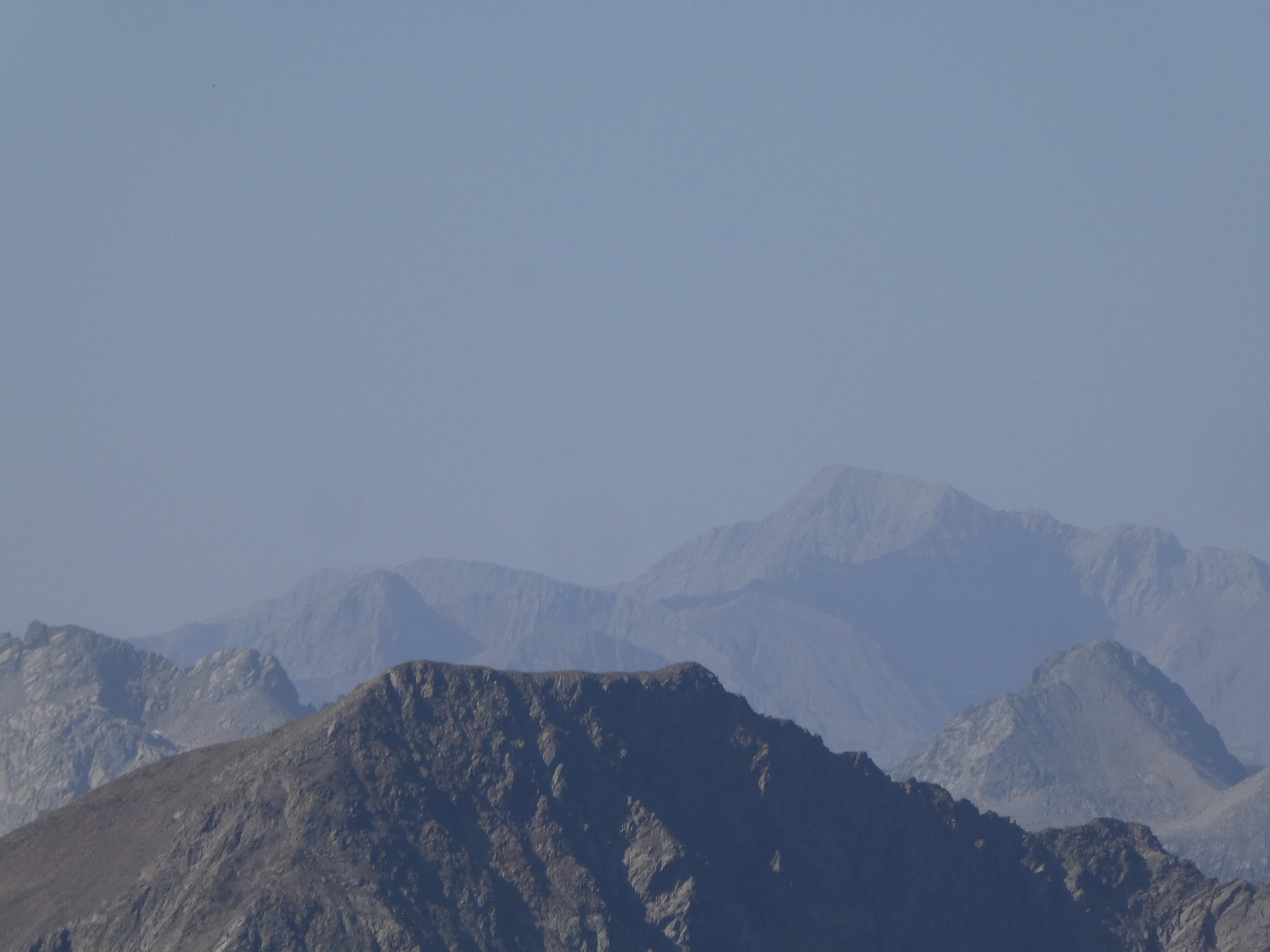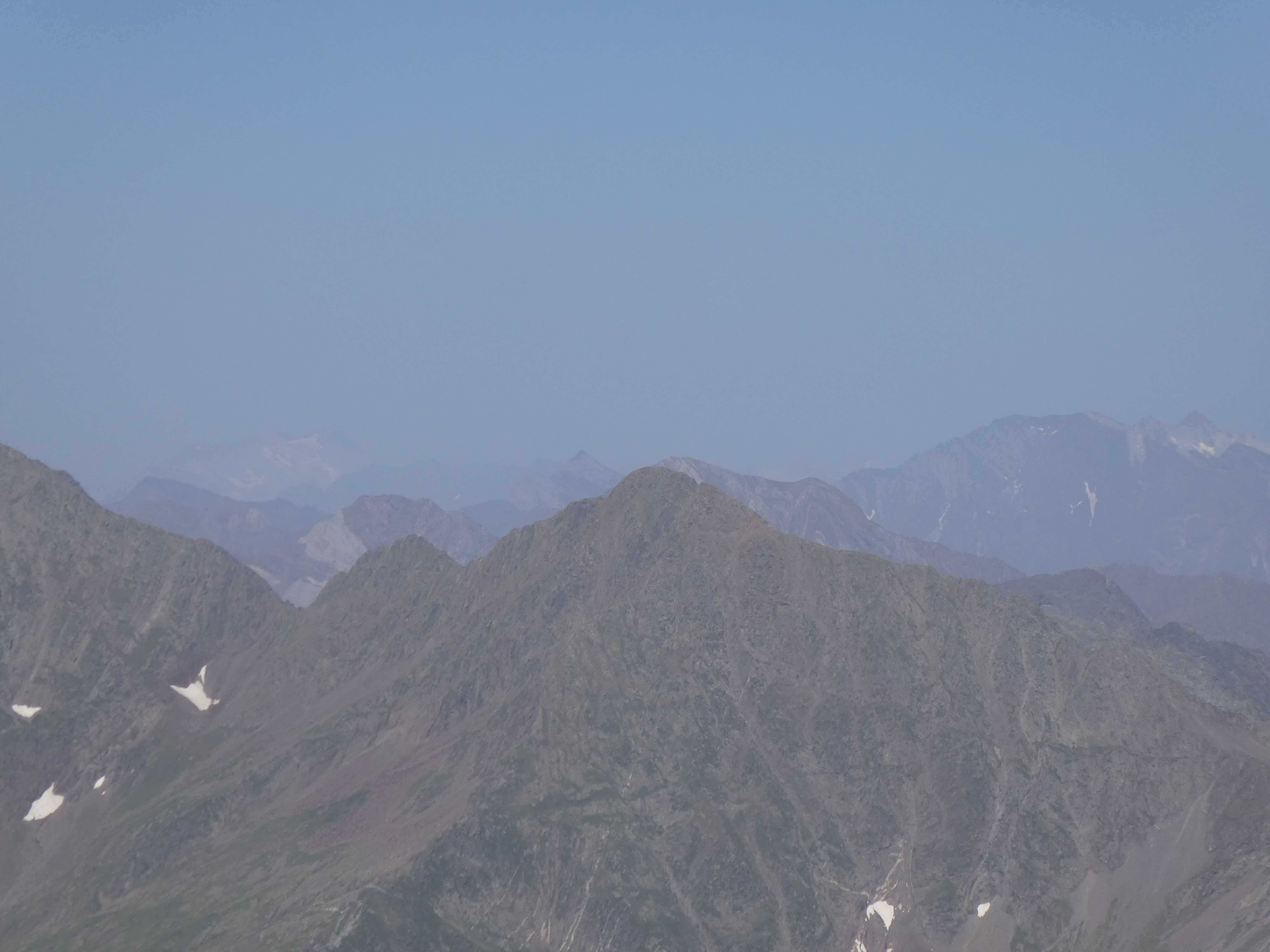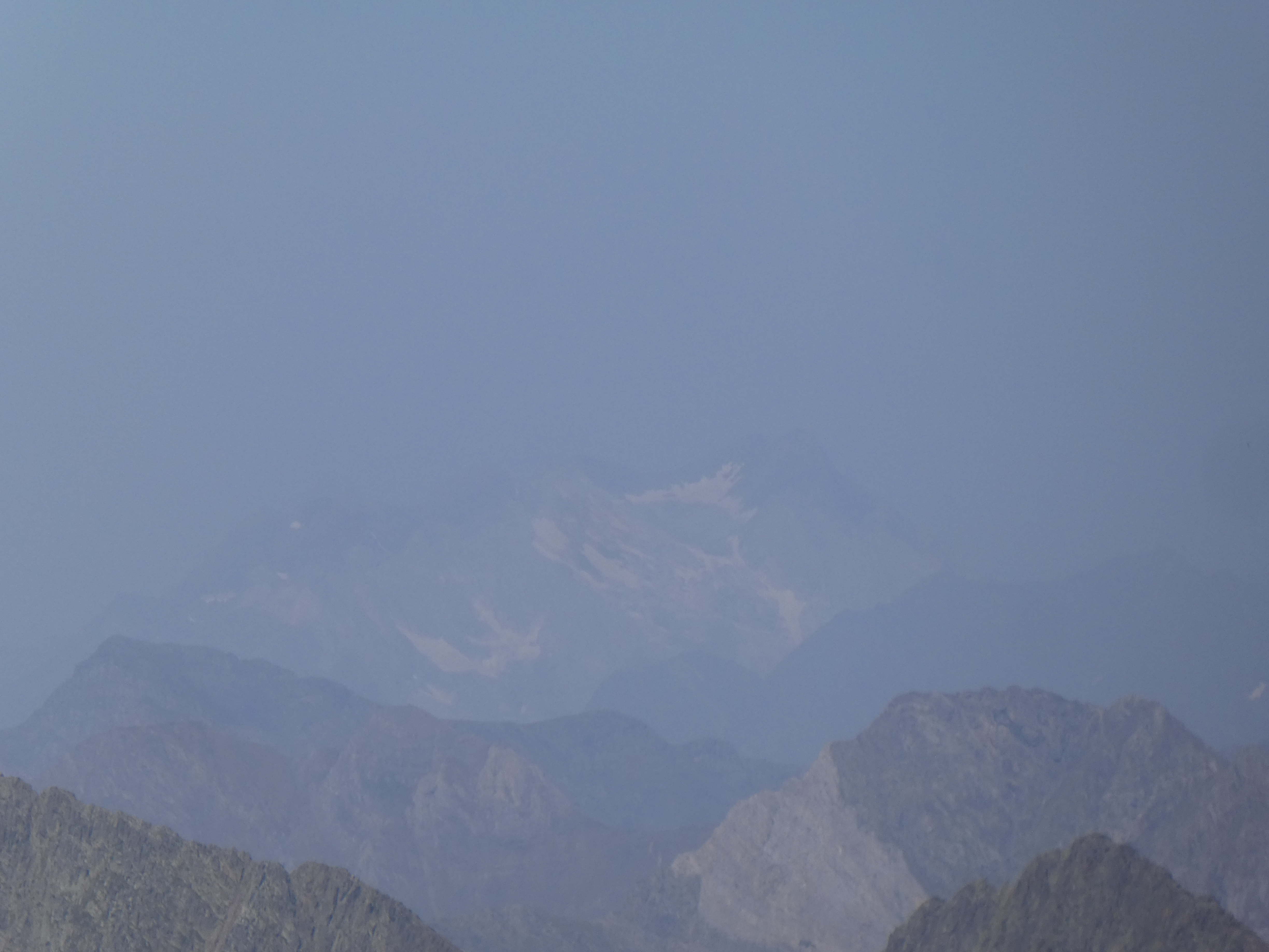 Arrivée au sommet du Pic de Hourgade (2964 m) : beau panorama malgré la présence de brume de chaleur sur les sommets des Pyrénées Haut-Garonnaises, de la Vallée d'Aure et du Louron, de la Vallée des Gaves, de la Haute-Bigorre, du Couserans, du Pallars Sobirà, du Val d'Aran, de la Ribagorza, du Sobrarbe ainsi que sur la plaine haut-garonnaise