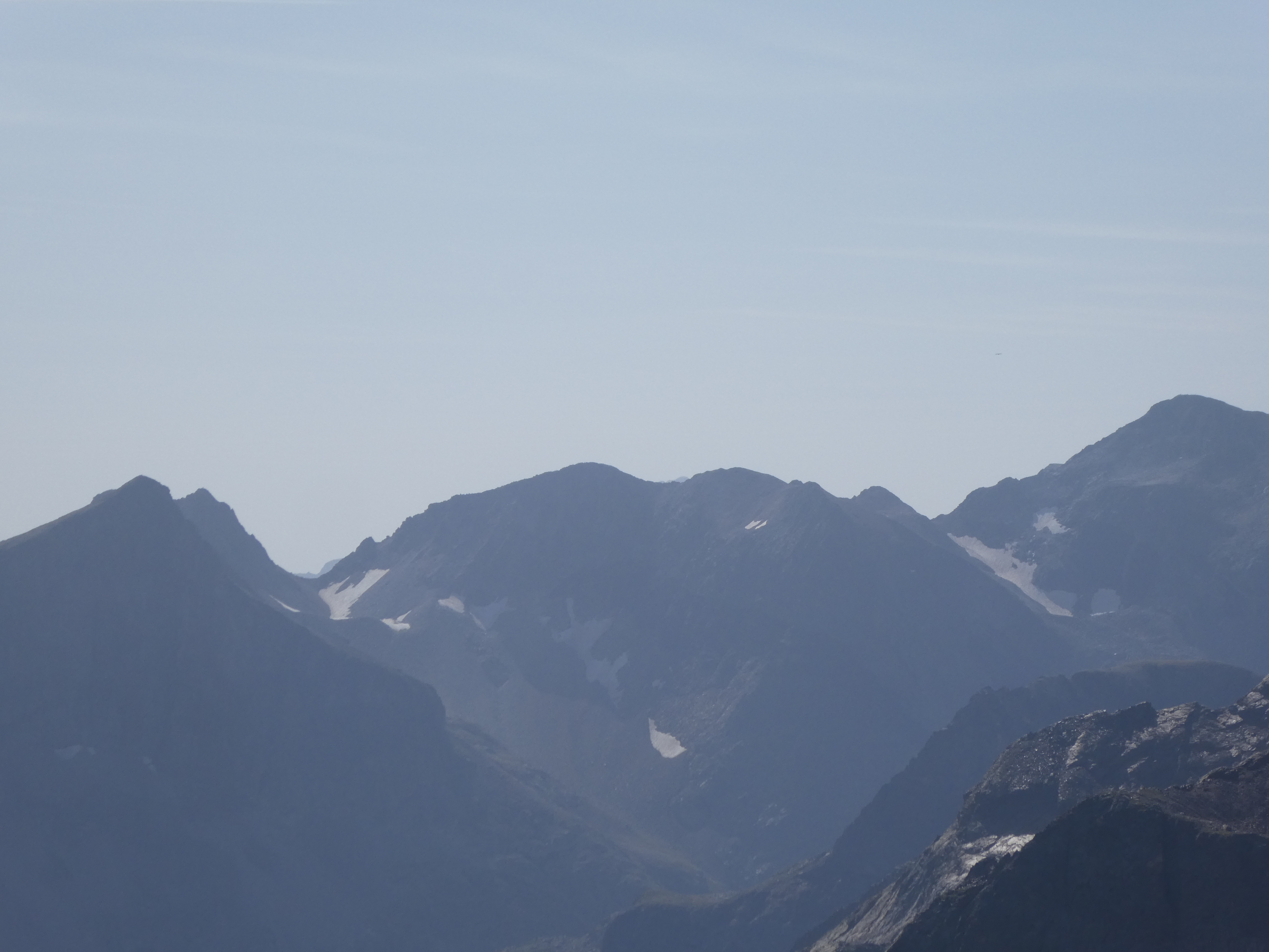 Zoom sur le Pic Méchant (2944 m) au centre-gauche et le Pic de Bugatet (2877 m) à droite
