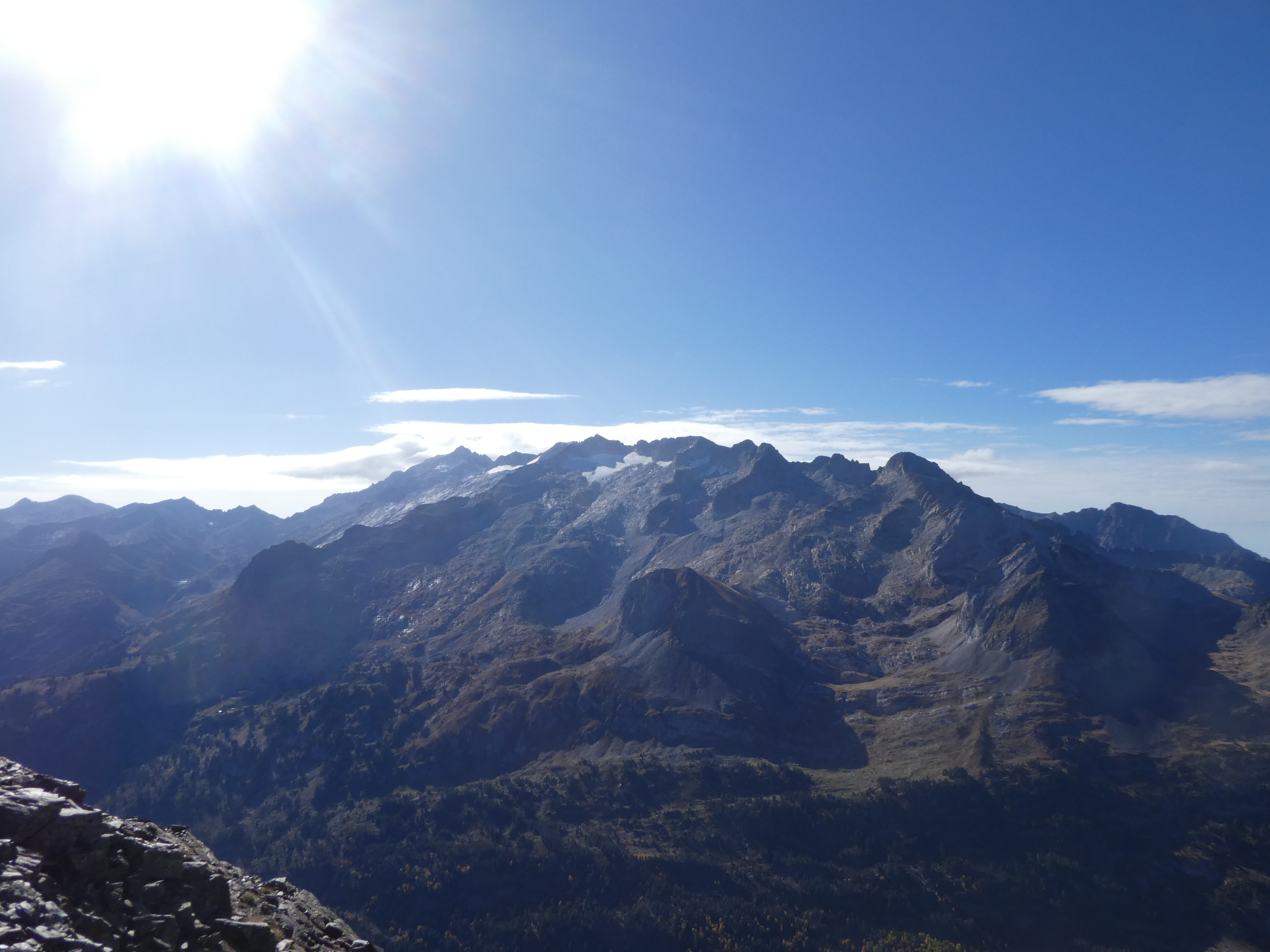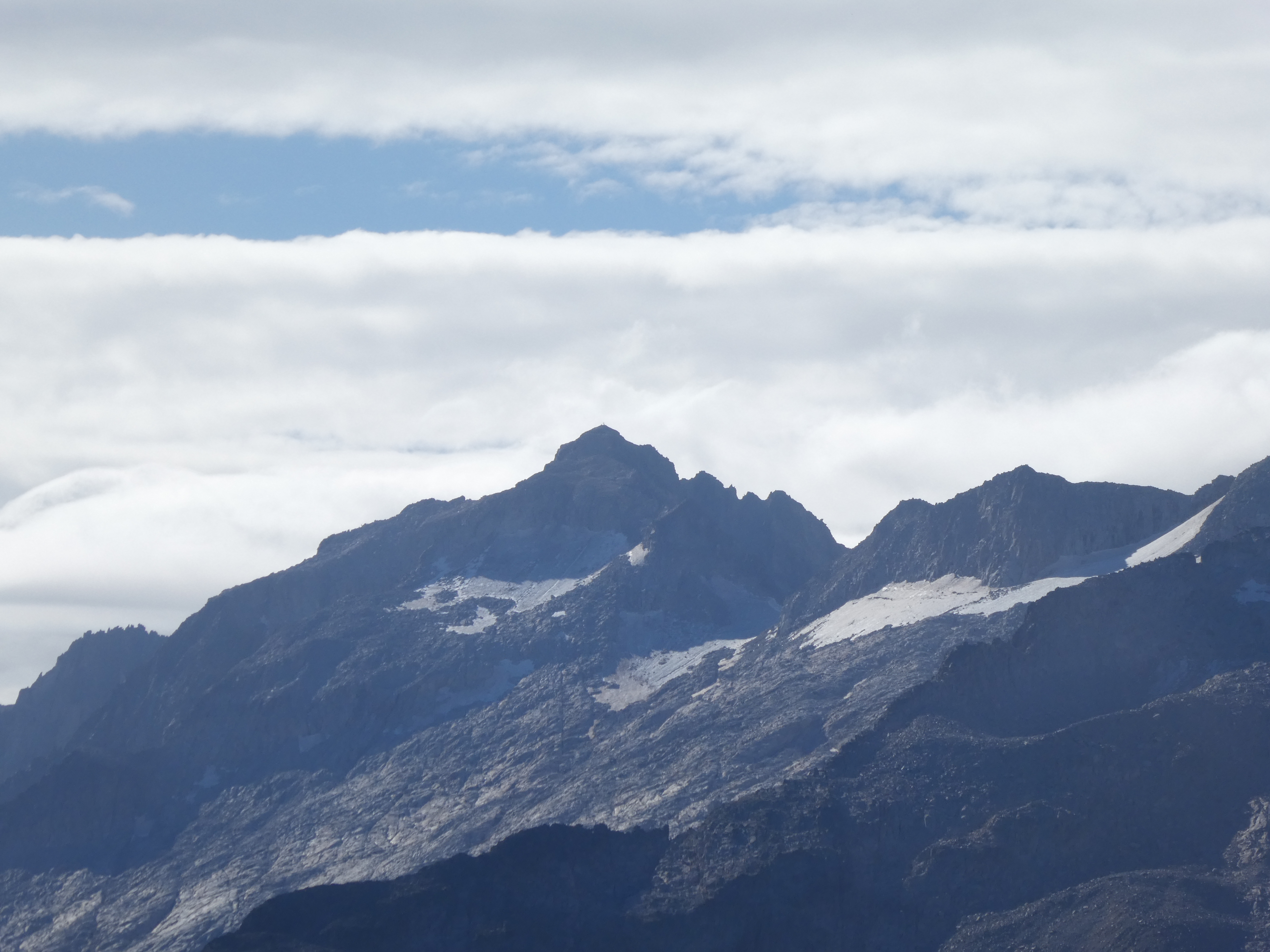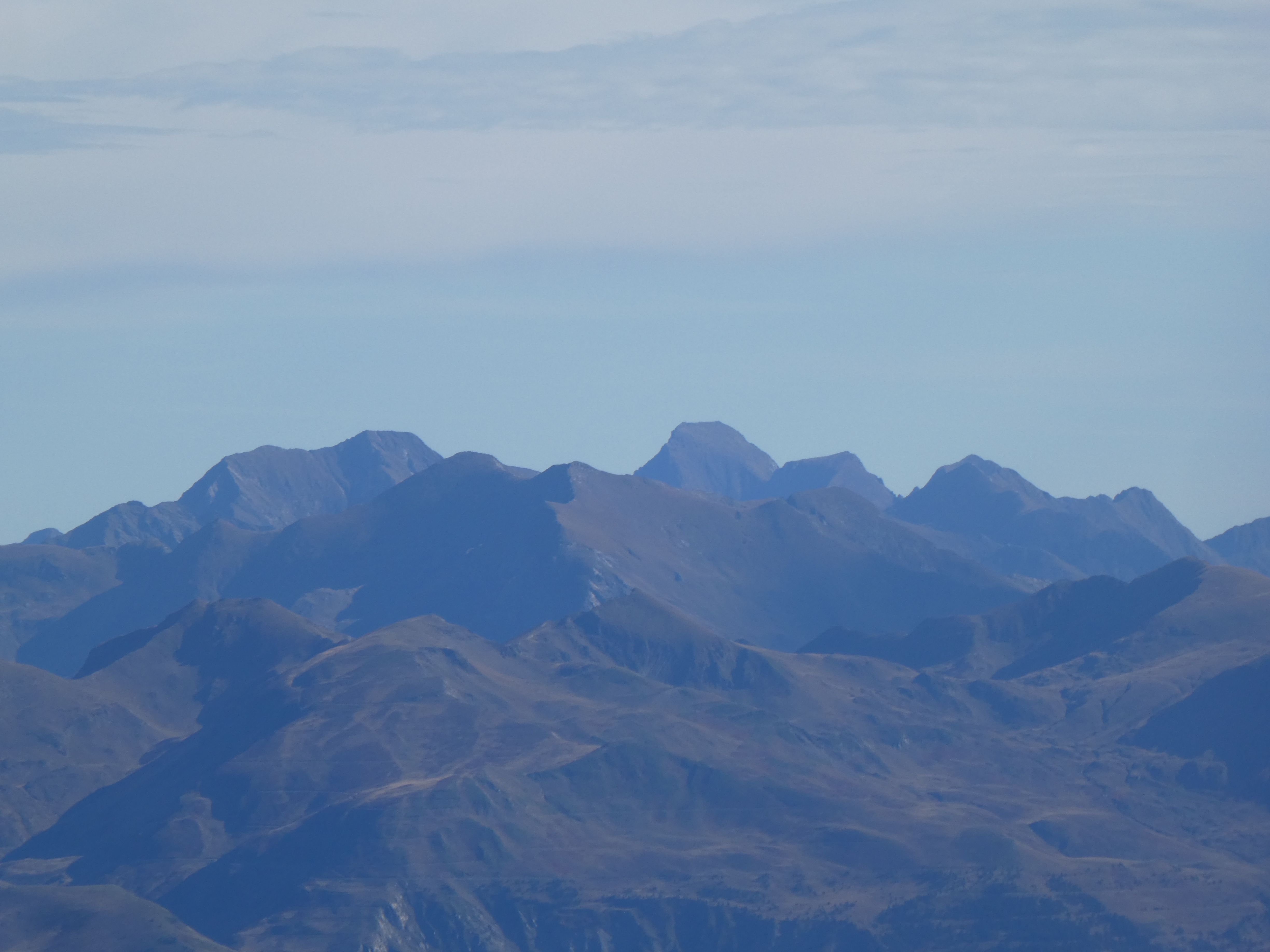 Zoom sur le Pic de Bassiero (2901 m) au centre-gauche, le Montardo (2833 m) au centre-droit et le Pui Pla (2829 m) à droite