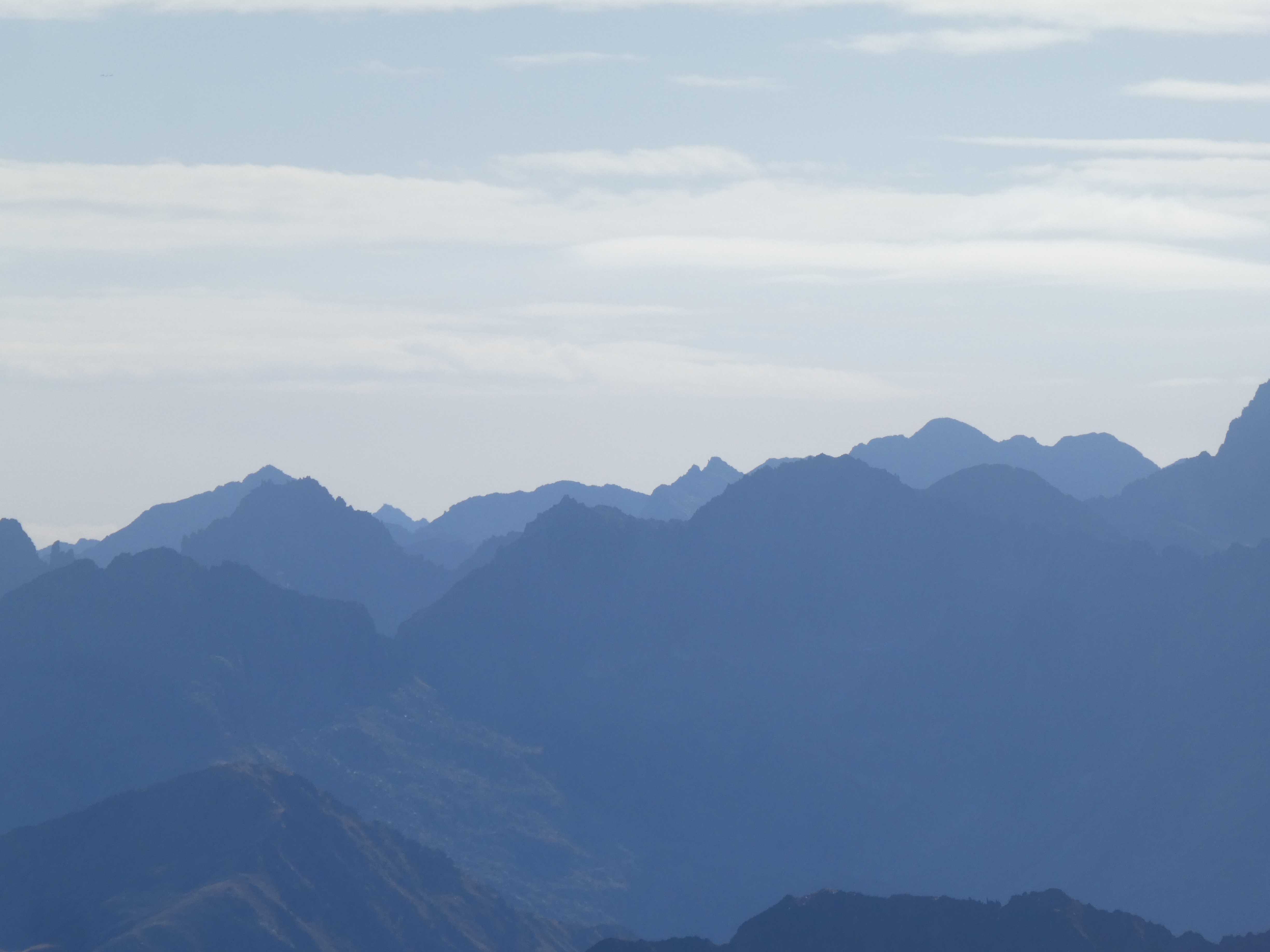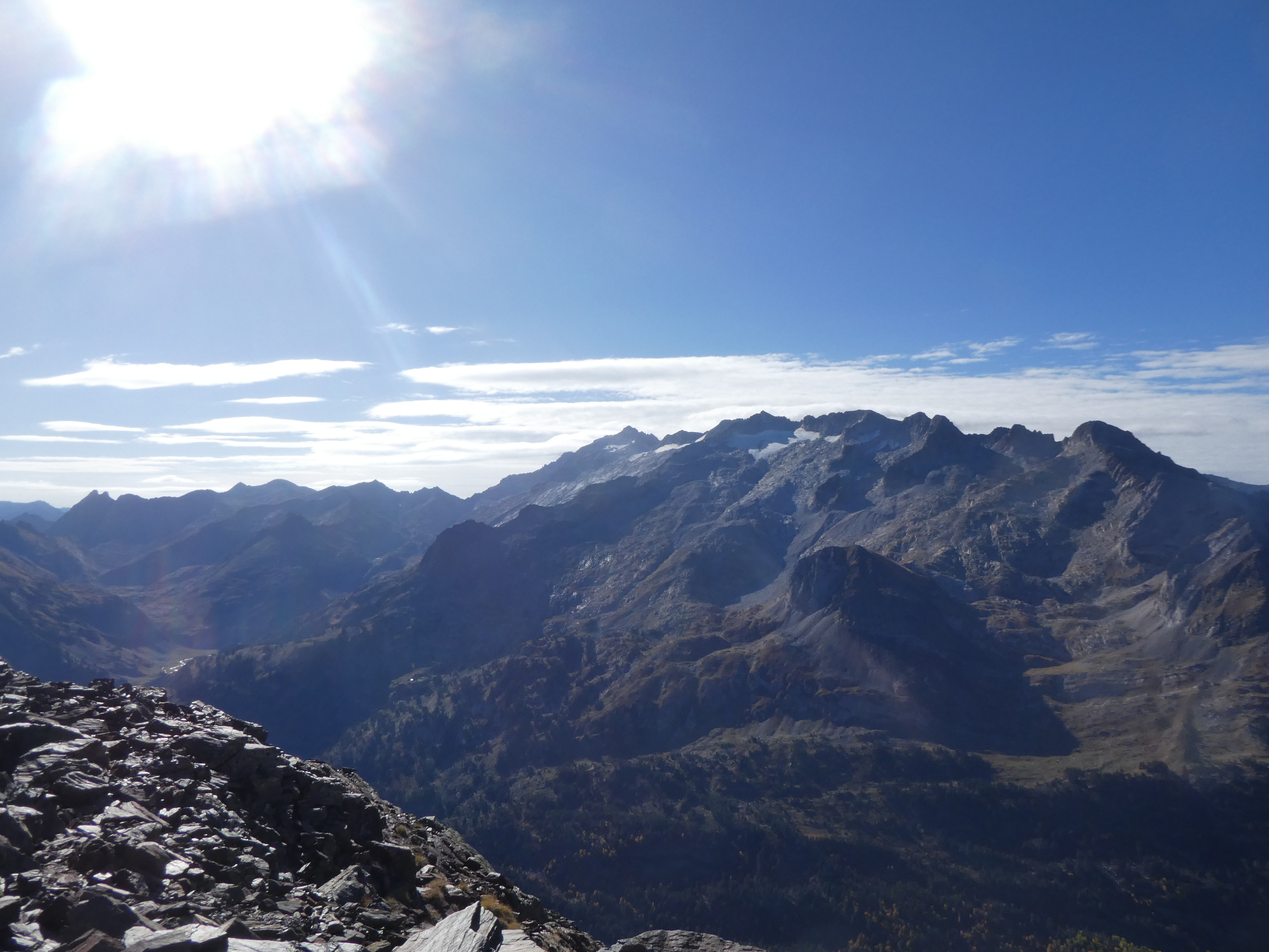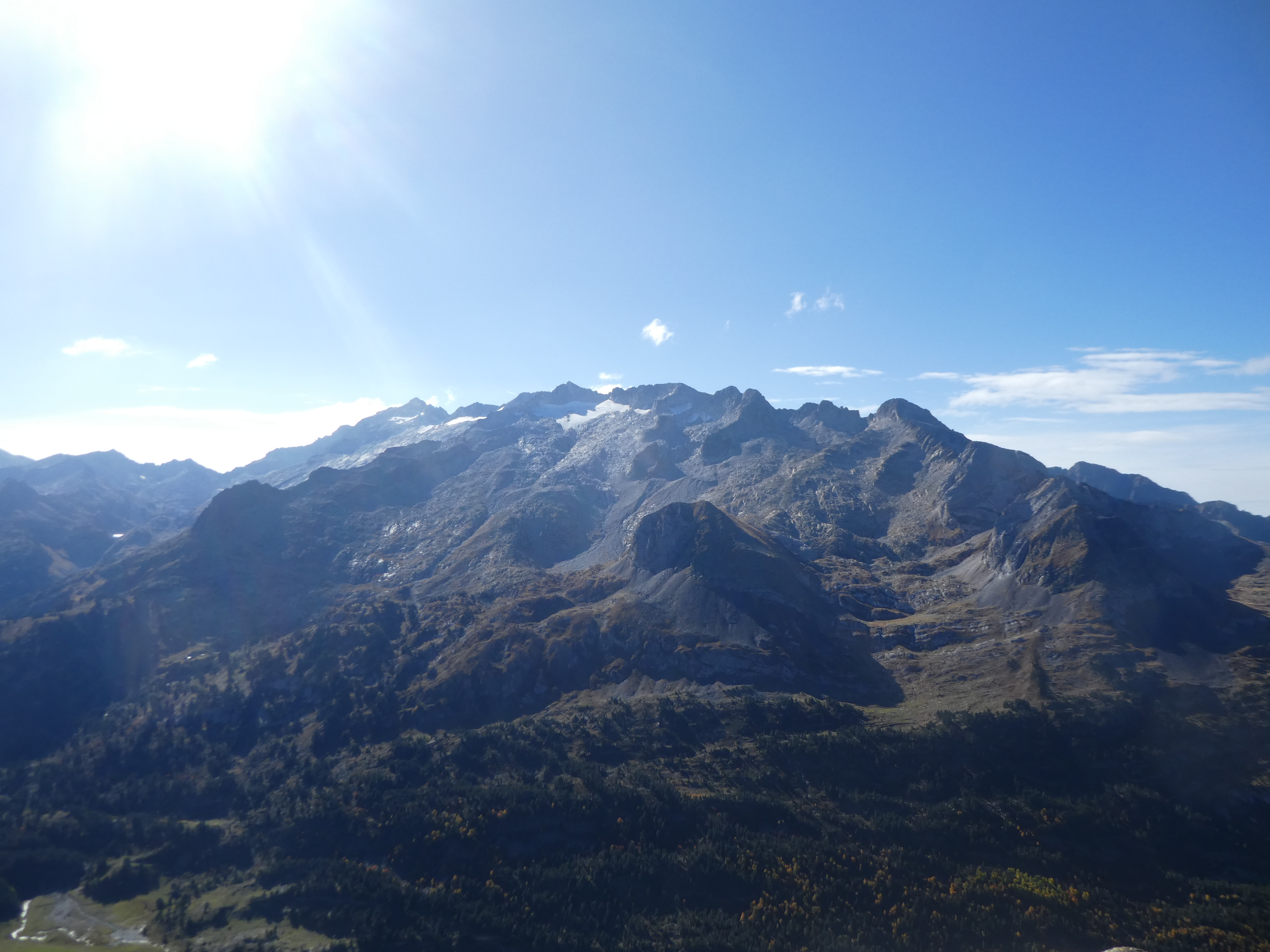 Zoom sur le Pic de Bassiero (2901 m) au centre-gauche, le Montardo (2833 m) au centre-droit et le Pui Pla (2829 m) à droite
