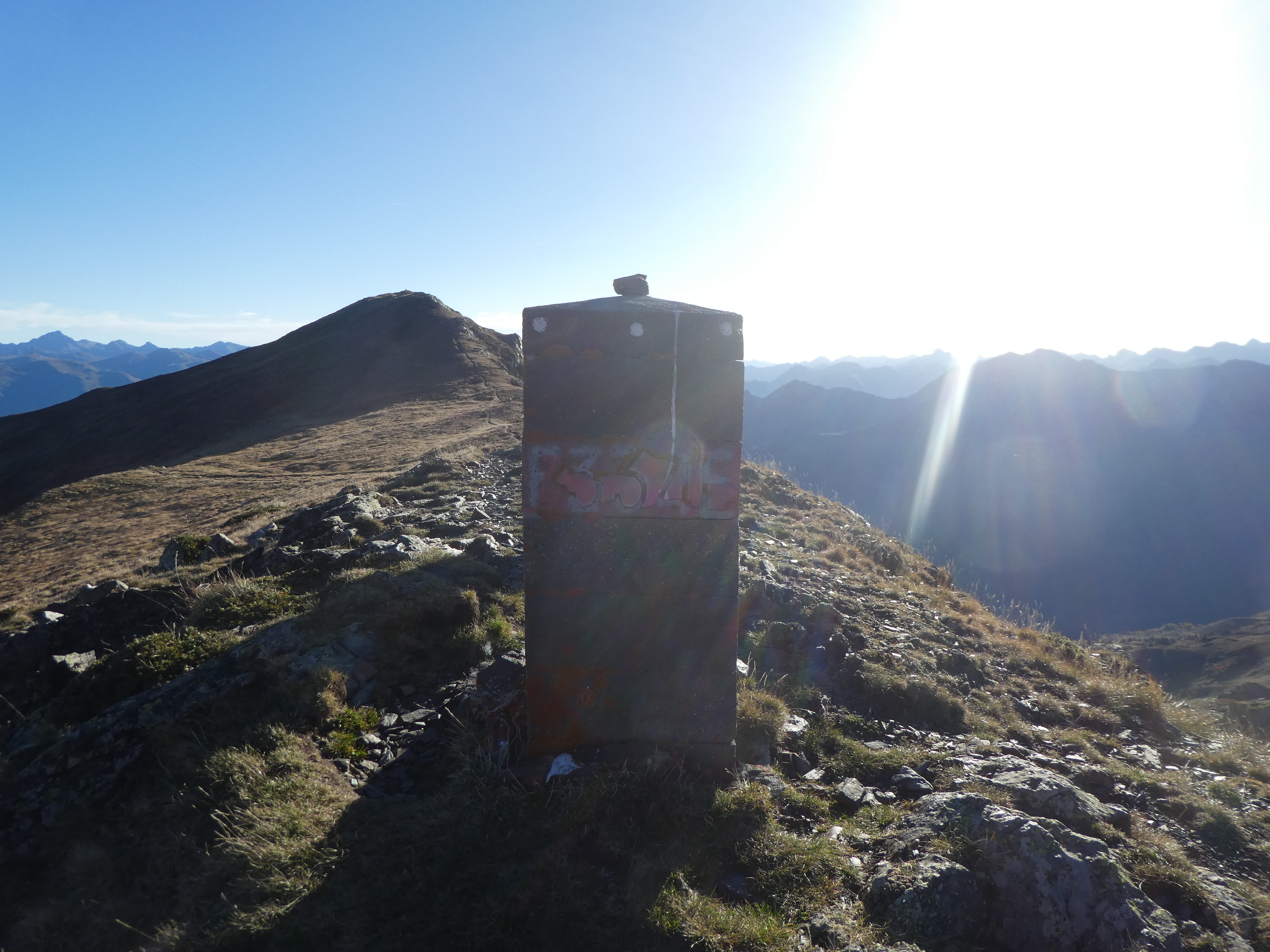 Arrivée au sommet du Pic de Sauvegarde ou Tuca de Salbaguardia ou encore Tuca de Cabellut (2738 m) : beau panorama sur les sommets des Pyrénées Haut-Garonnaises, de la Vallée d'Aure, de la Vallée de la Garonne, du Couserans, de la Haute-Ariège, du Val d'Aran, du Pallars Sobirà, du massif de l'Aneto, de la Ribagorza, du Sobrarbe ainsi que sur la plaine bigourdane, haut-garonnaise et ariégeoise