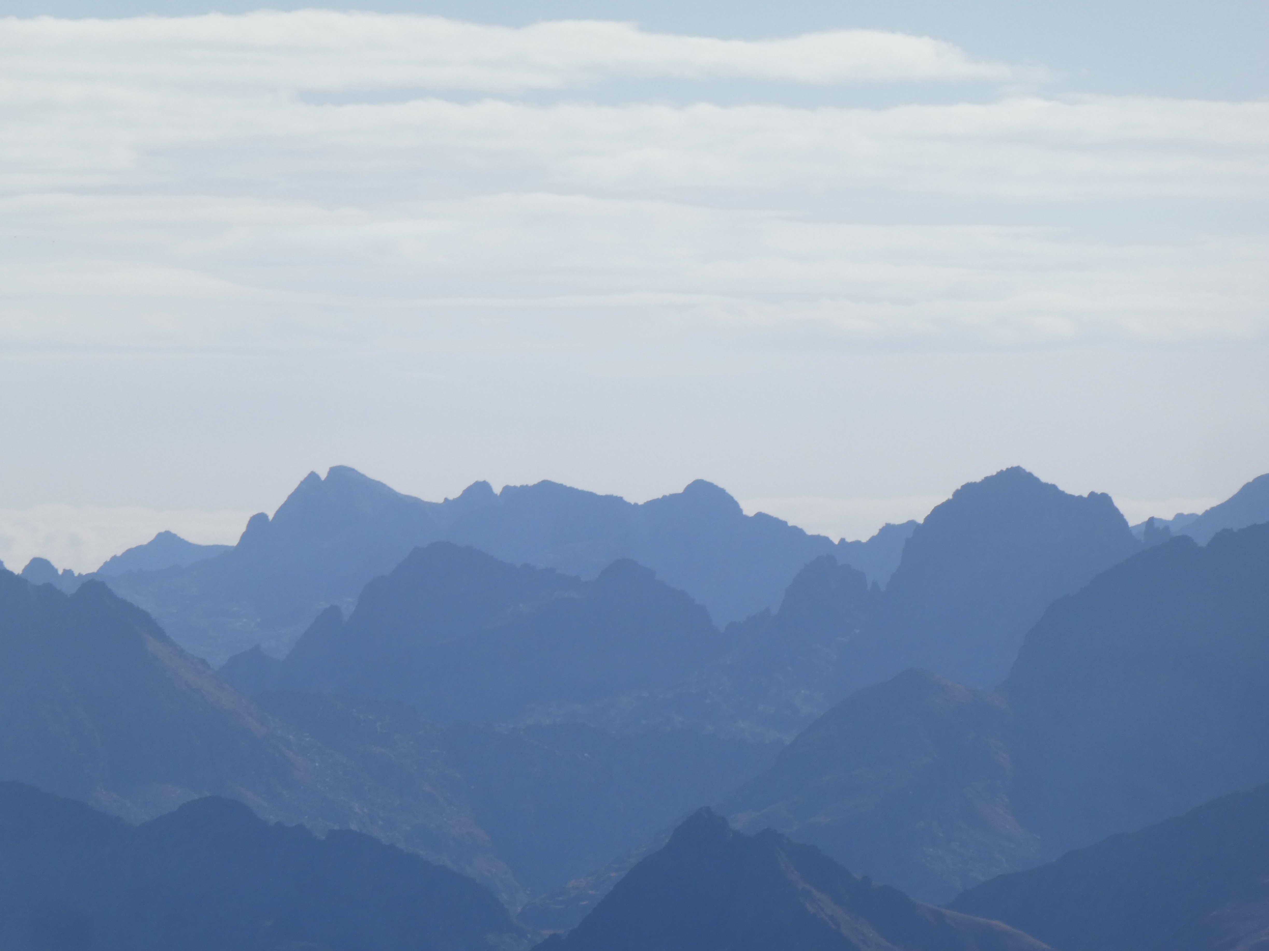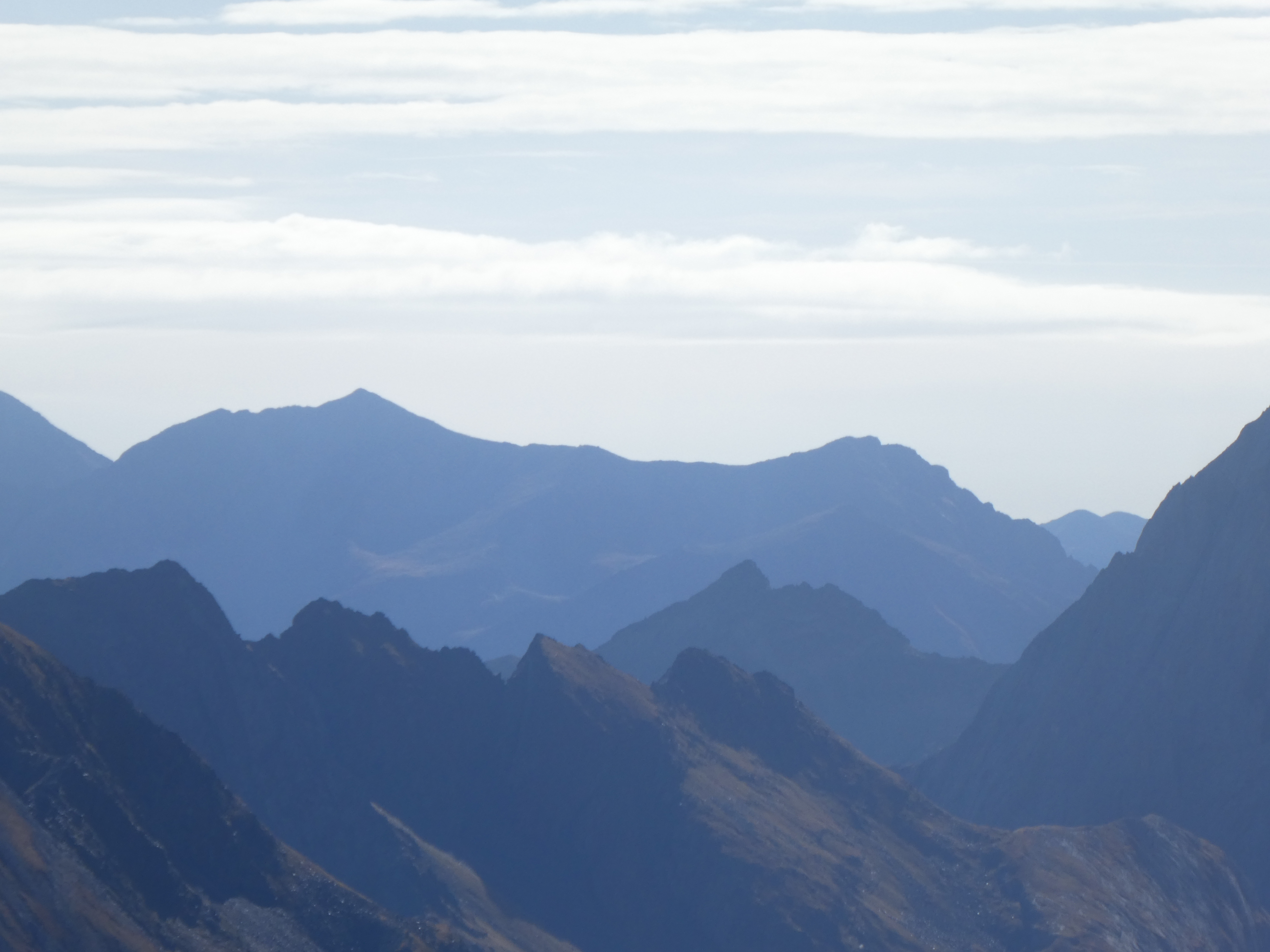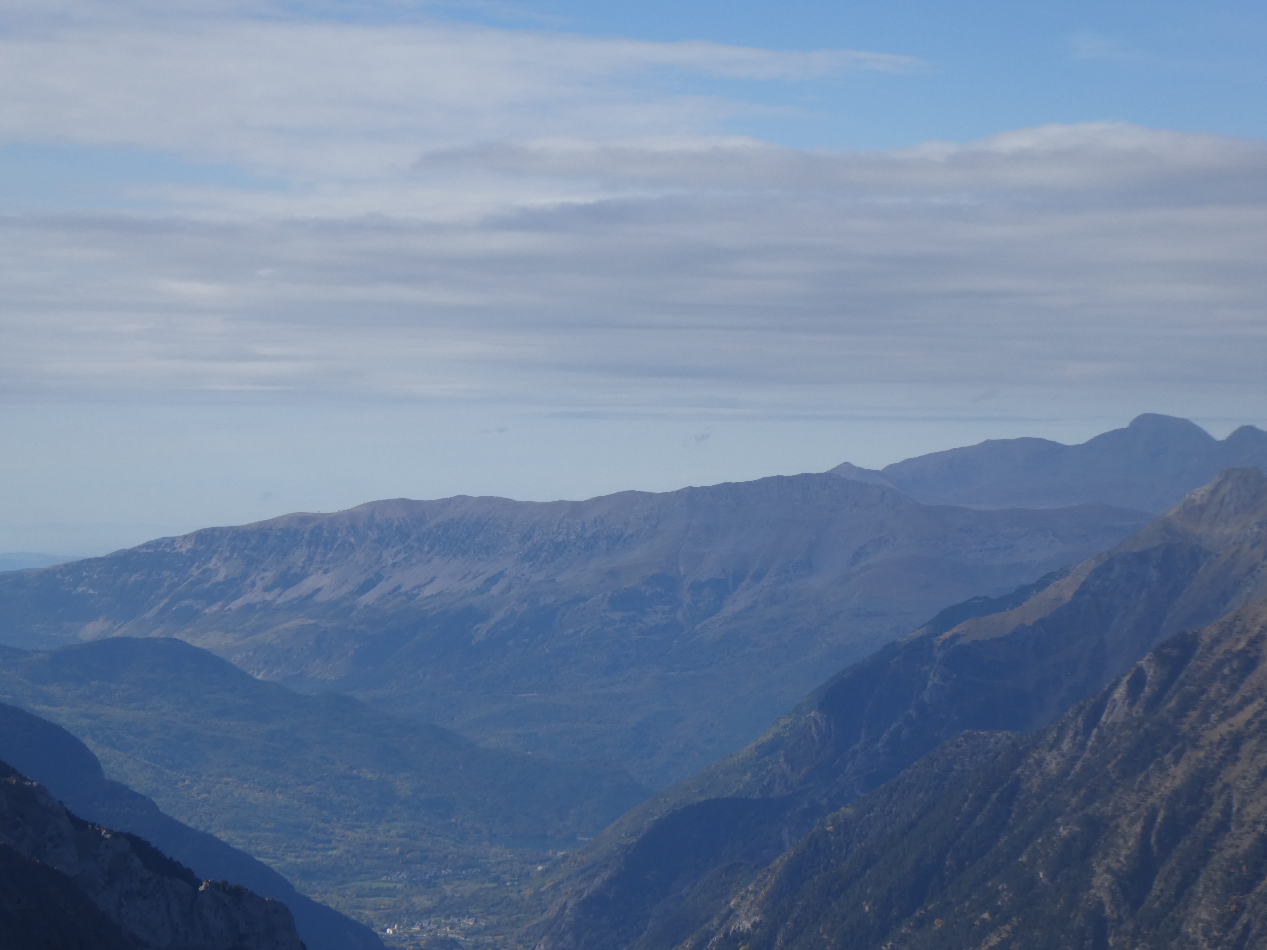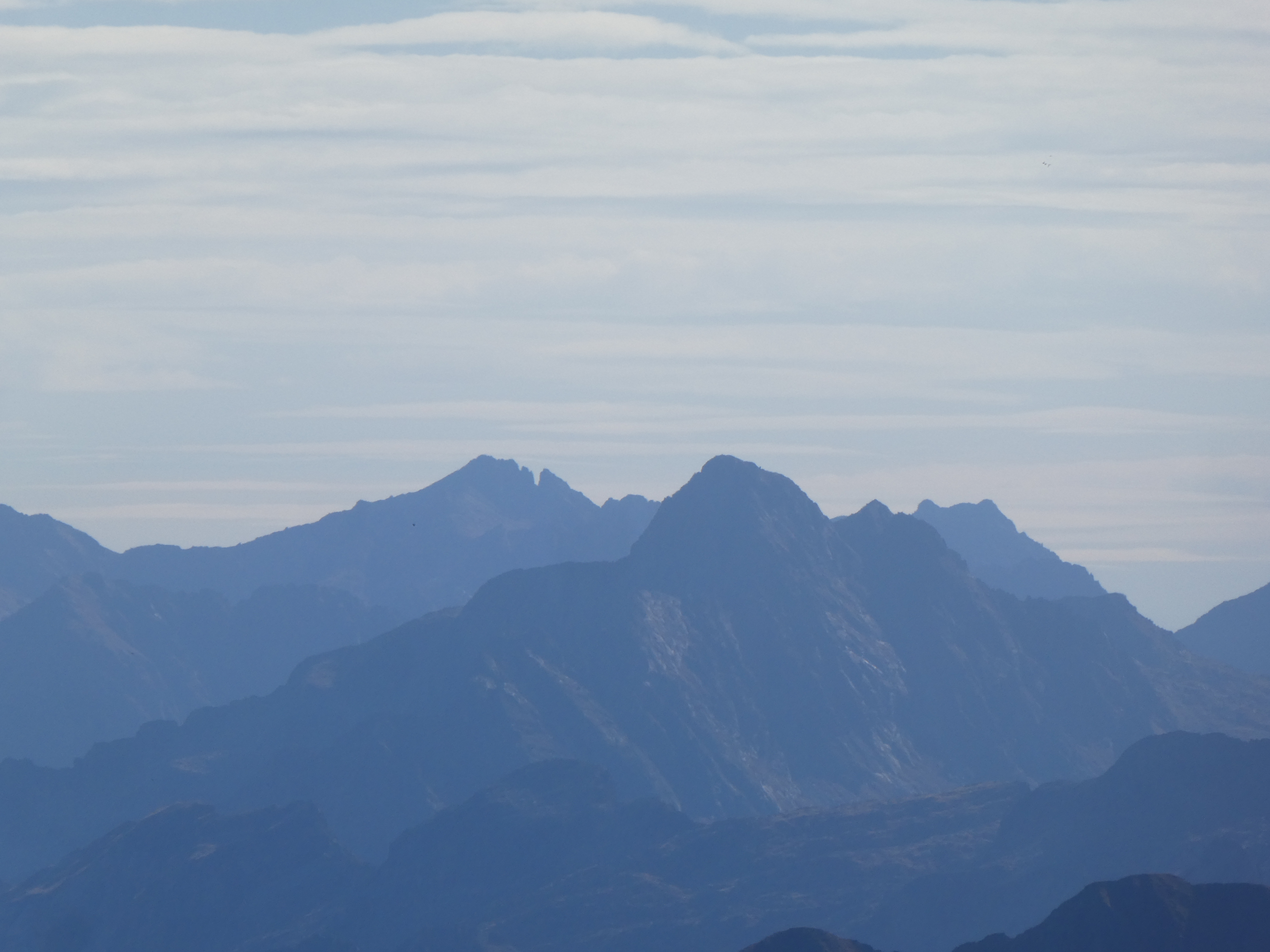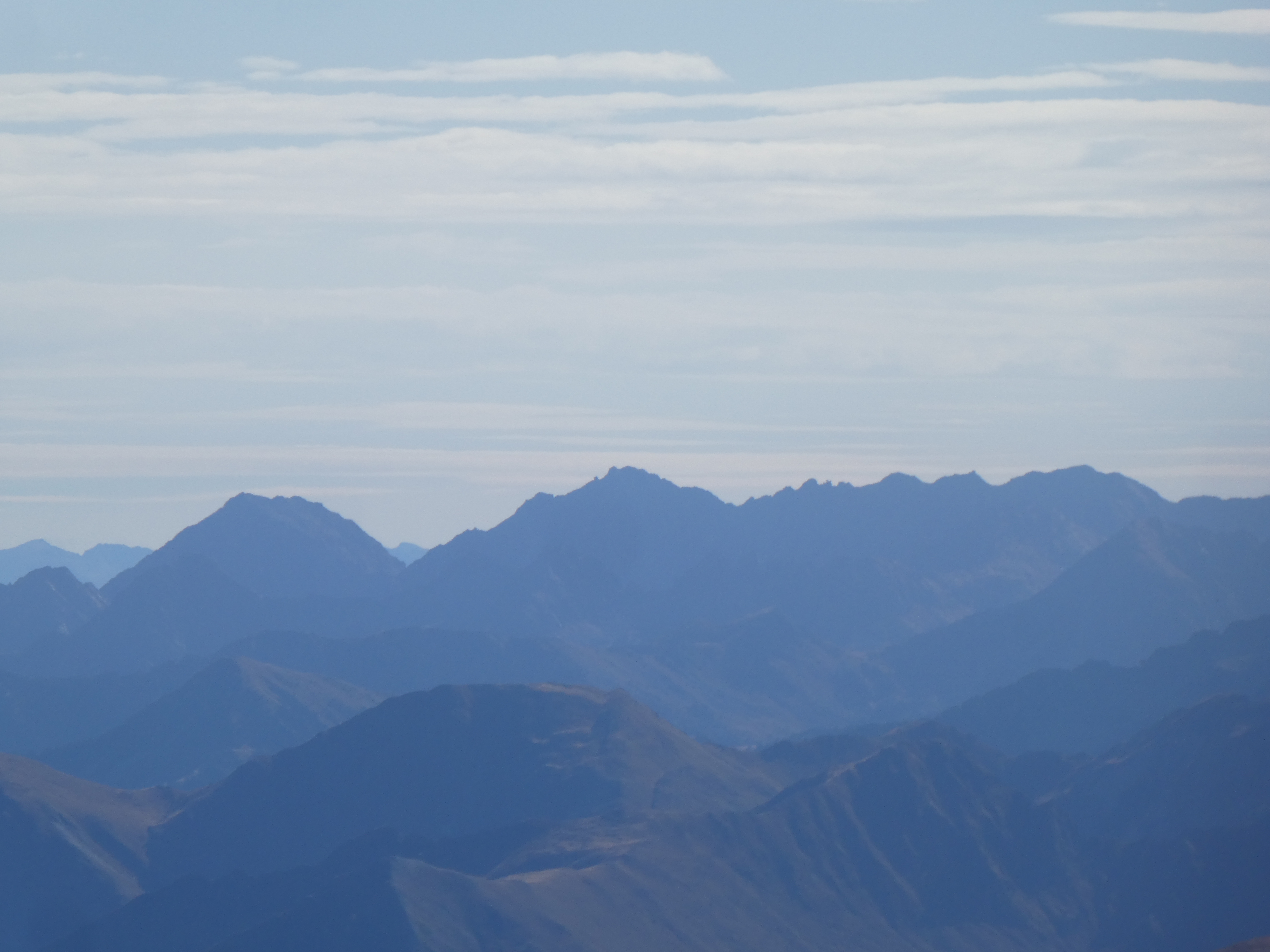Zoom sur le Pic de Douly (1635 m) à gauche, le Pic de Pouy Usclat (1755 m) au centre et le Mont Las (1729 m) à droite