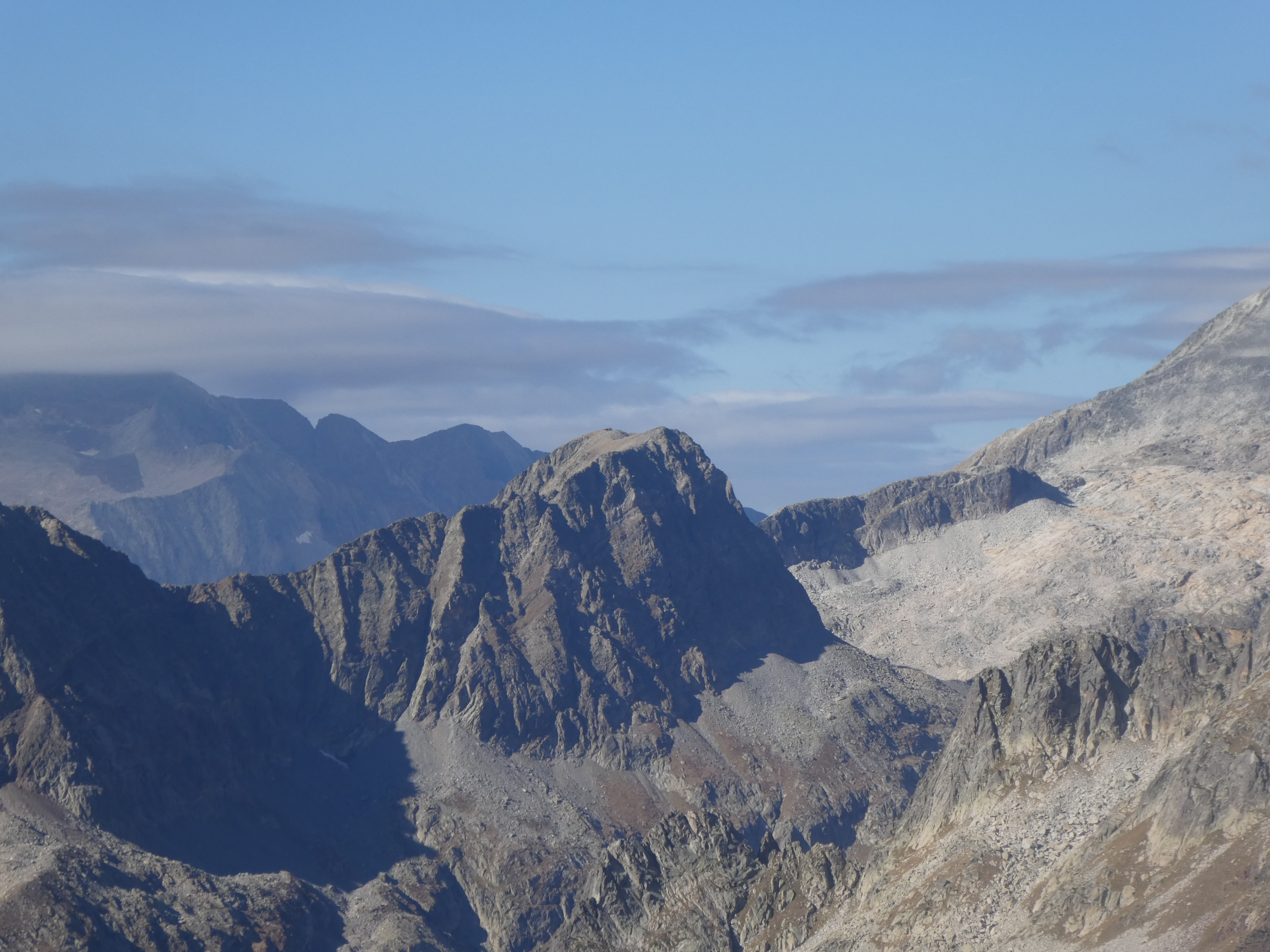 Zoom sur le Gran Tuc de Colomèrs (2933 m) au centre-gauche, le Creu de Colomèrs (2896 m) au centre et le Pa de Sucre (2864 m) à droite