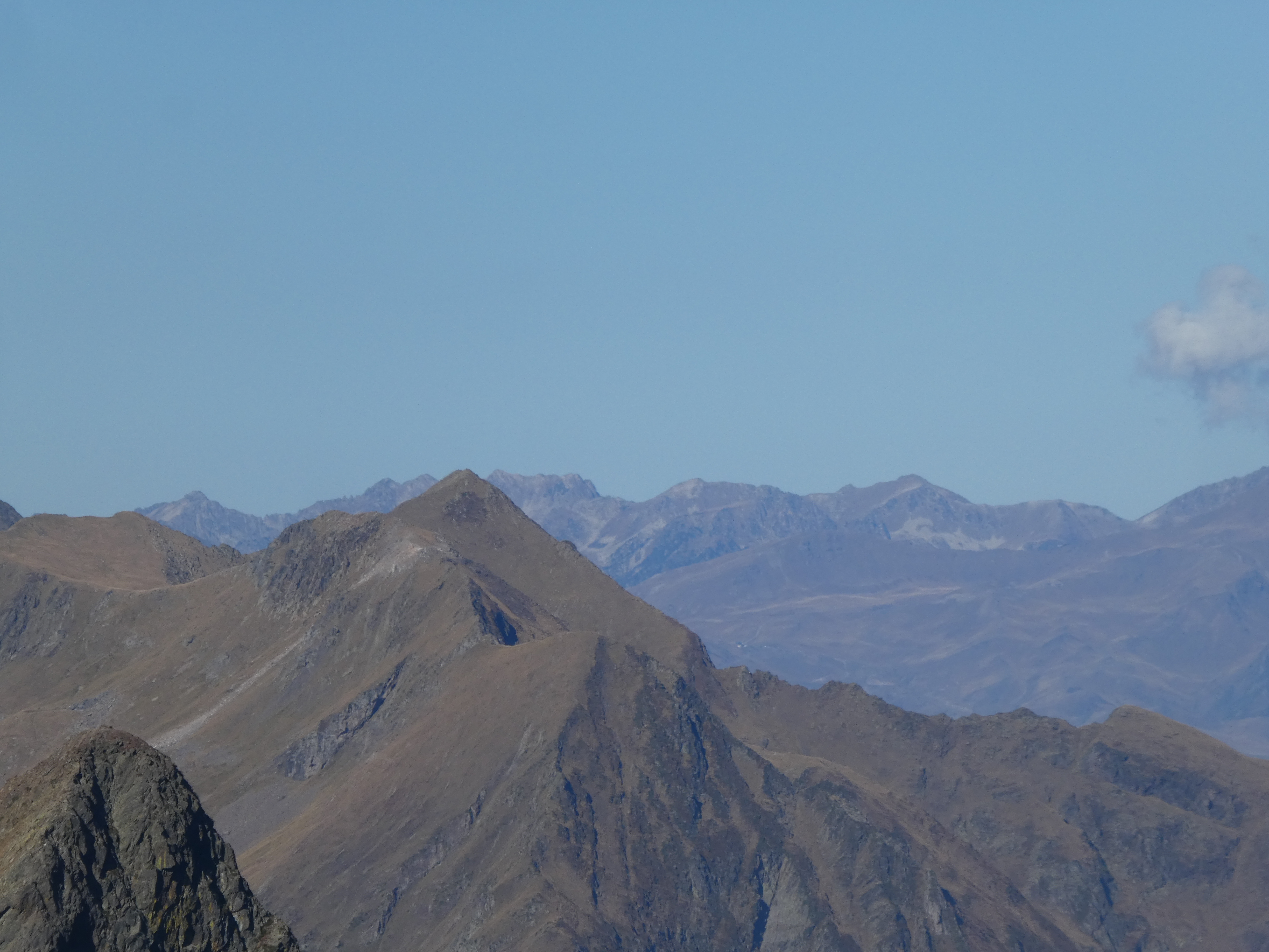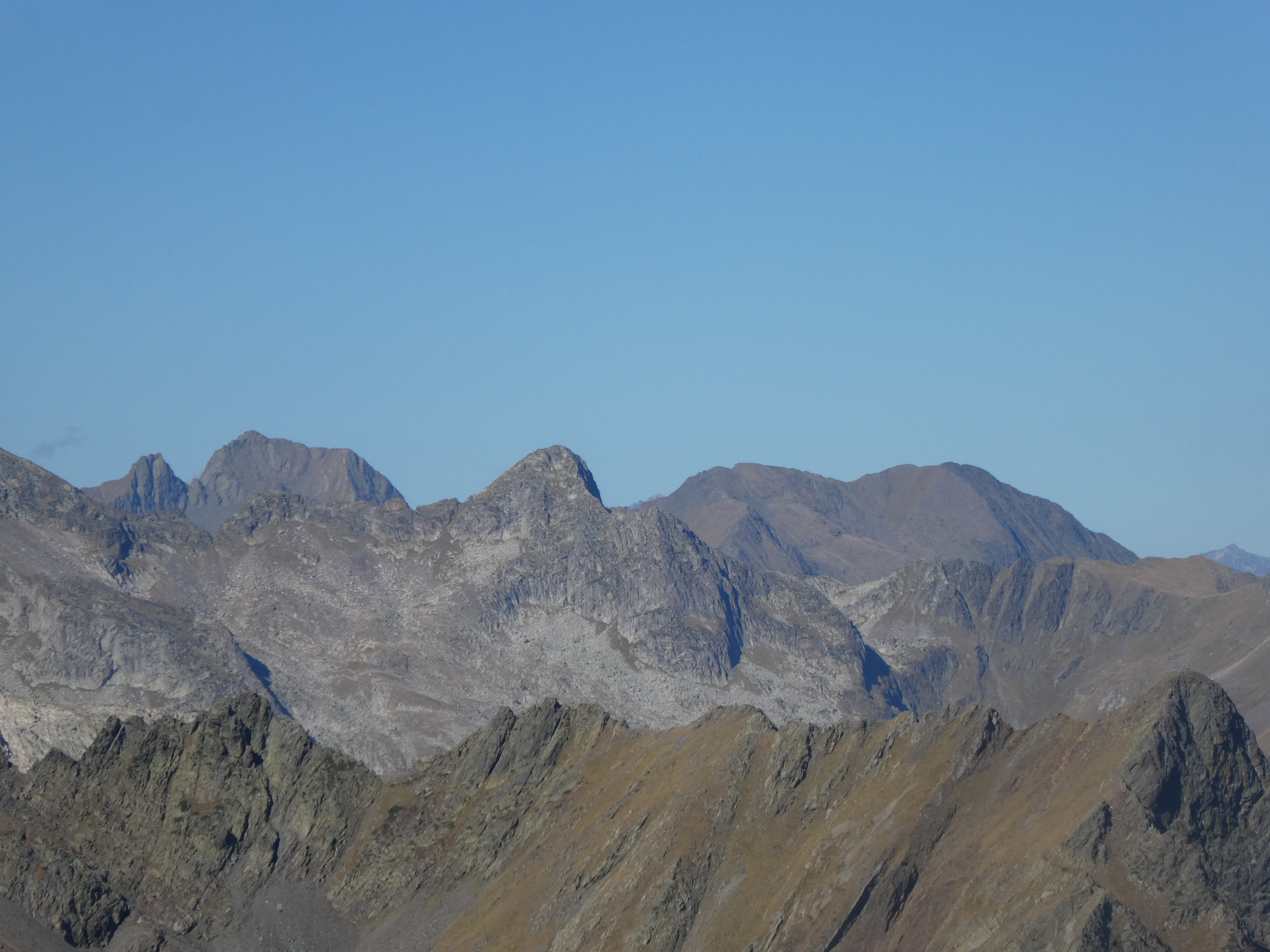Zoom sur le Pic de Barlonguère (2802 m) à gauche, le Mont Valier (2738 m) et le Mont du Petit Valier (2736 m) au centre-droit, et le Pic des Trois Comtes (2689 m) et le Pic de la Pale de Clauère (2679 m) à droite