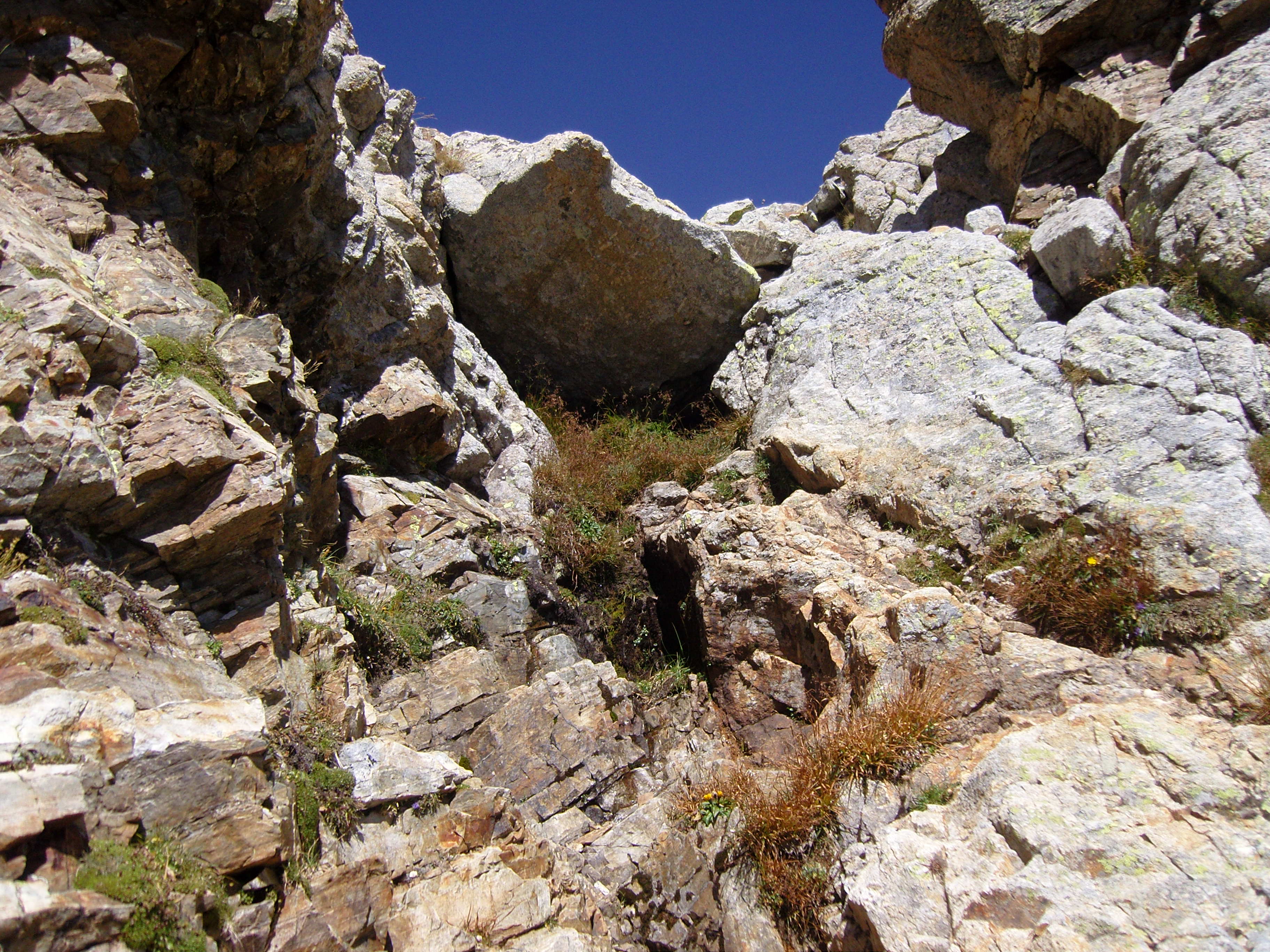 Au sommet de la cheminée, ne pas essayer d'escalader ce rocher trop dangereux : redescendre de 2 ou 3 mètres et quitter le couloir de la cheminée sur la gauche (petit cairn) pour contourner cette difficulté direction Pic des Spijeoles