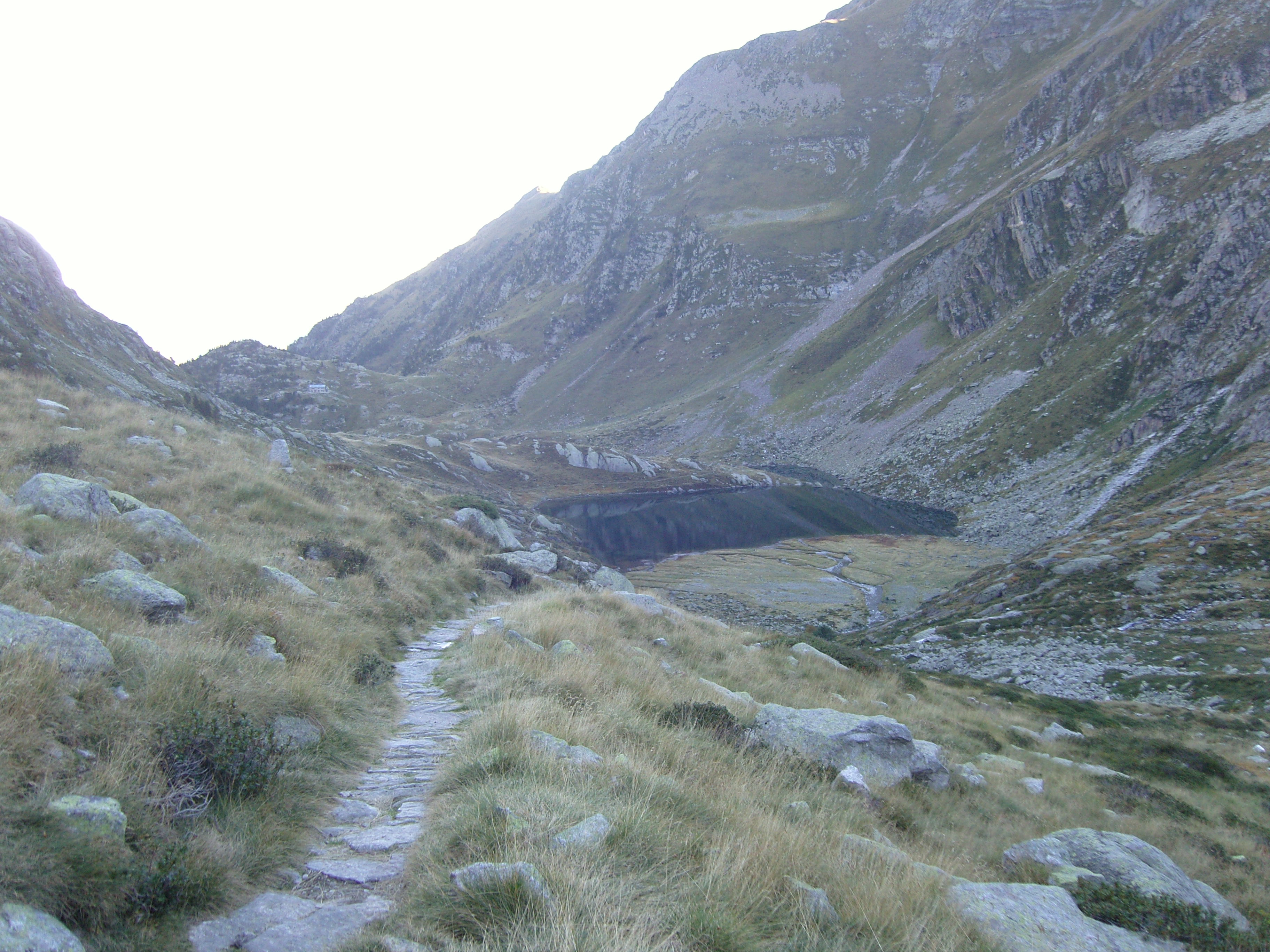 Lac Saussat (1929 m) : longer le lac sur la droite (sentier recouvert de pierres encastrées de façon régulière) direction Coume de l'Abesque
