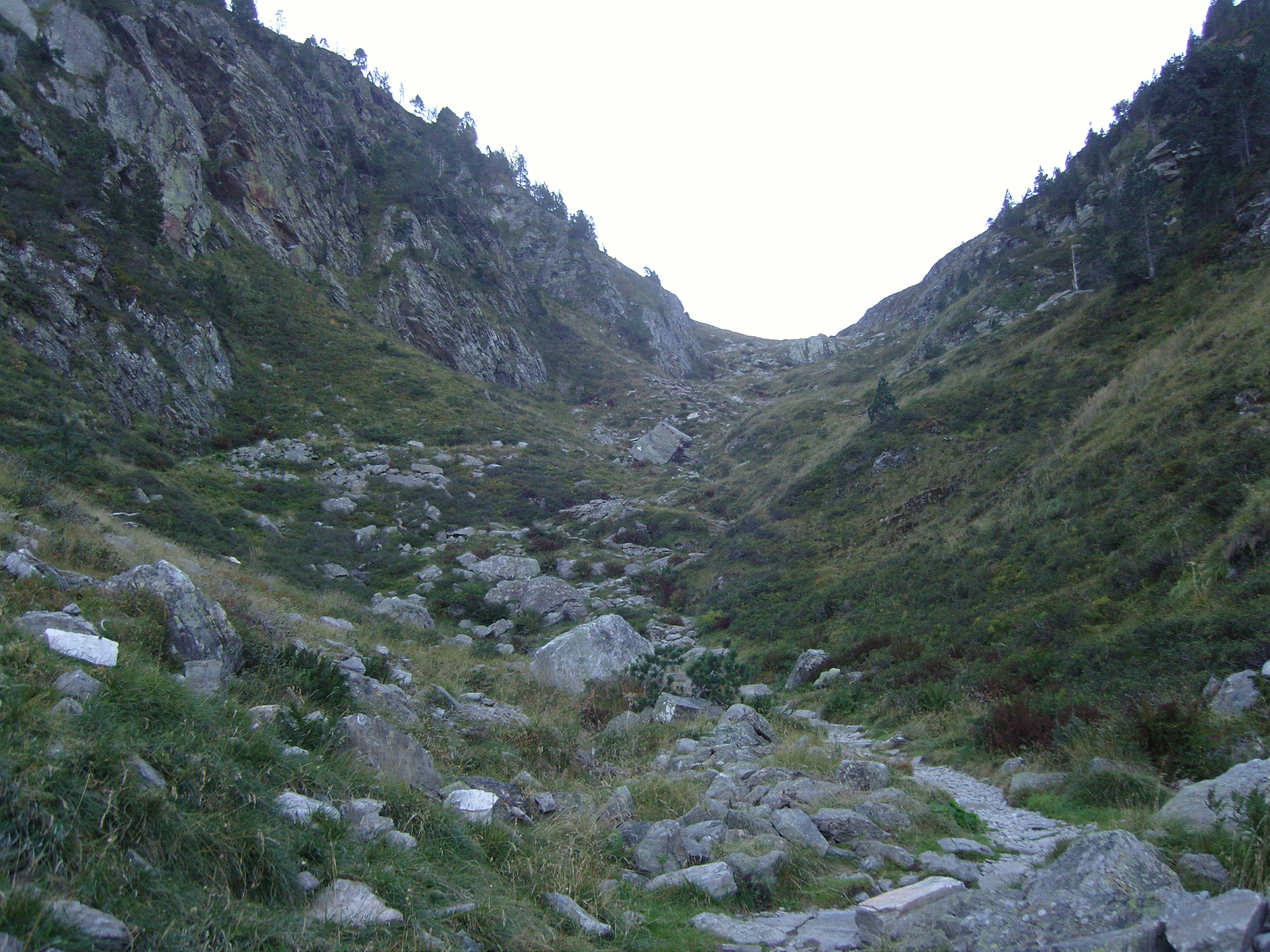 Croisement GR 10 / HRP (1952 m) : continuer à monter le vallon tout droit direction Lac d'Espingo, aucun balisage dorénavant mais sentier bien tracé (le chemin de gauche part vers Superbagnères)