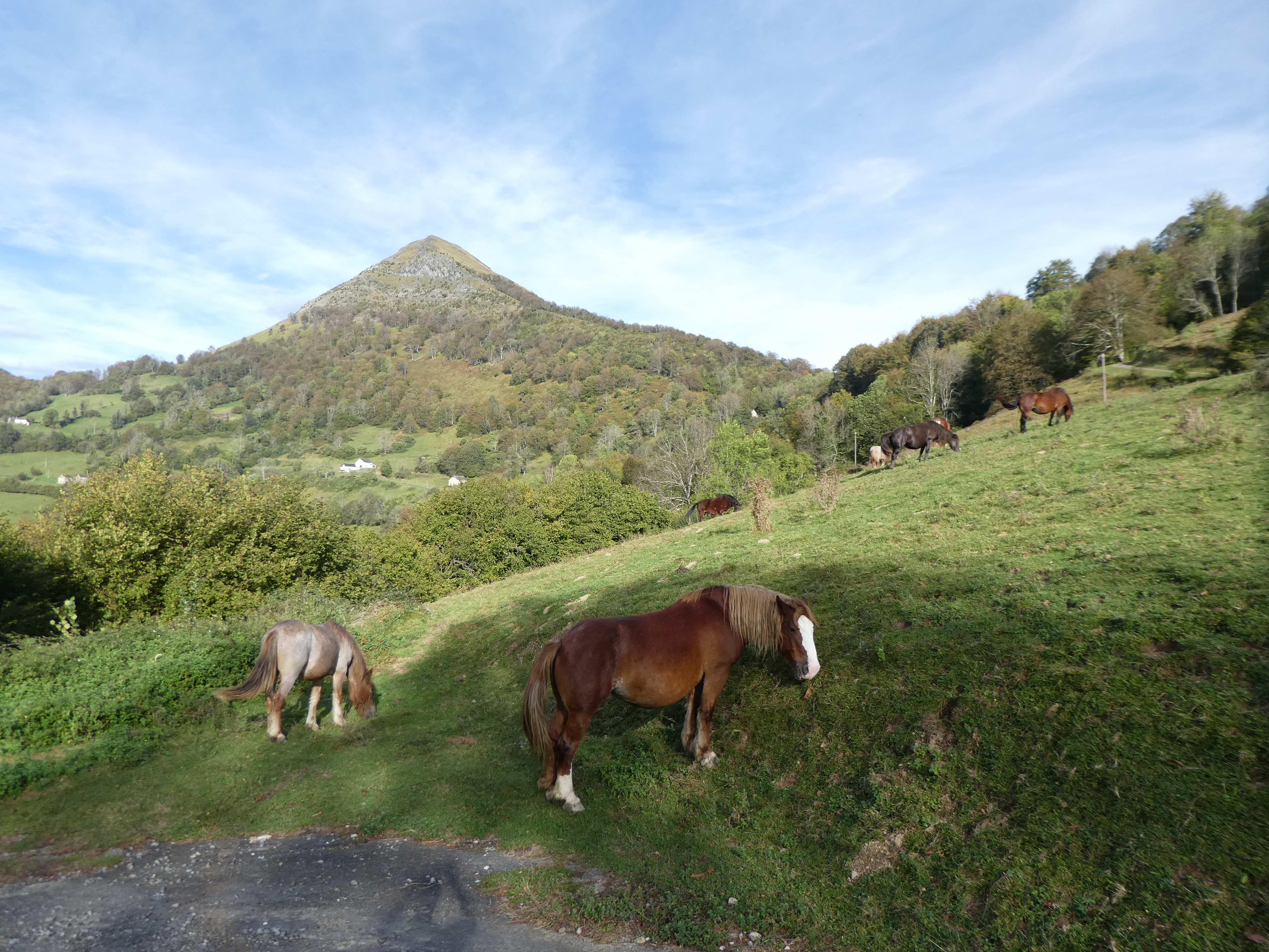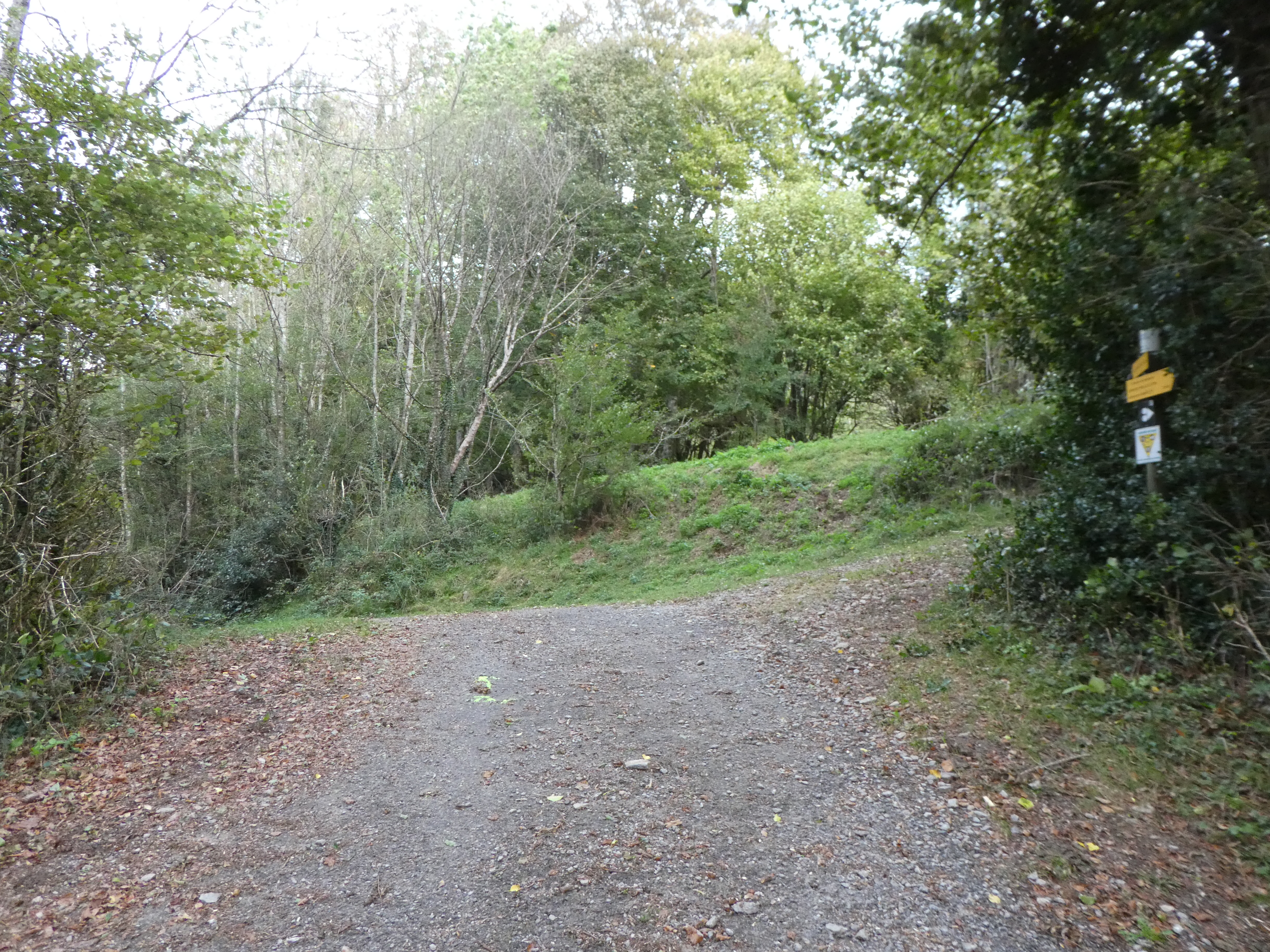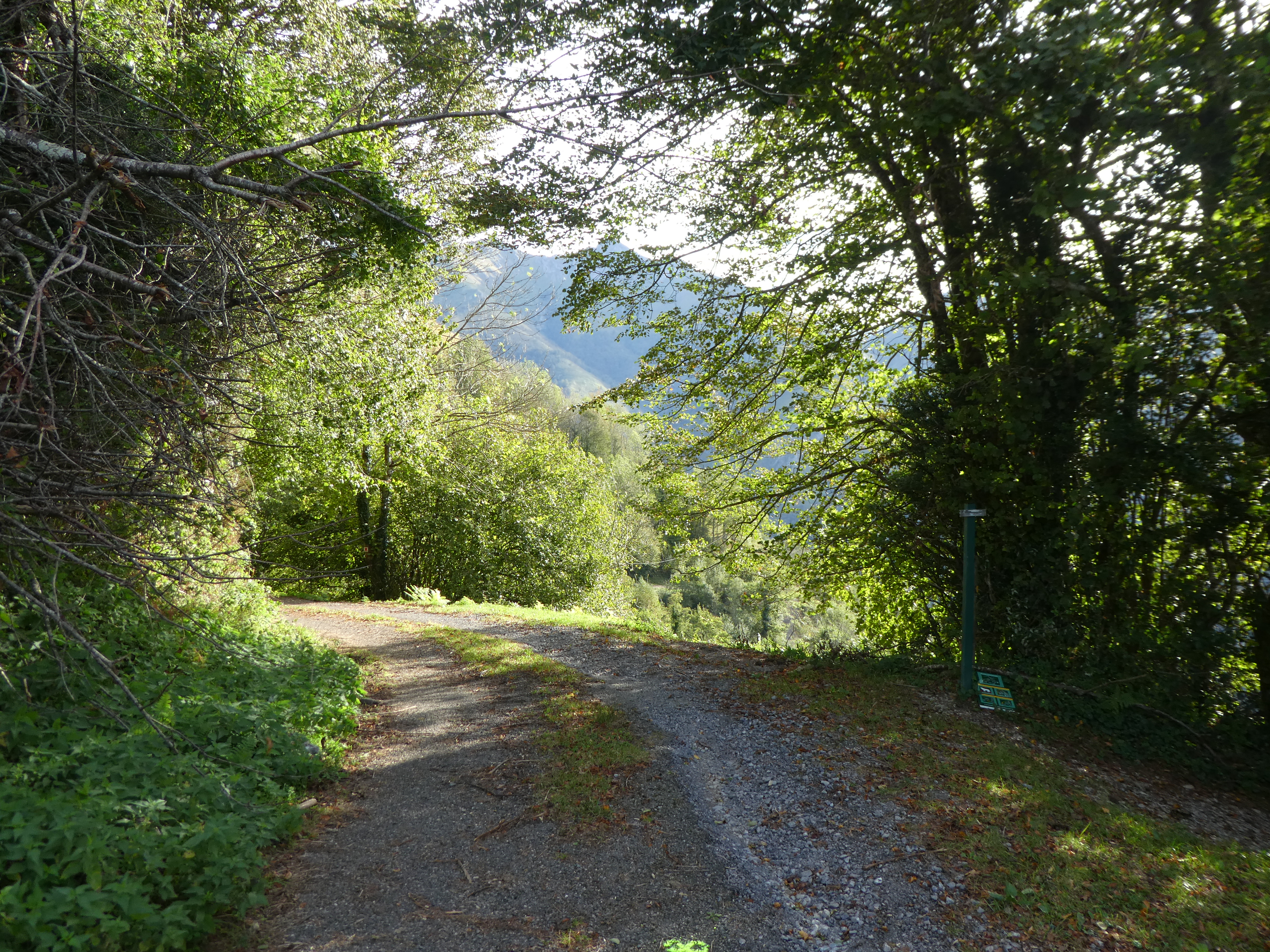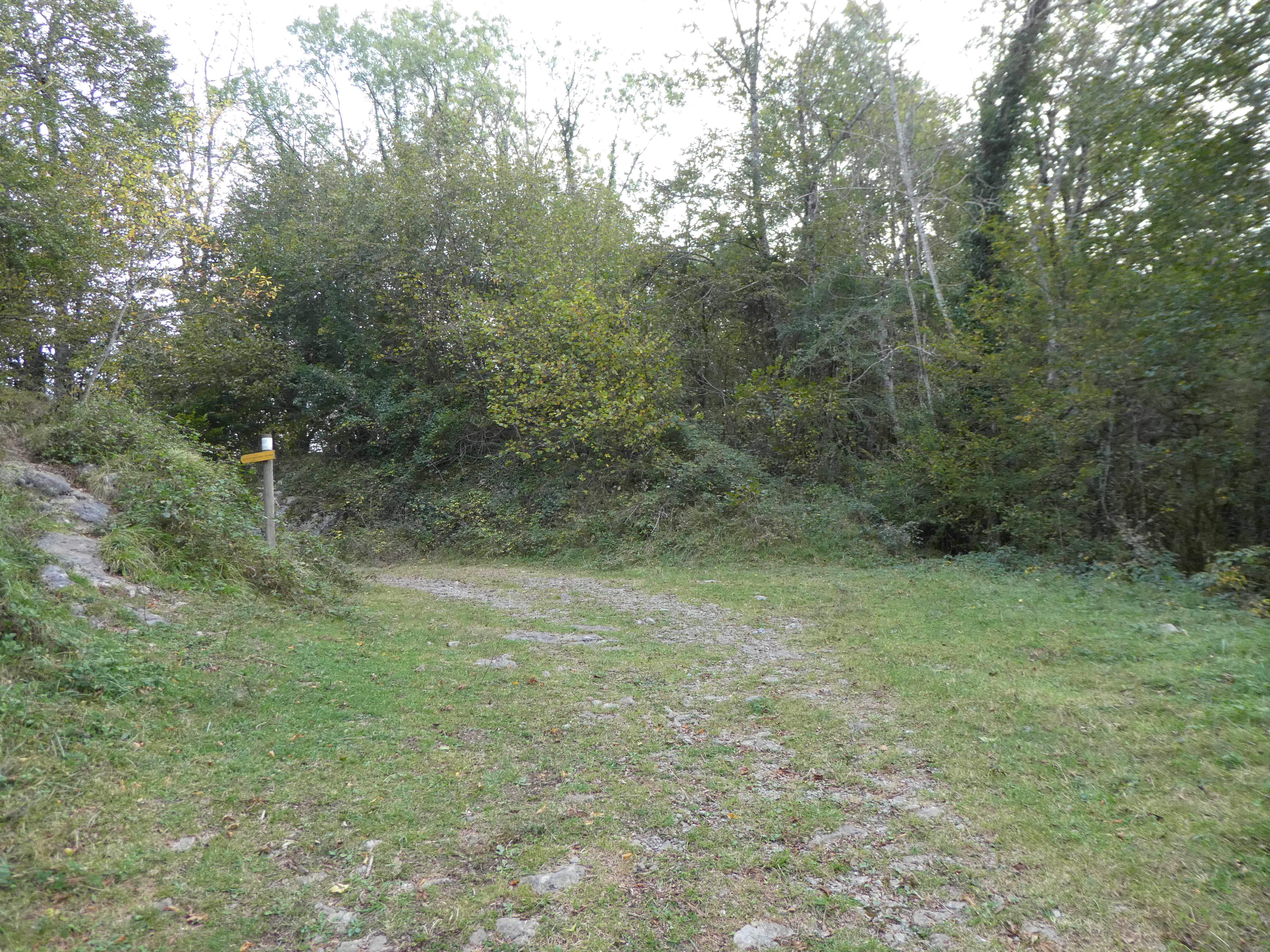Haut de Pélut (843 m) : suivre le large chemin partant sur la droite direction Sarrance, balisé en jaune (ceux qui auraient commencé la randonnée au parking du Haut de Pélut, terminus !)