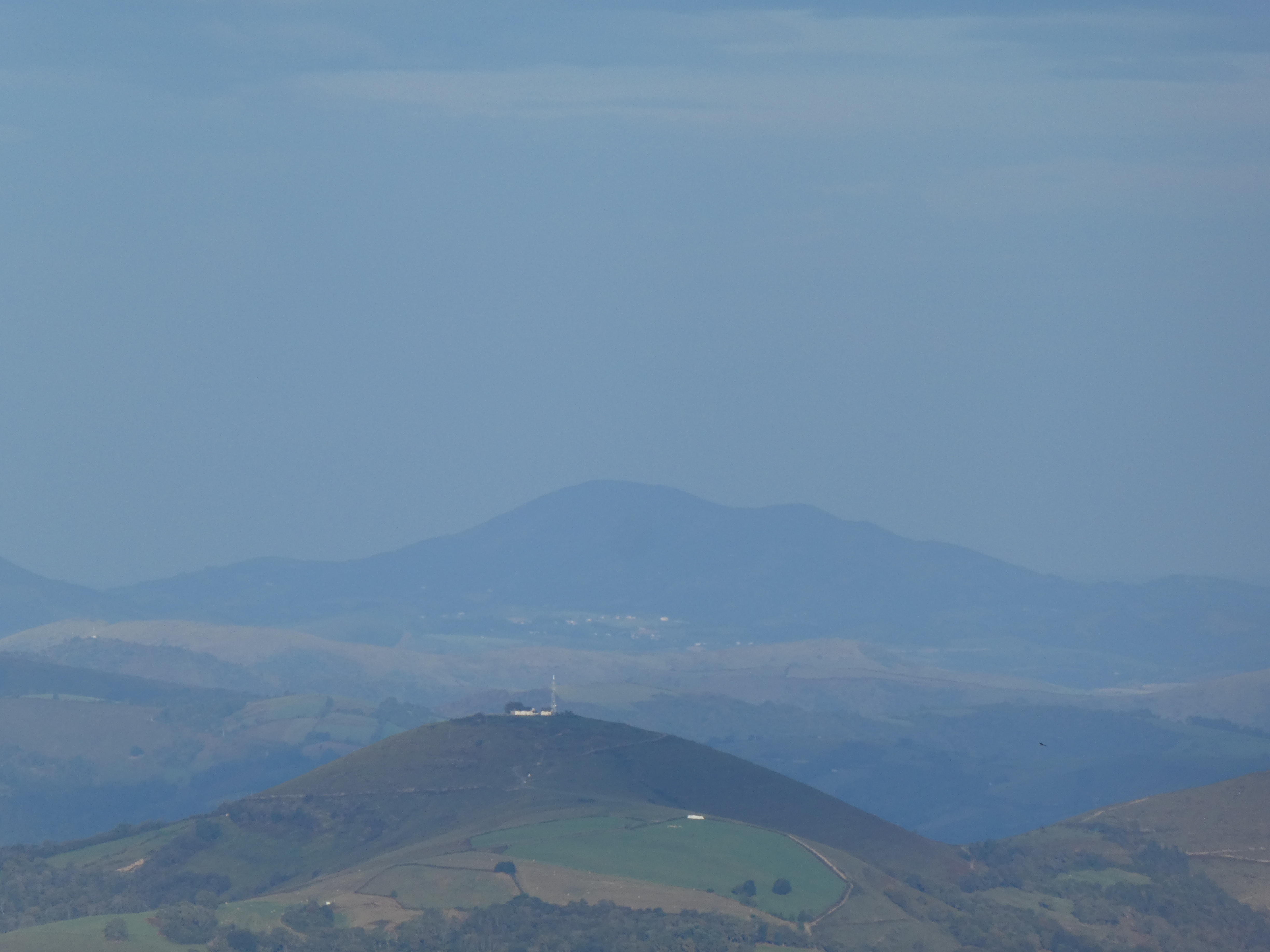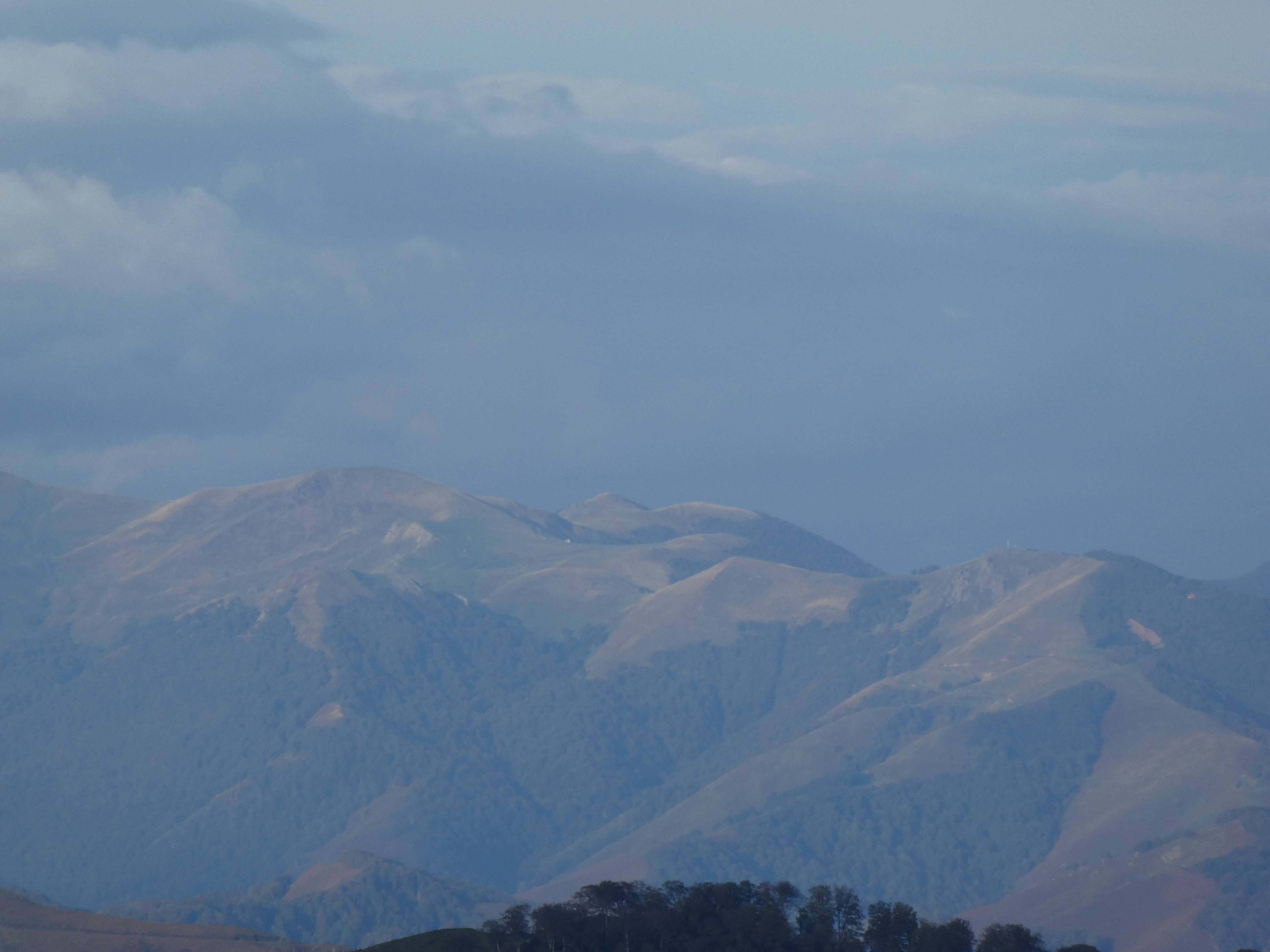 Zoom sur le massif de l'Adartza avec le Balbieta (1134 m) à gauche, le Mendimotxa (1227 m) au centre et l'Adartza (1247 m) à droite