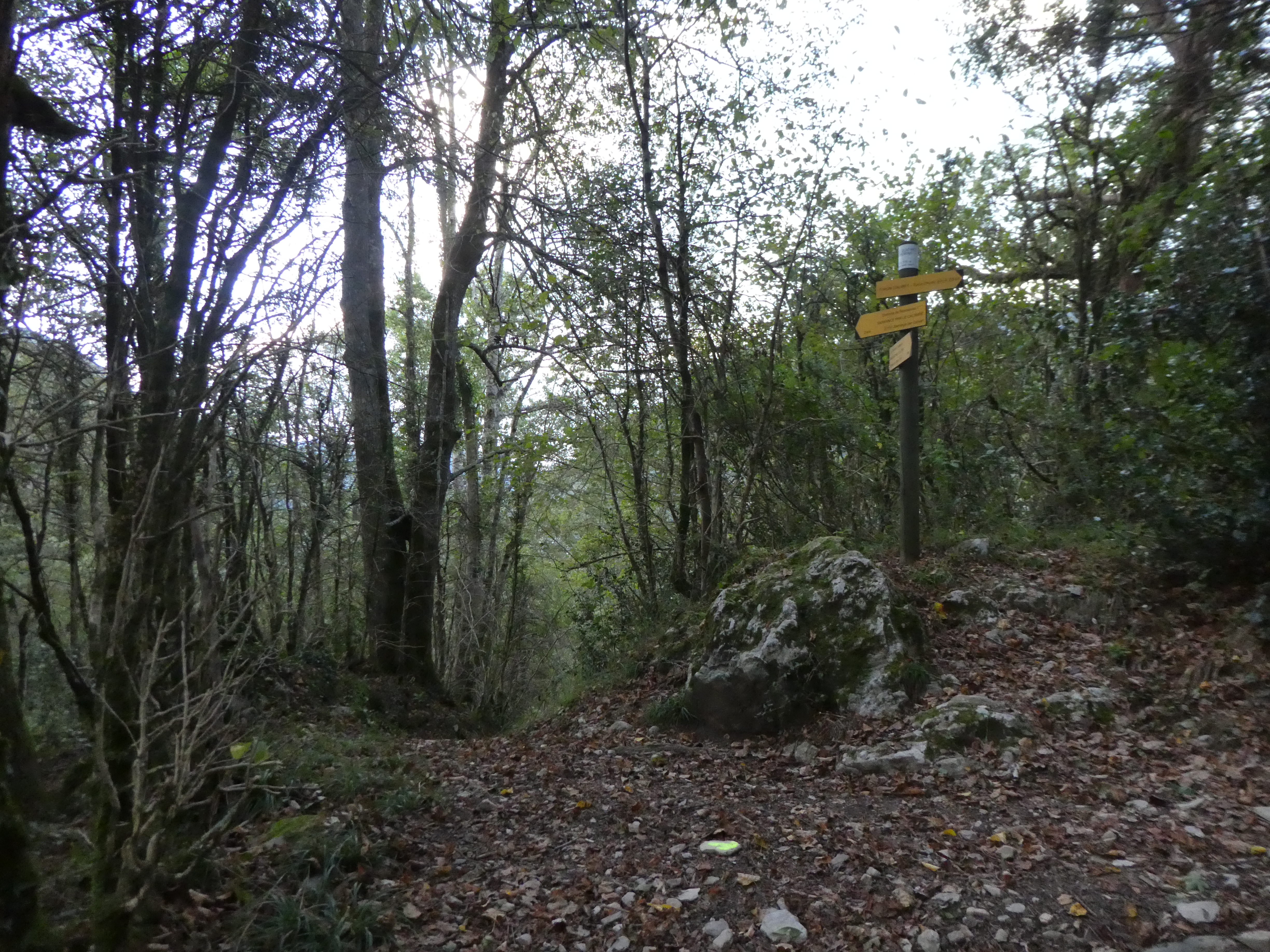 Les Quatre Chemins (576 m) : suivre le chemin montant sur la droite direction direction le Trône du Roi, balisé en jaune (le chemin partant tout droit redescend sur Sarrance)