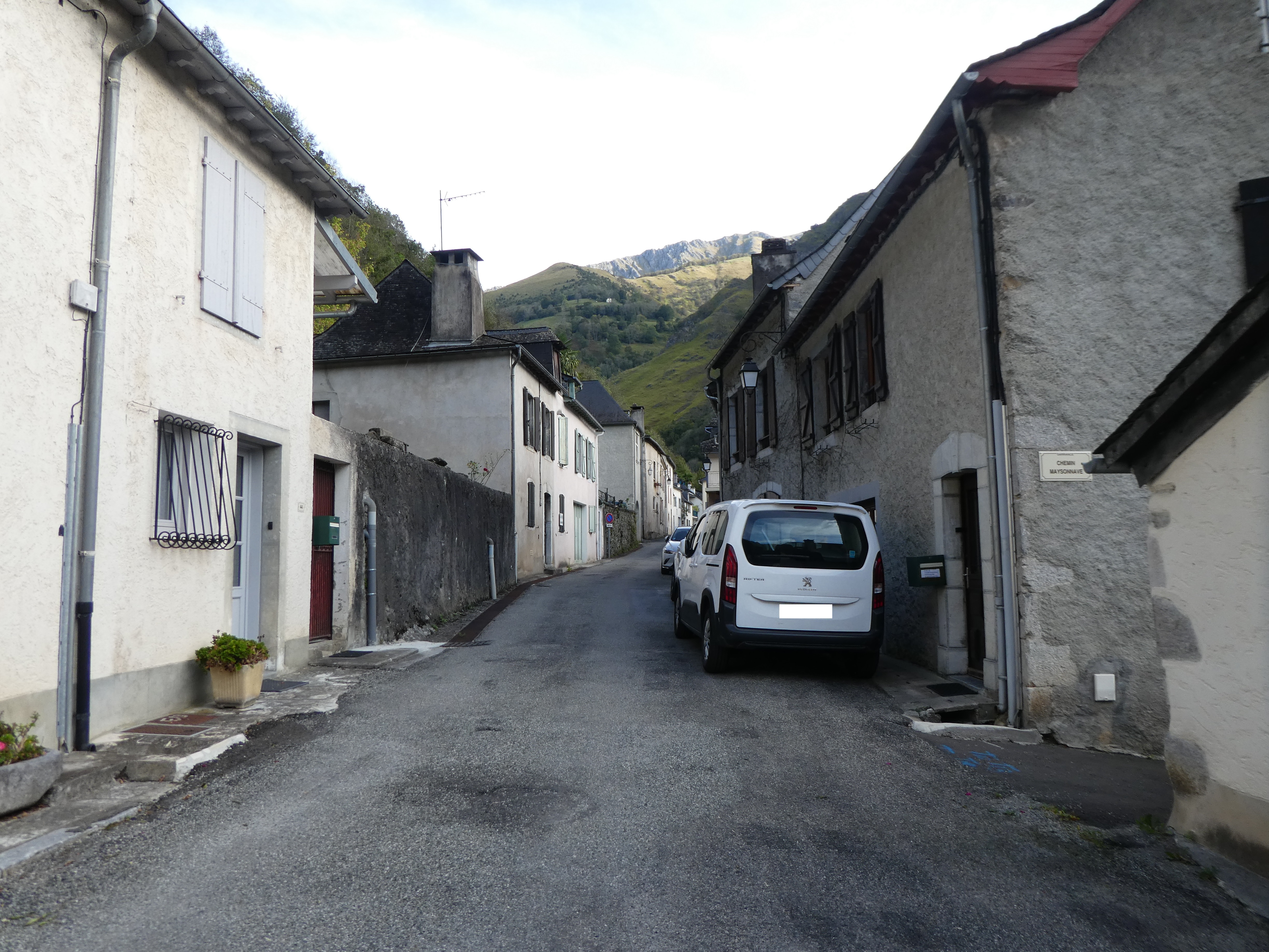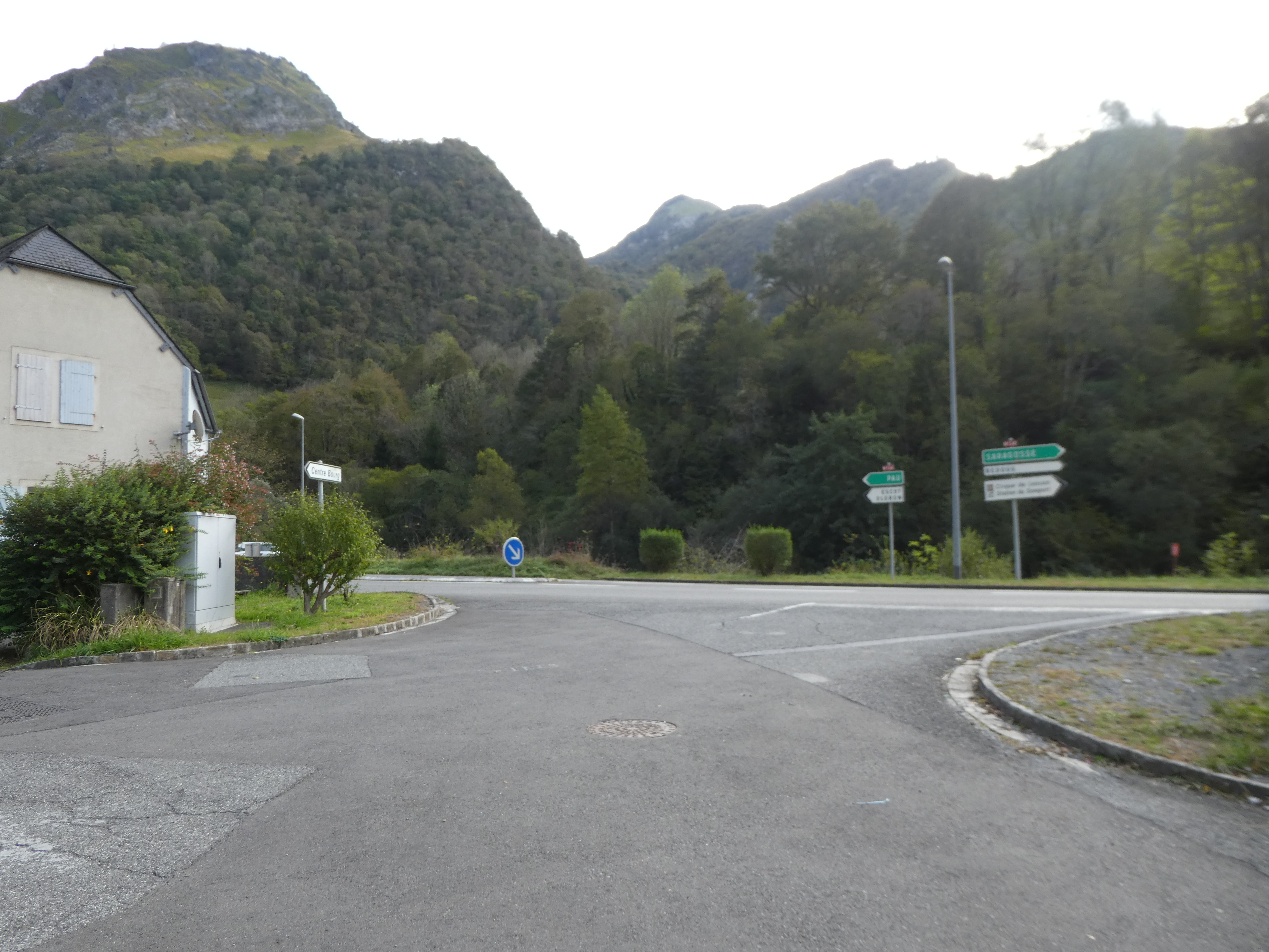 A cette intersection avec la ruelle menant directement au parking de départ (50 mètres après le lieu-dit "Sarrance - Cloître"), suivre cette dernière sur la droite (Chemin Maysonnave) direction Sarrance, aucun balisage dorénavant