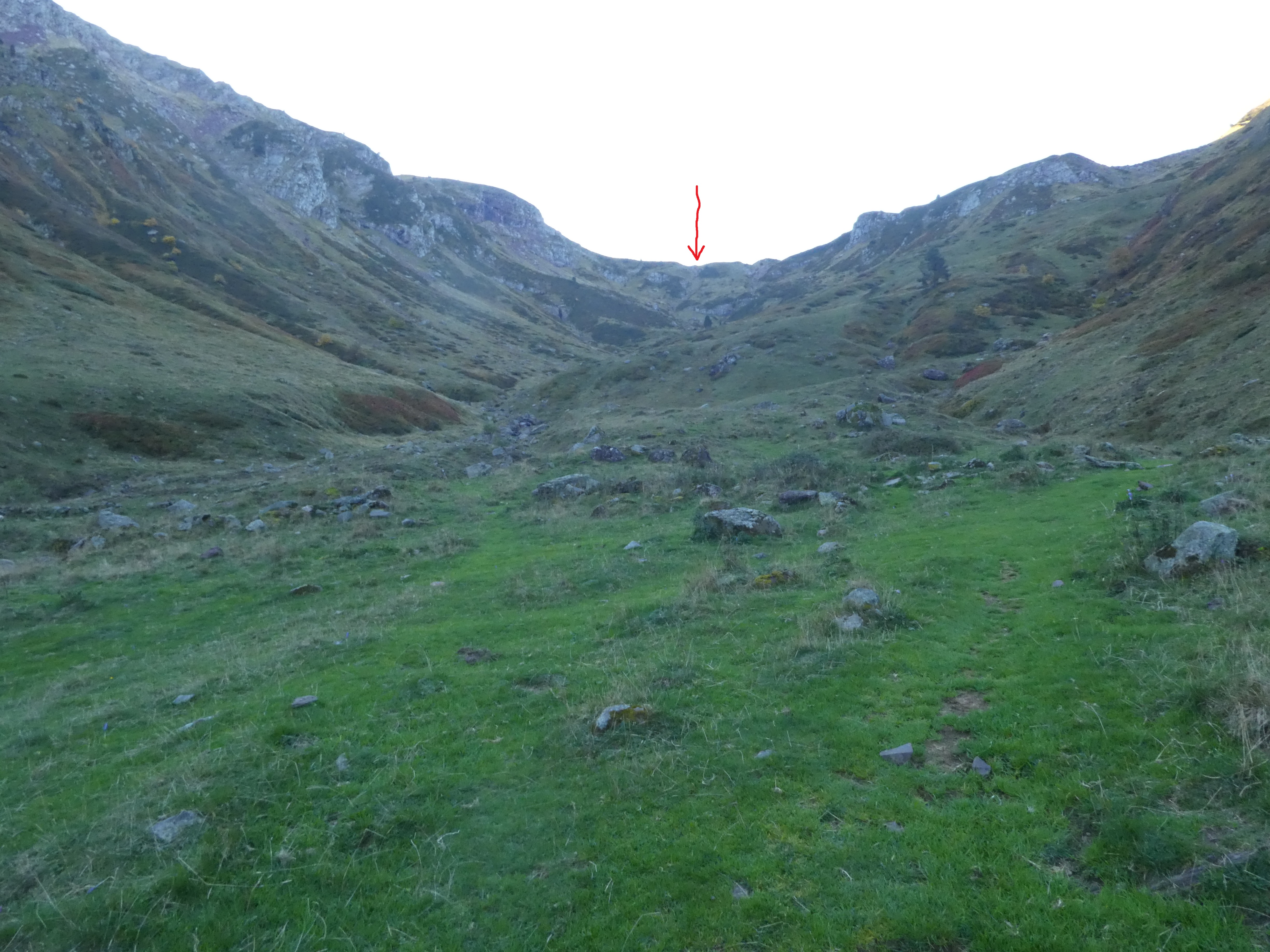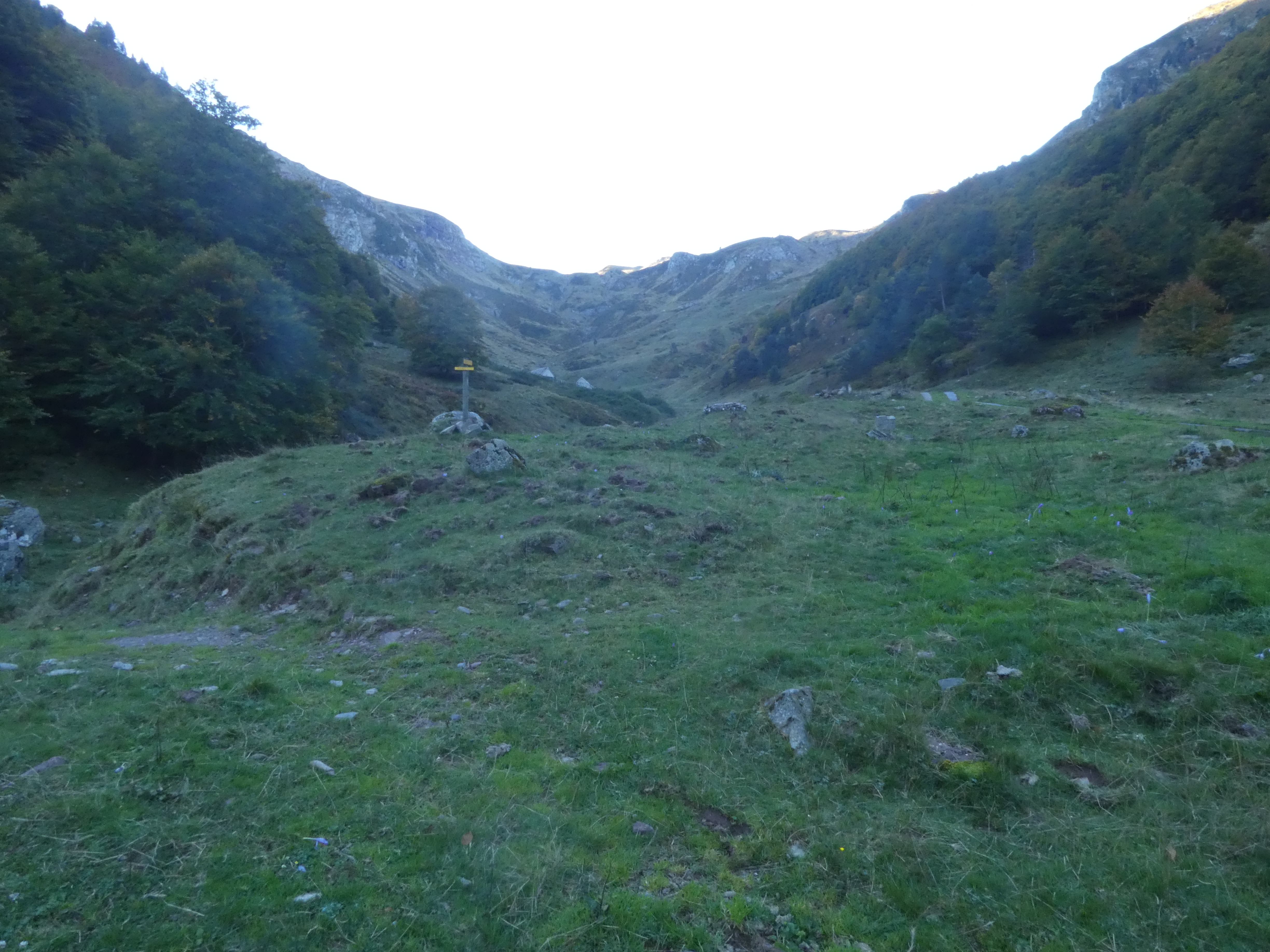 Au niveau de ce col cairné situé au-dessus du Vallon de Bénou (400 mètres après avoir quitté le sommet du Pic de Belonseiche) (2202 m), descendre le vallon sur la gauche direction Cabane de Bénou (entrée dans le Parc National des Pyrénées)