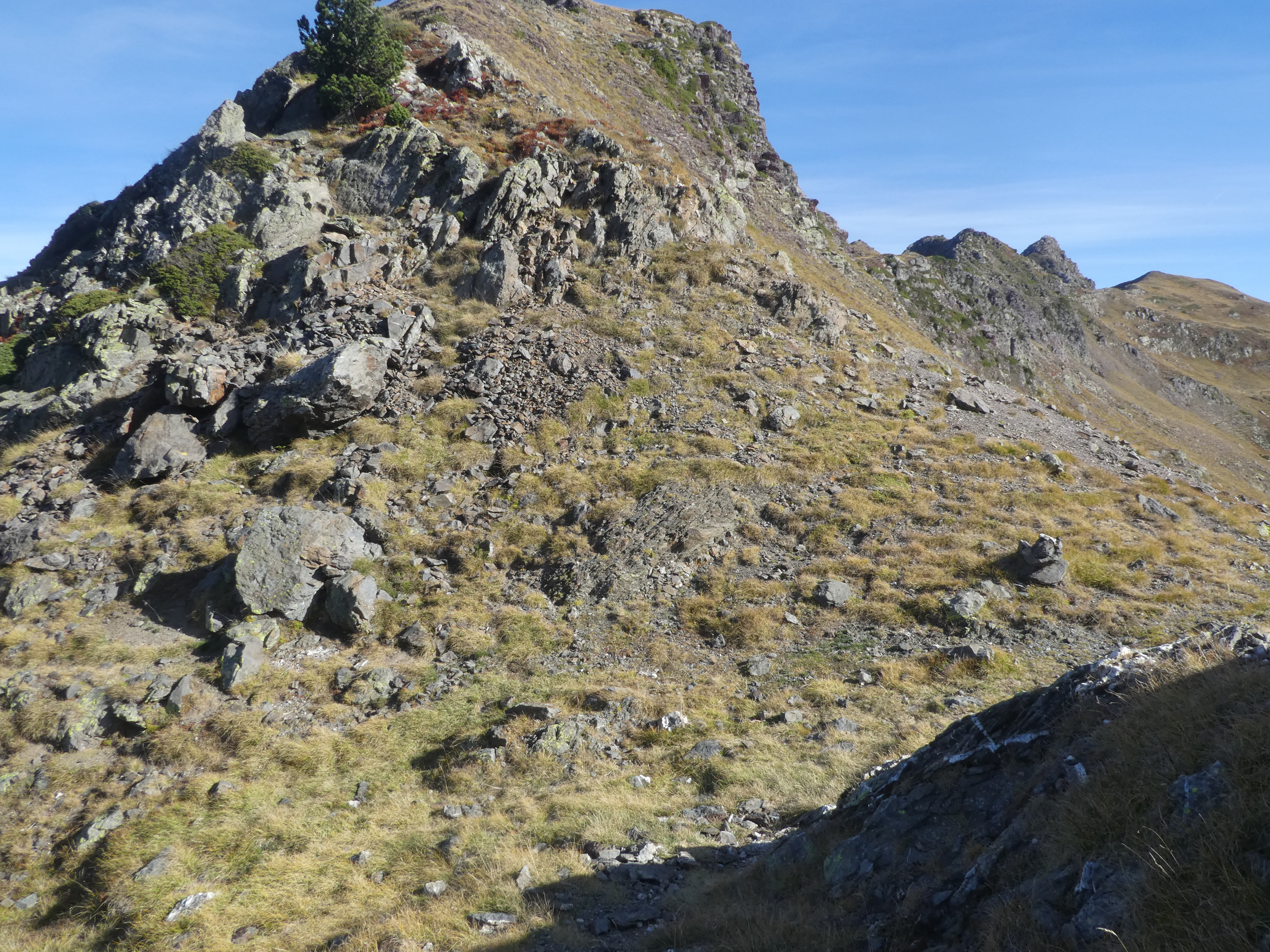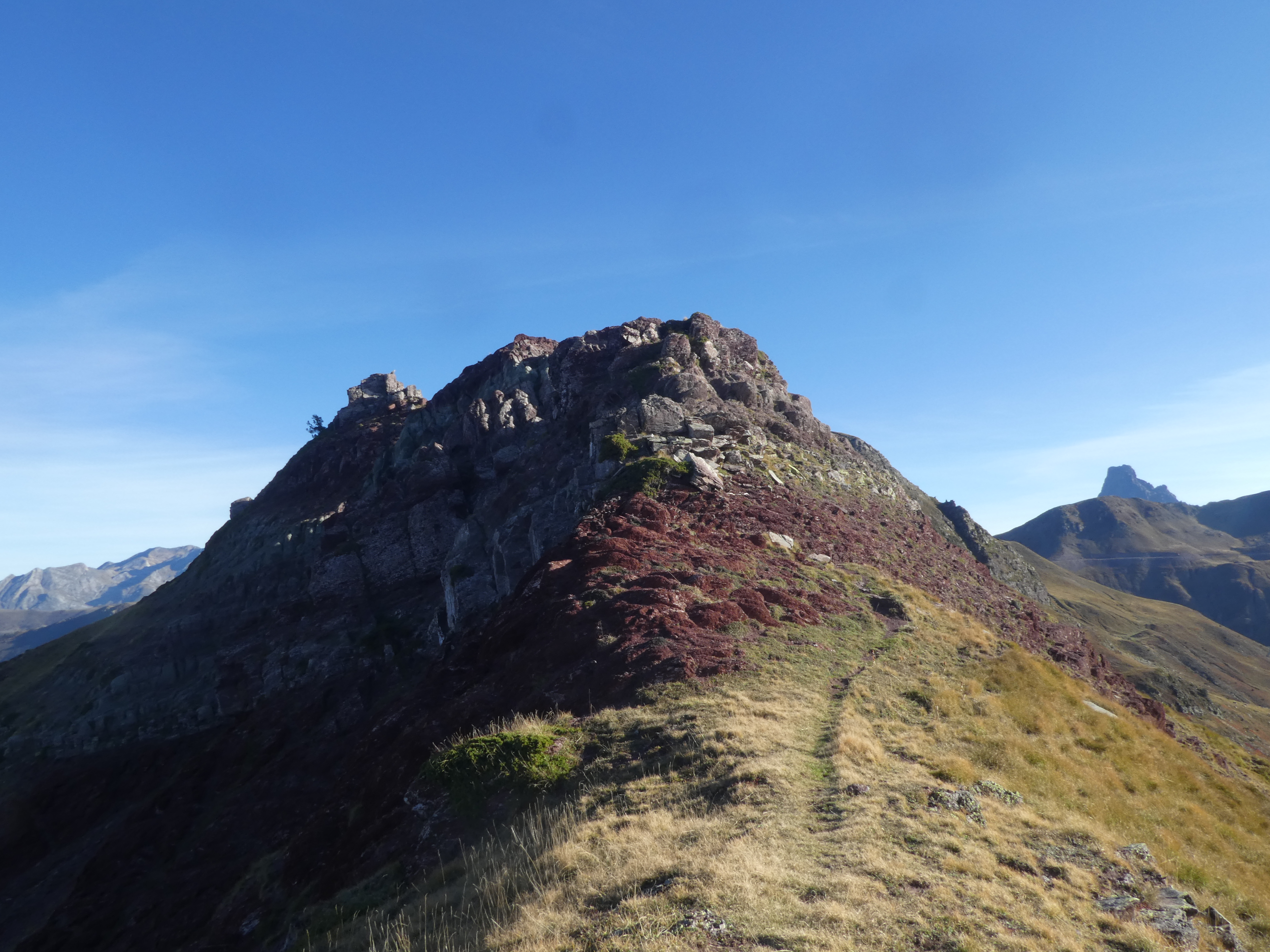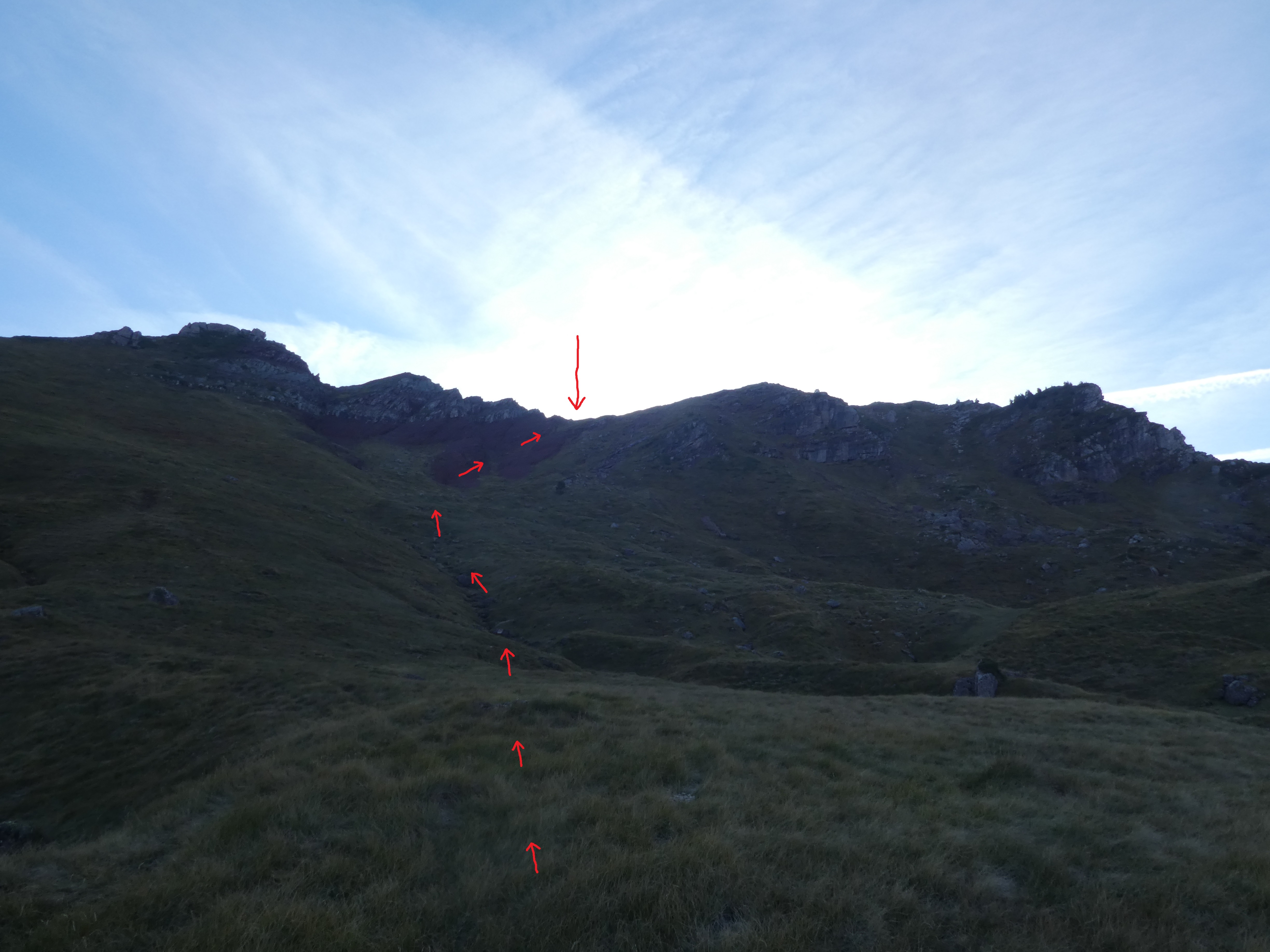 Pour rejoindre le sentier de crête du Pic d'Arnousse depuis le faux-col, il faut atteindre ce point faible de la crête par un itinéraire hors sentier direction Pic d'Arnousse