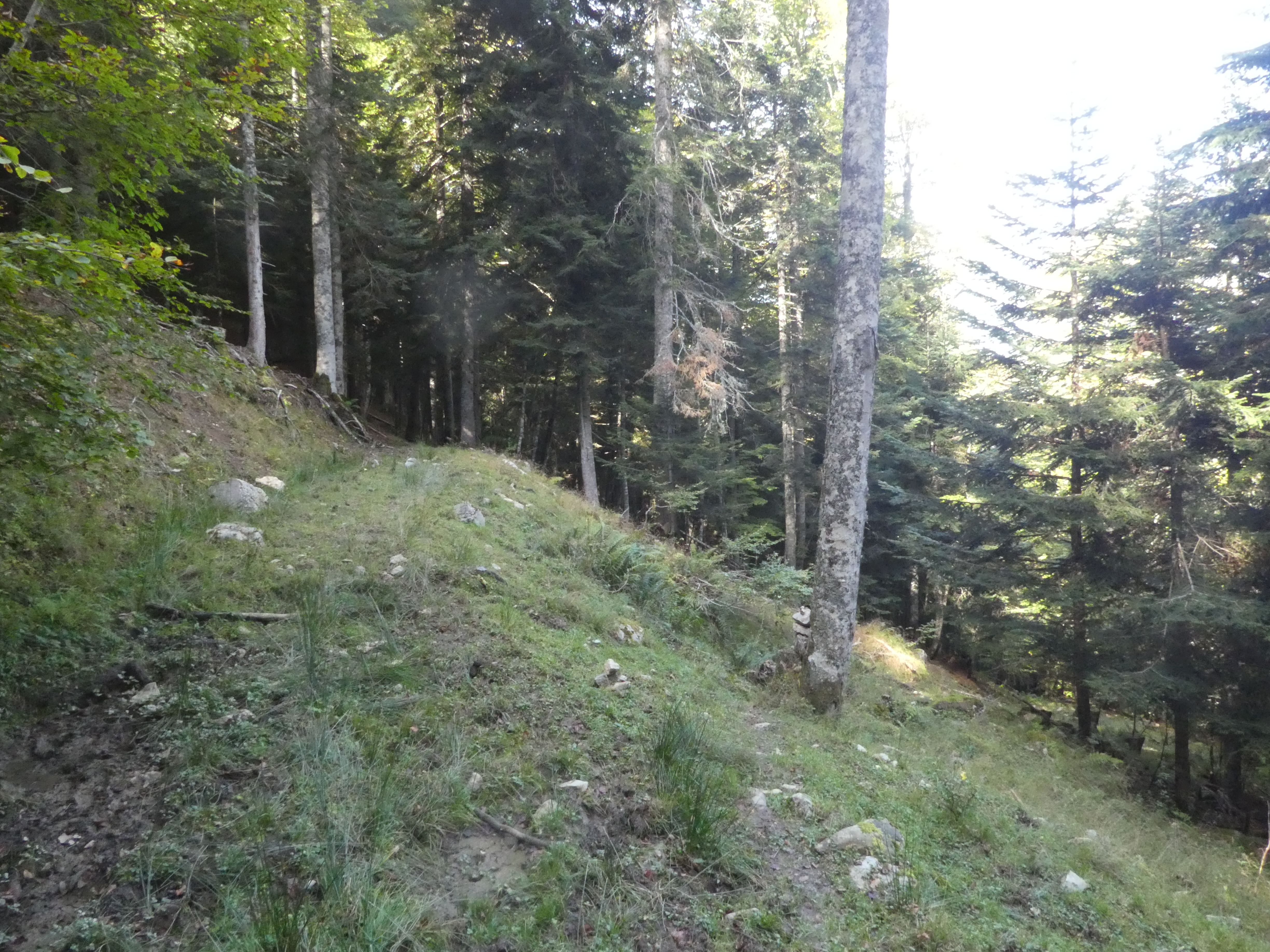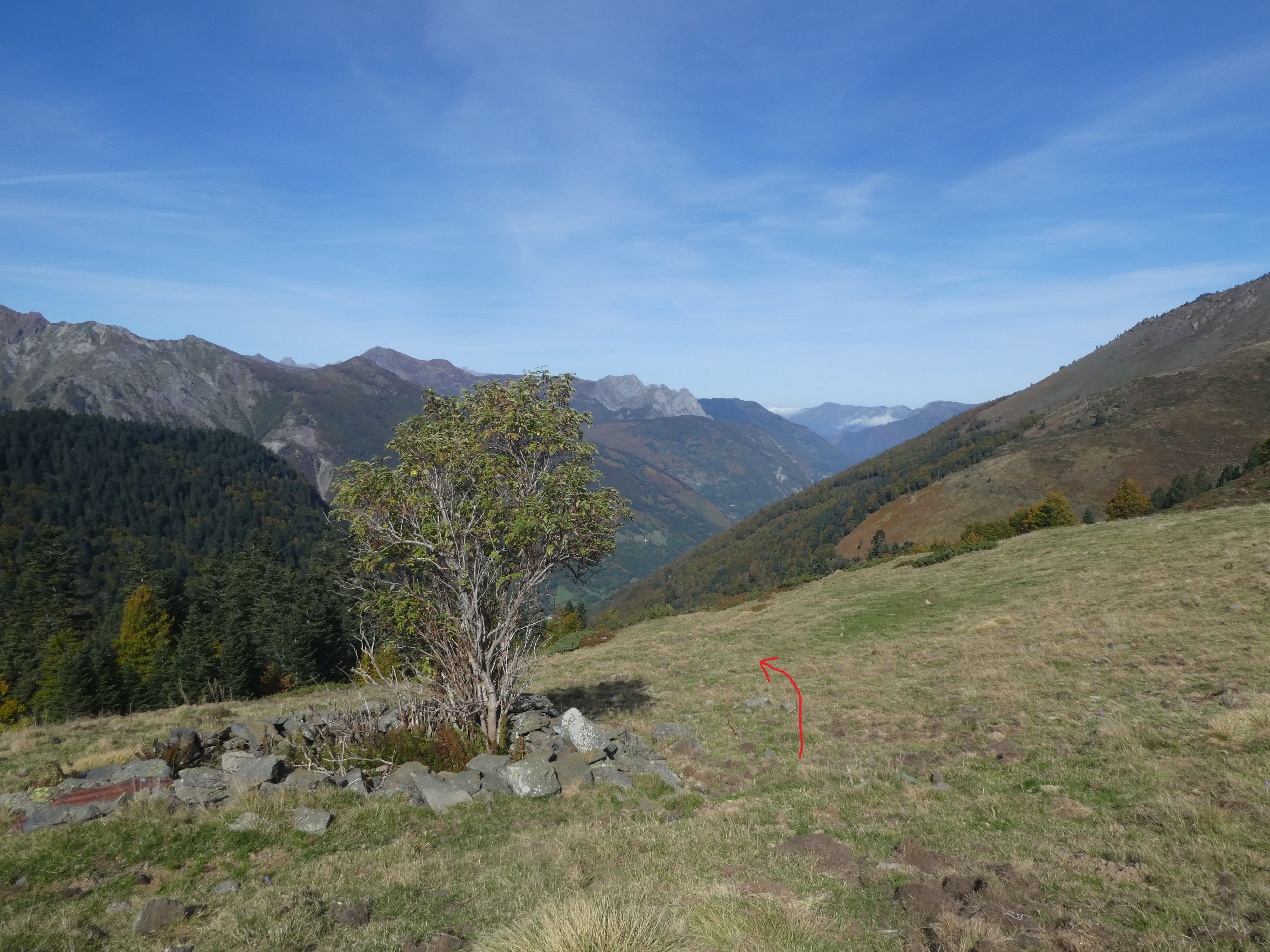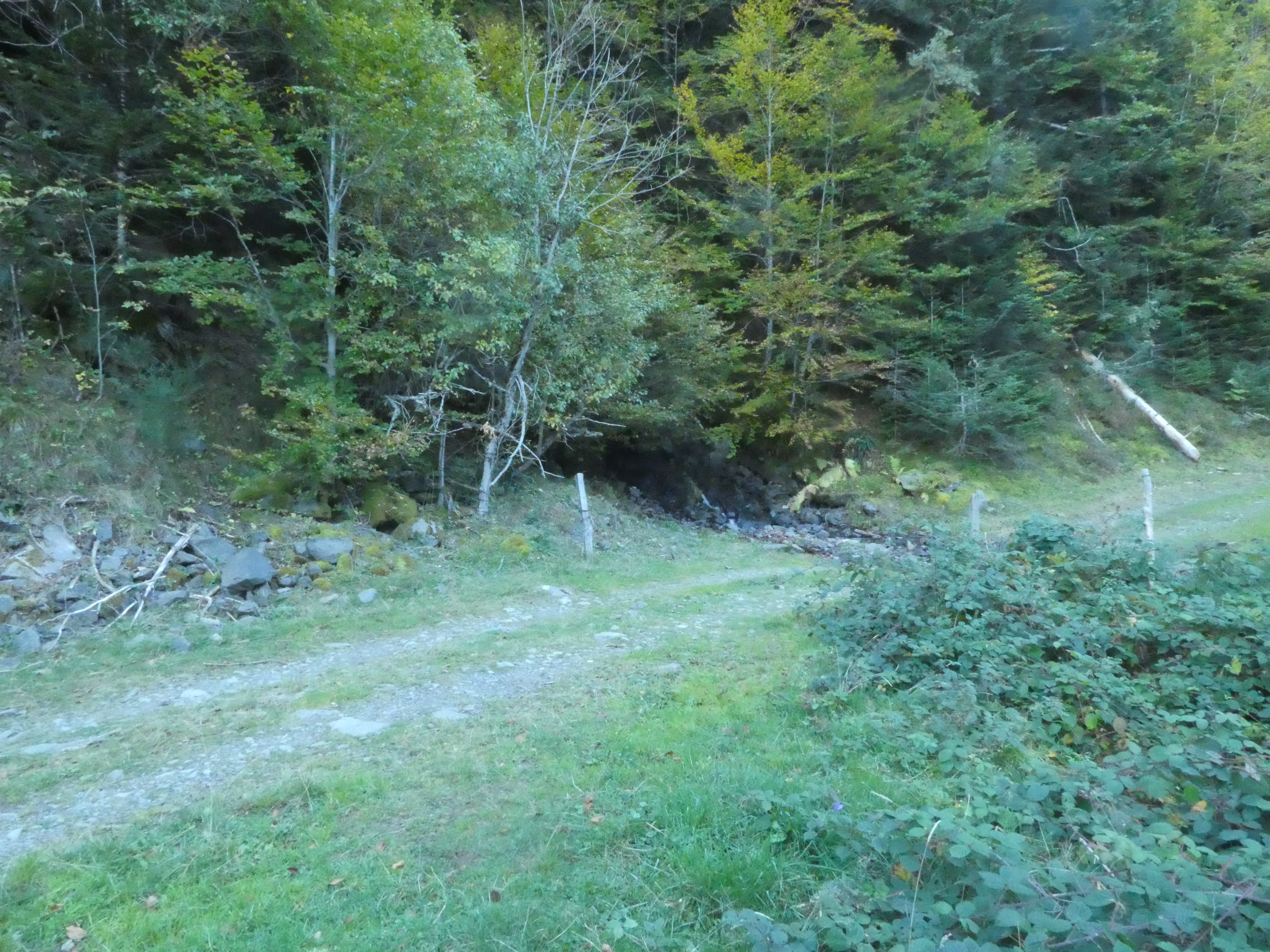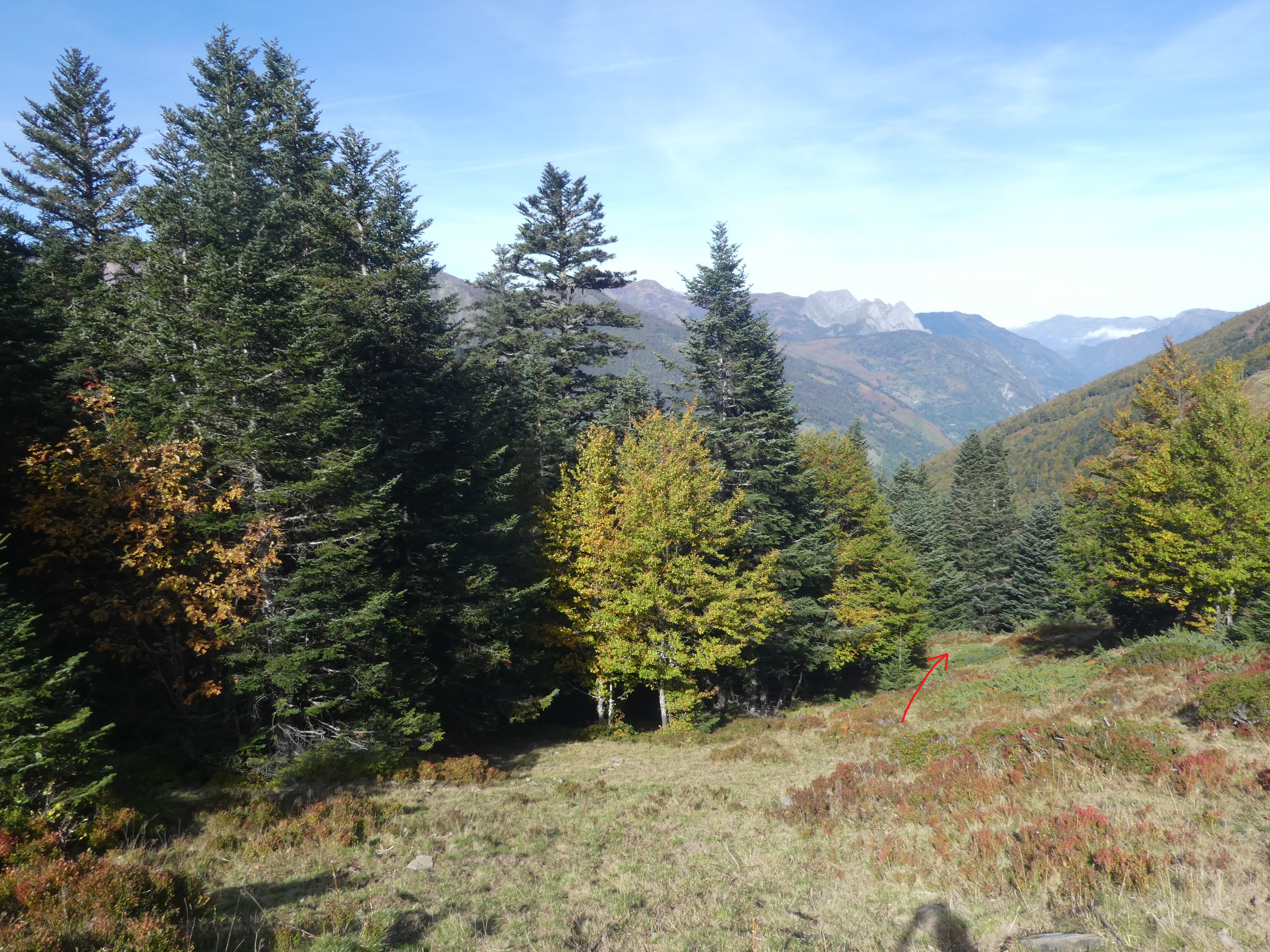Dès que la Cabane de Bénou ruinée est atteinte (1700 mètres après avoir passé le col), continuer à descendre sur la gauche pour rejoindre la lisière du sous-bois où un sentier peu marqué est présent environ 100 mètres plus loin direction Pont d'Arnousse
