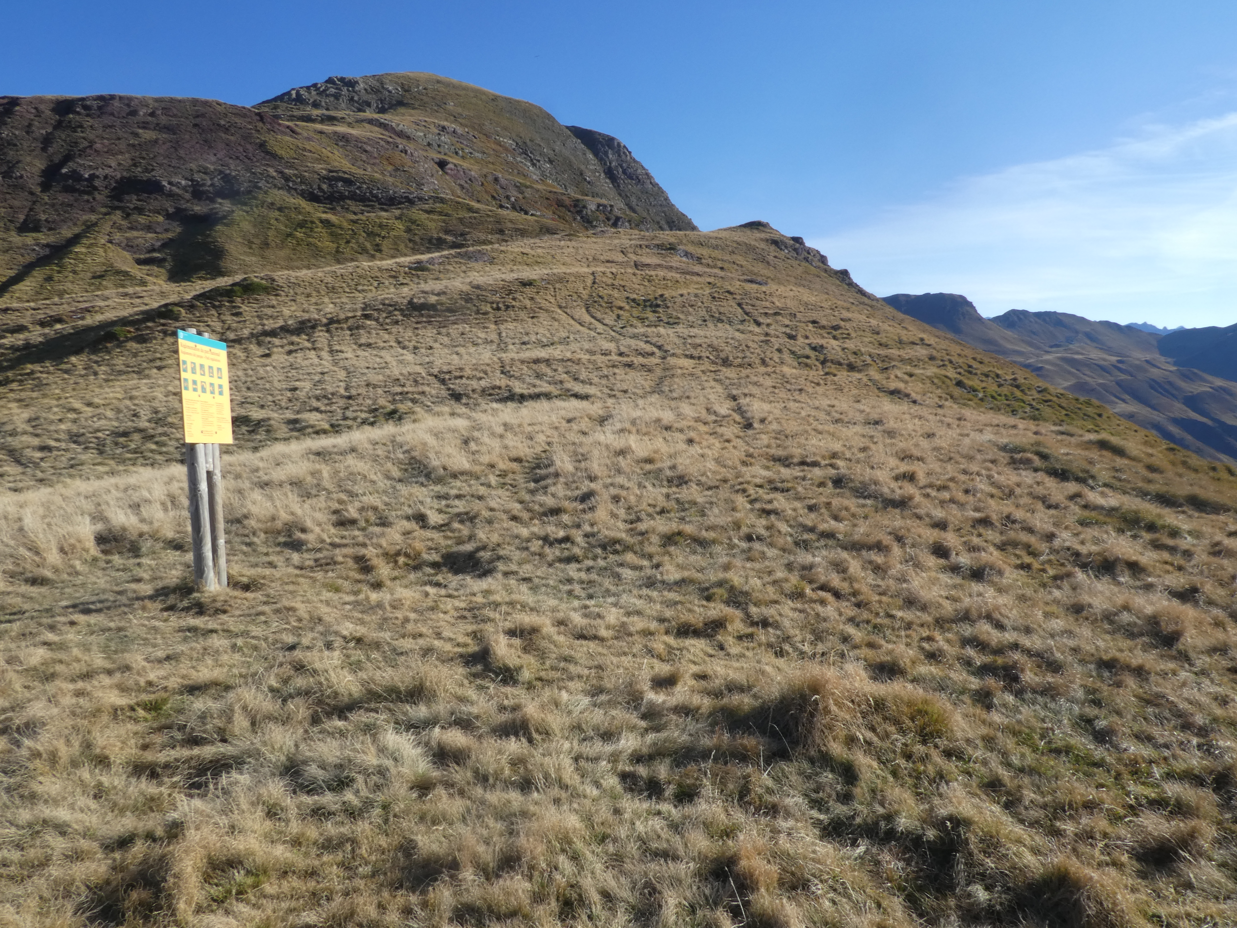 A ce croisement situé au niveau du Col d'Arnousse (400 mètres après le précédent pseudo-croisement) (2080 m), suivre le chemin montant tout droit direction Pic de Bénou