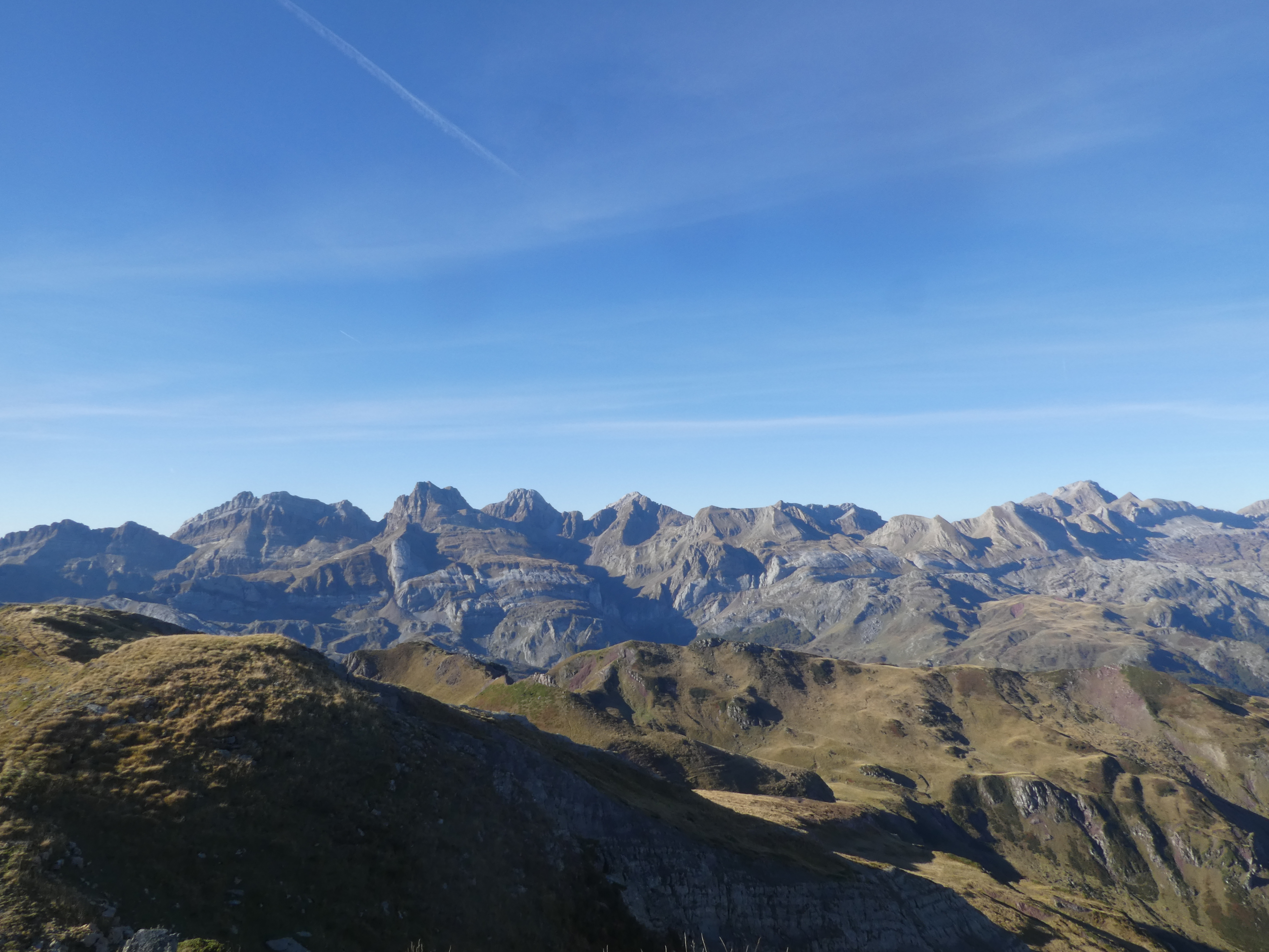 Belle vue sur les sommets du Cirque de Lescun, du Pico Aguërri aux Orgues de Camplong en passant par le Castillo de Acher, le Mallo de Acherito, le Pic d'Ansabère, le Pic des Trois Rois et le Pic d'Anie