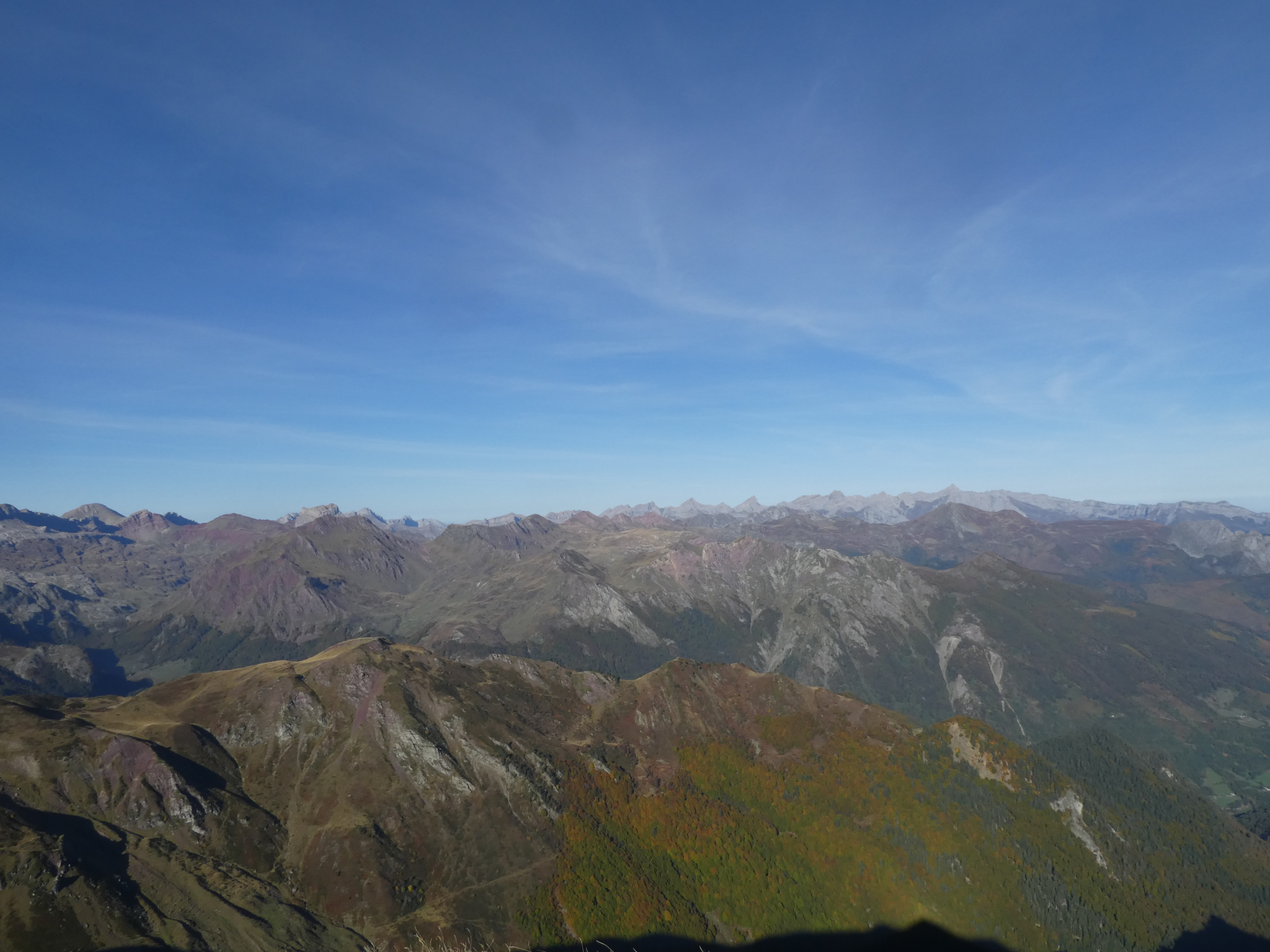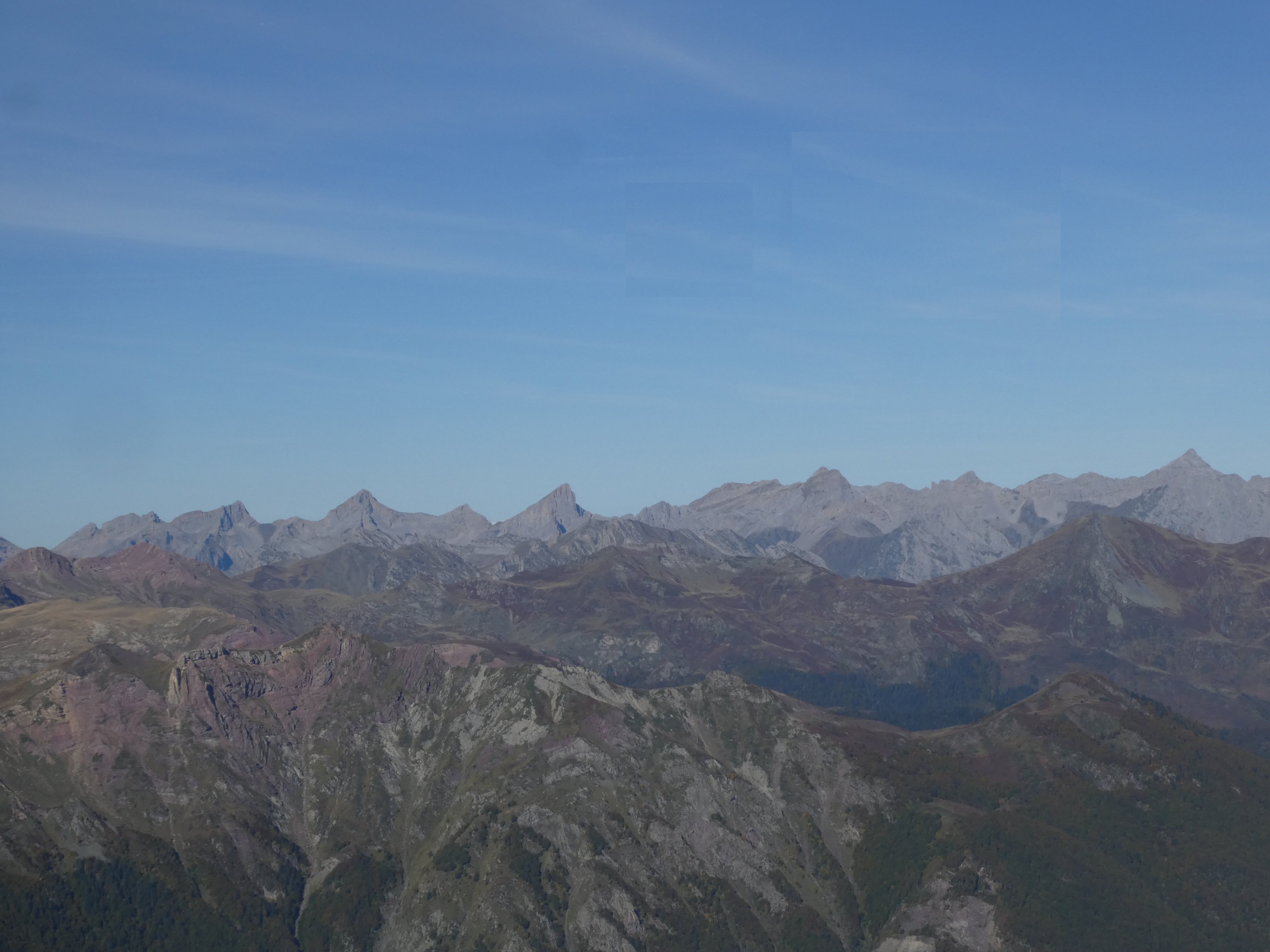 Arrivée au sommet du Pic de Bénou (2271 m) : panorama semblable à celui du Pic d'Arnousse avec une vue plus étendue sur les sommets de la Vallée d'Ossau et sur la Vallée d'Aspe
