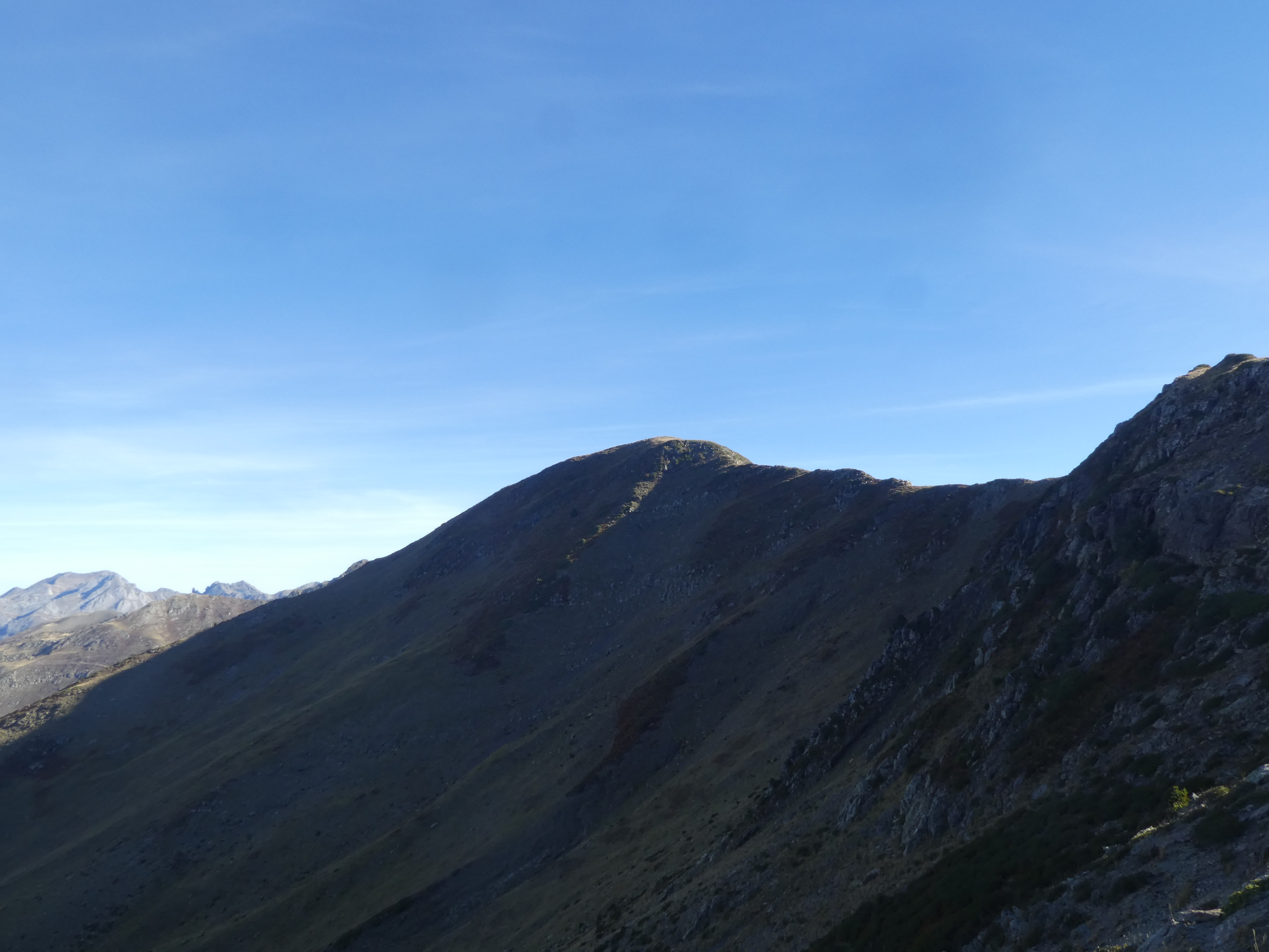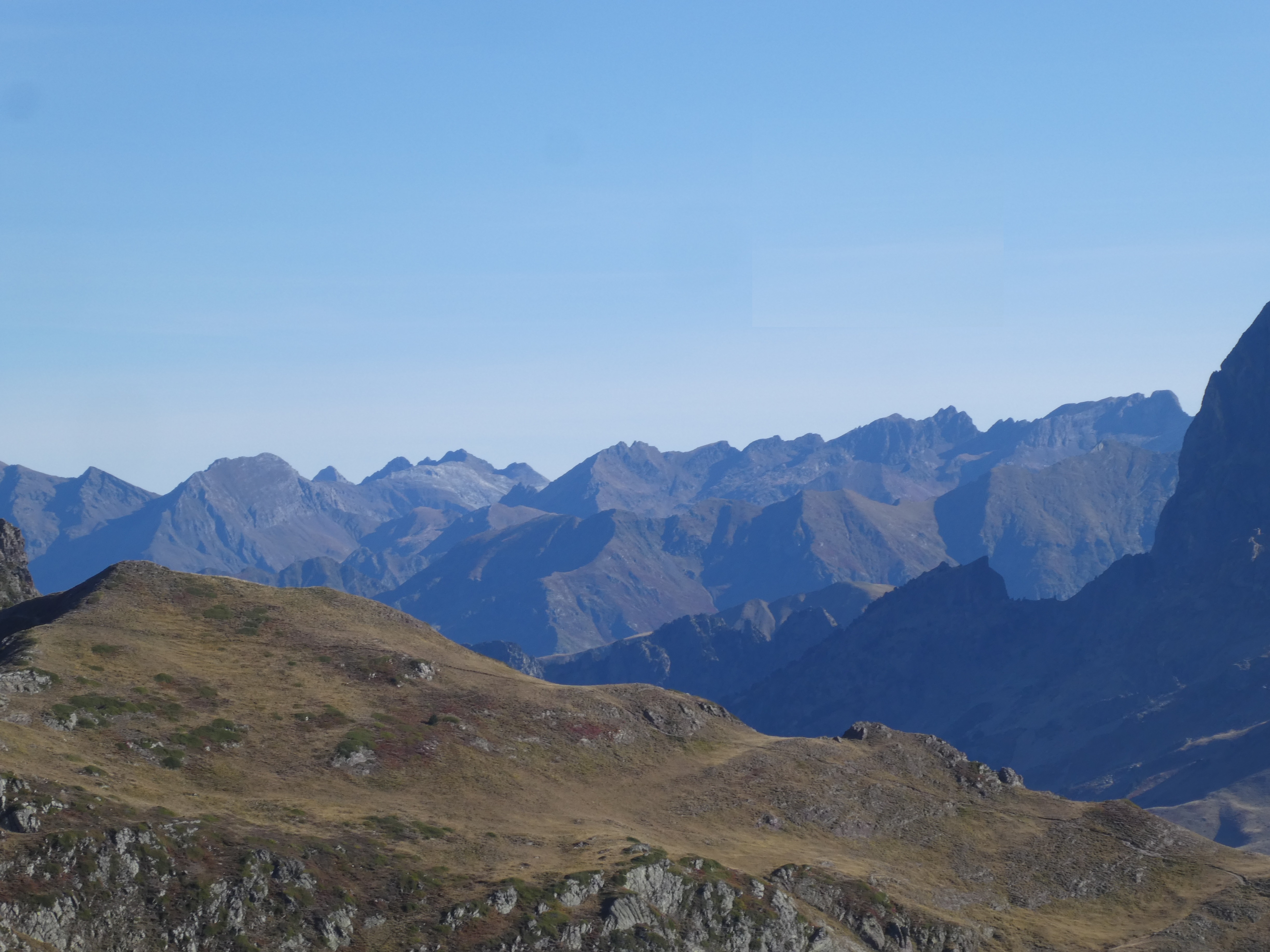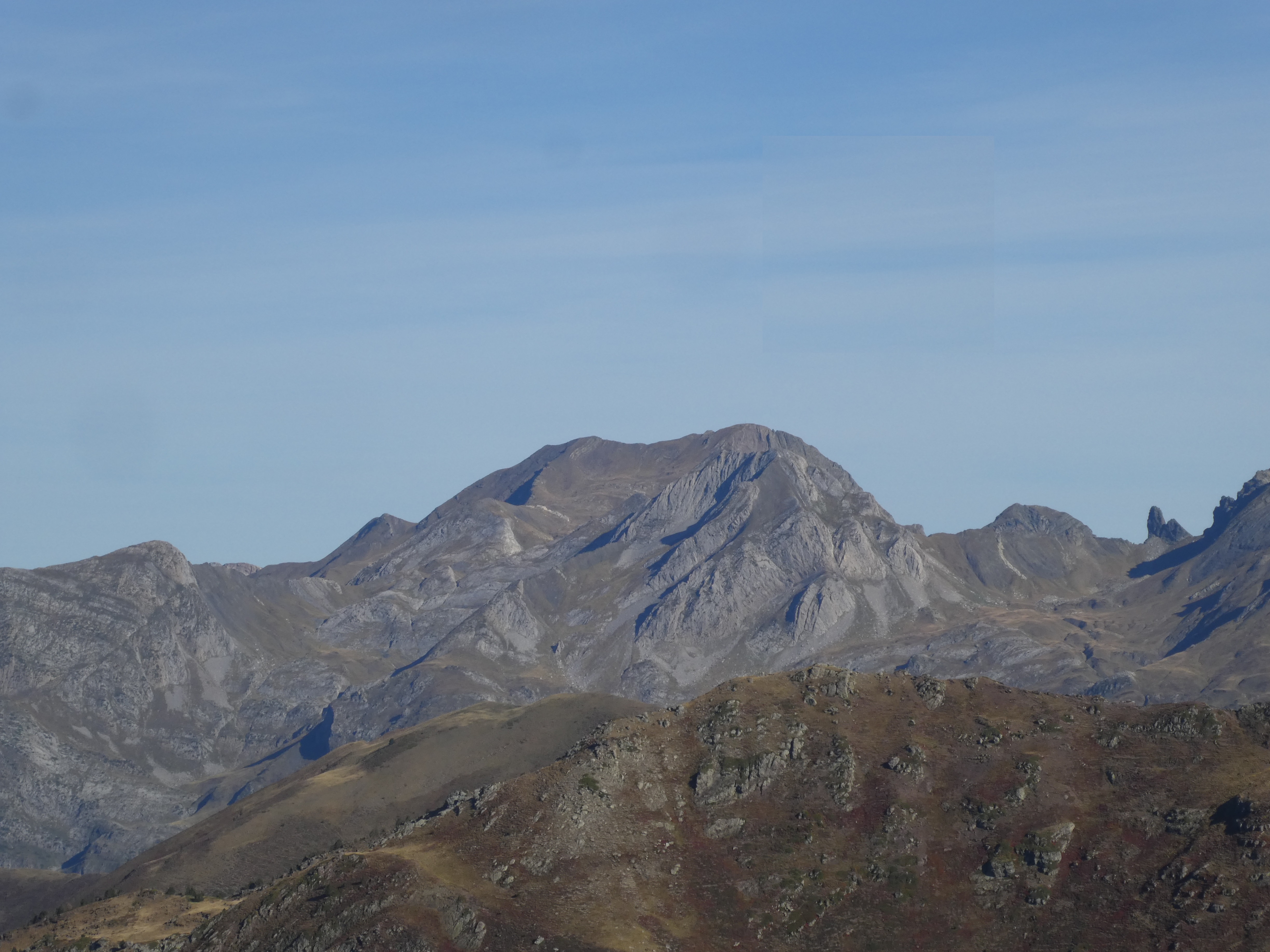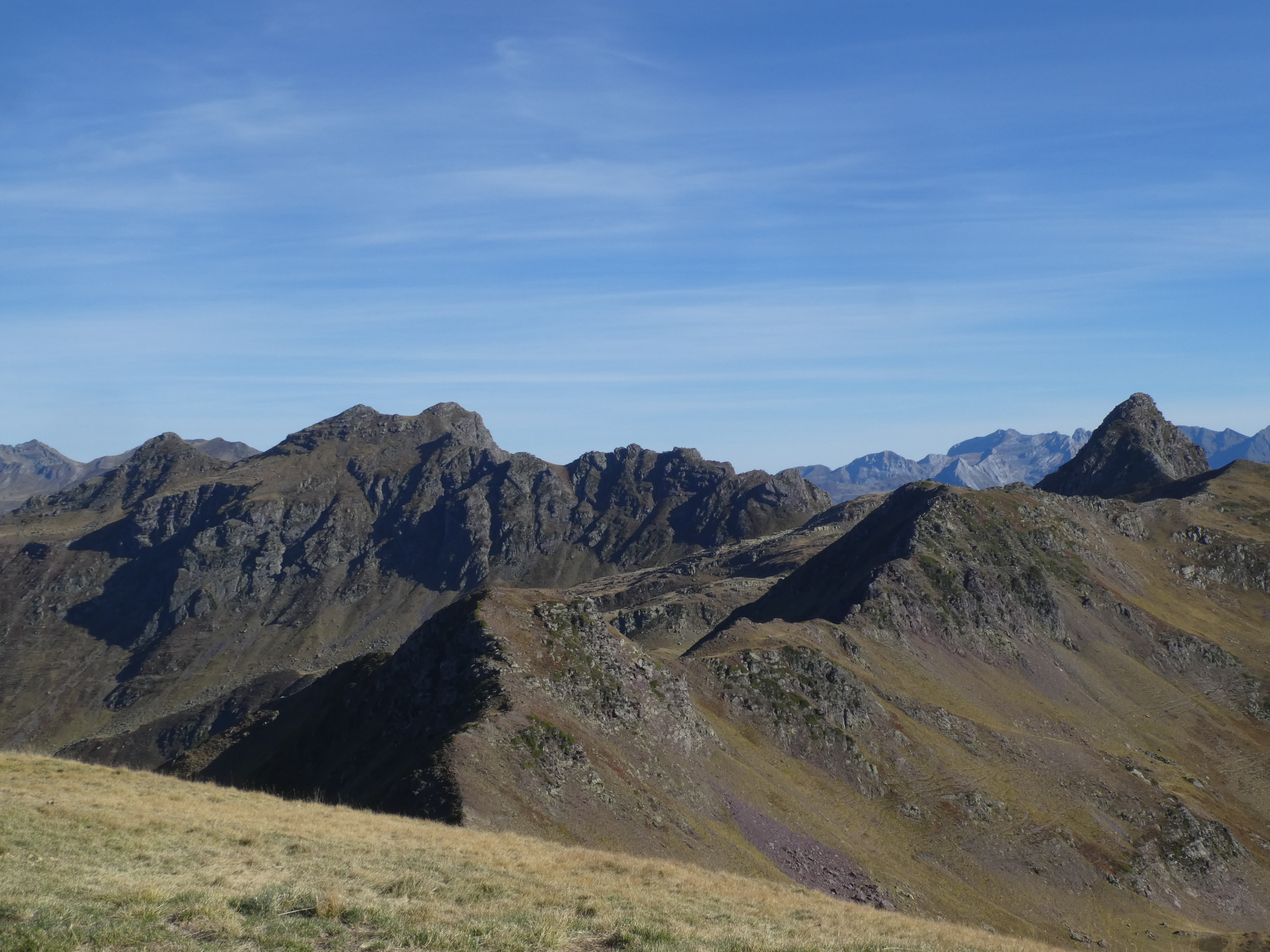 Belle vue sur le Pico Garganta de Borau (2566 m) et el Sombrero (2562 m) au centre-gauche, le Pico de Aspe (2640 m) au centre, le Pico Llena de la Garganta (2597 m) et le Pico Llena del Bozo (2559 m) à droite fermant la Vallée d'Aspe côté Sud