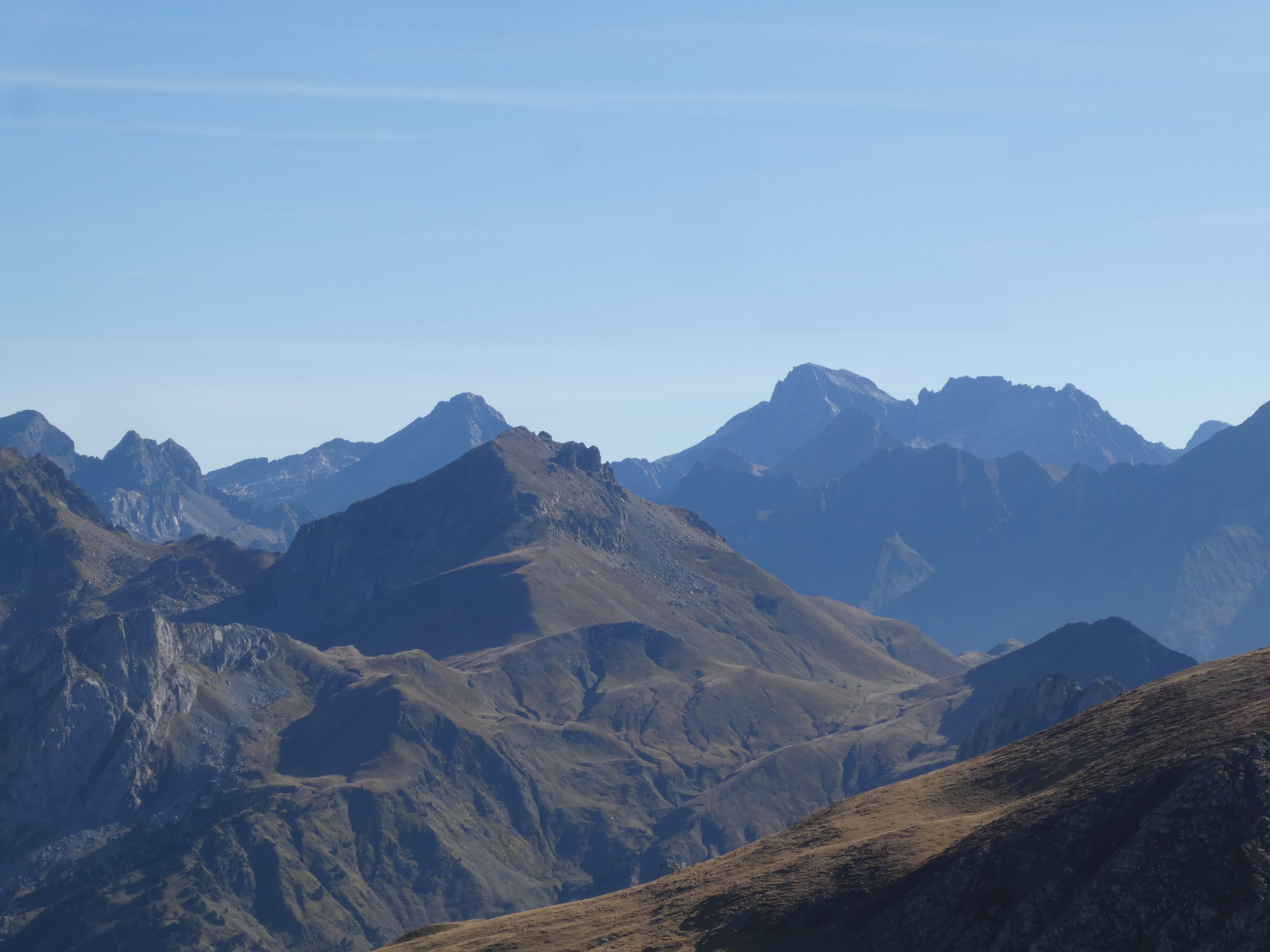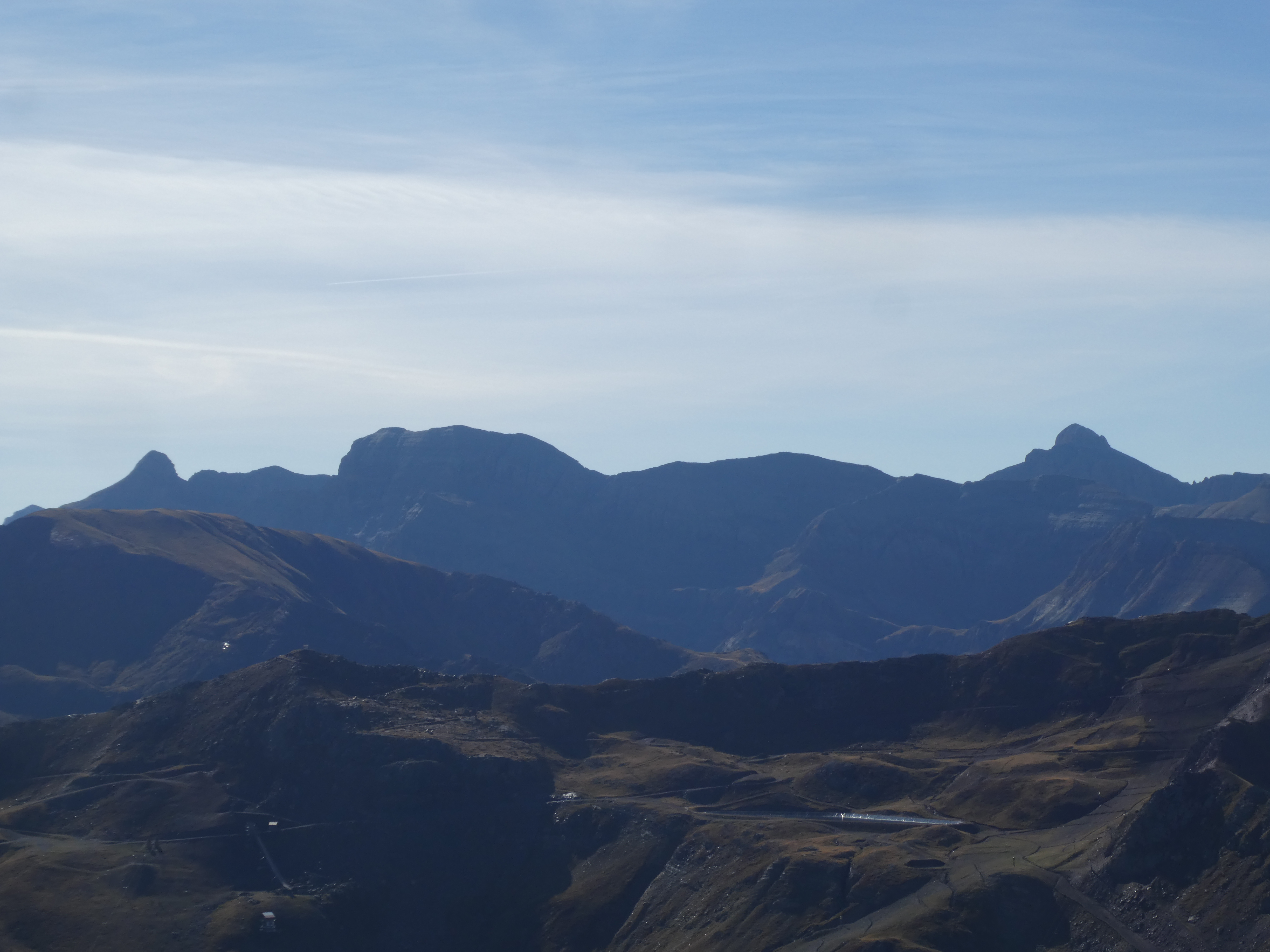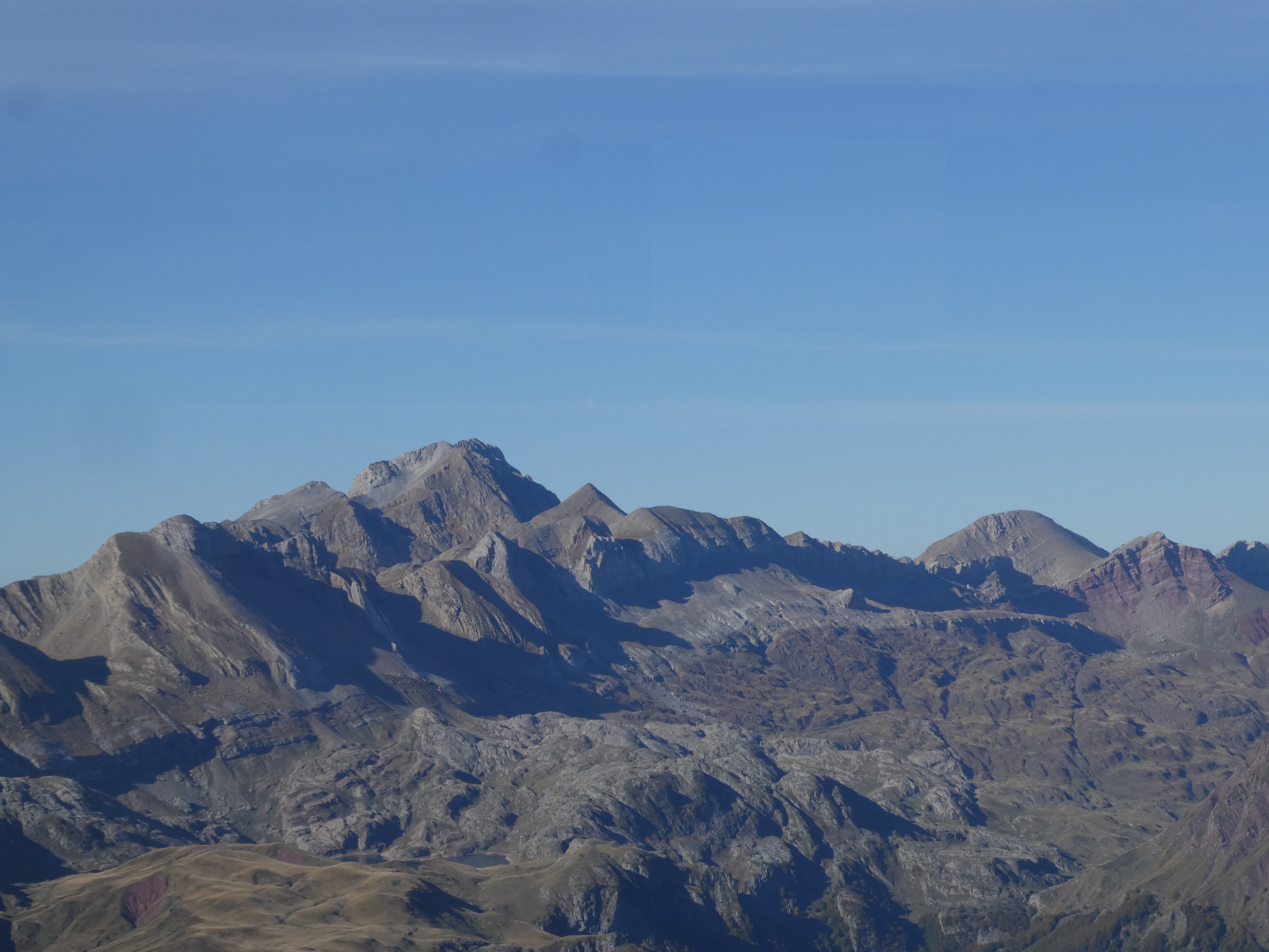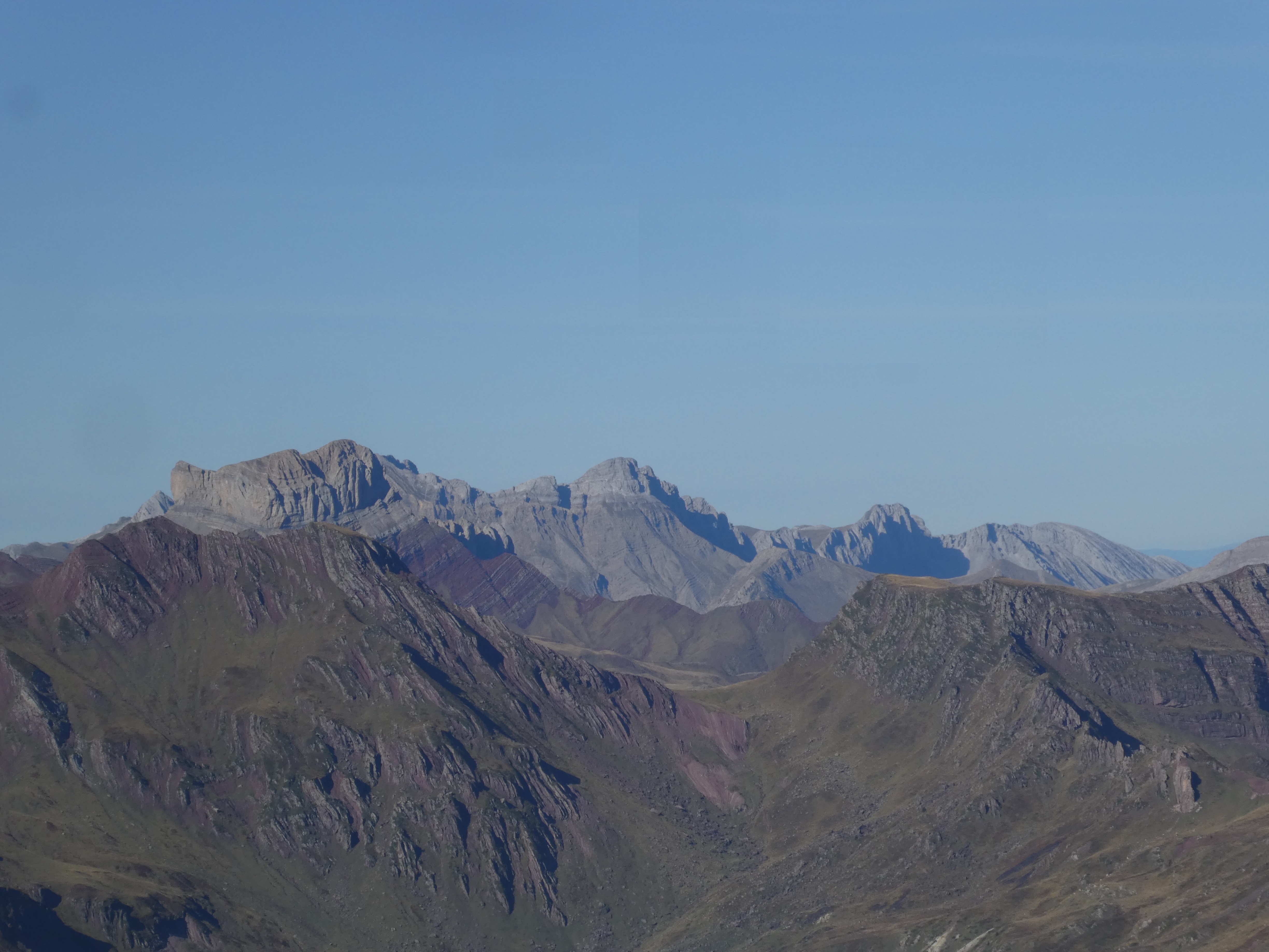 Zoom sur les sommets de la Vallée de Canfranc avec le Pico de Escarra (2748 m), le Pala de Ip (2779 m) et la Peña Collarada (2884 m)