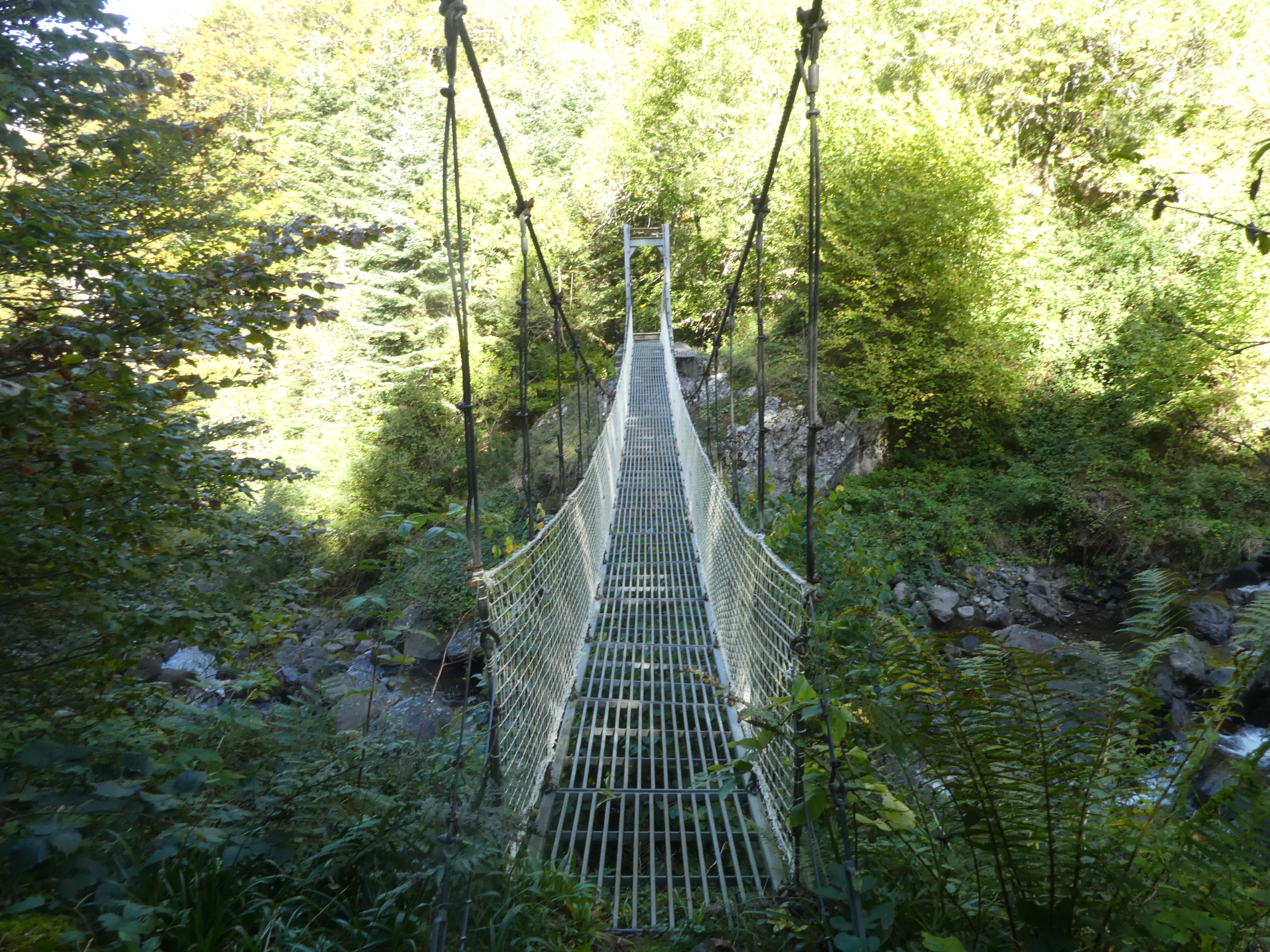 Au niveau de ce pont de singe (600 mètres après le précédent croisement), franchir ce dernier puis progresser sur le sentier situé rive gauche du Ruisseau d'Arnousse direction Peyrenière (entrée dans le Parc National des Pyrénées)