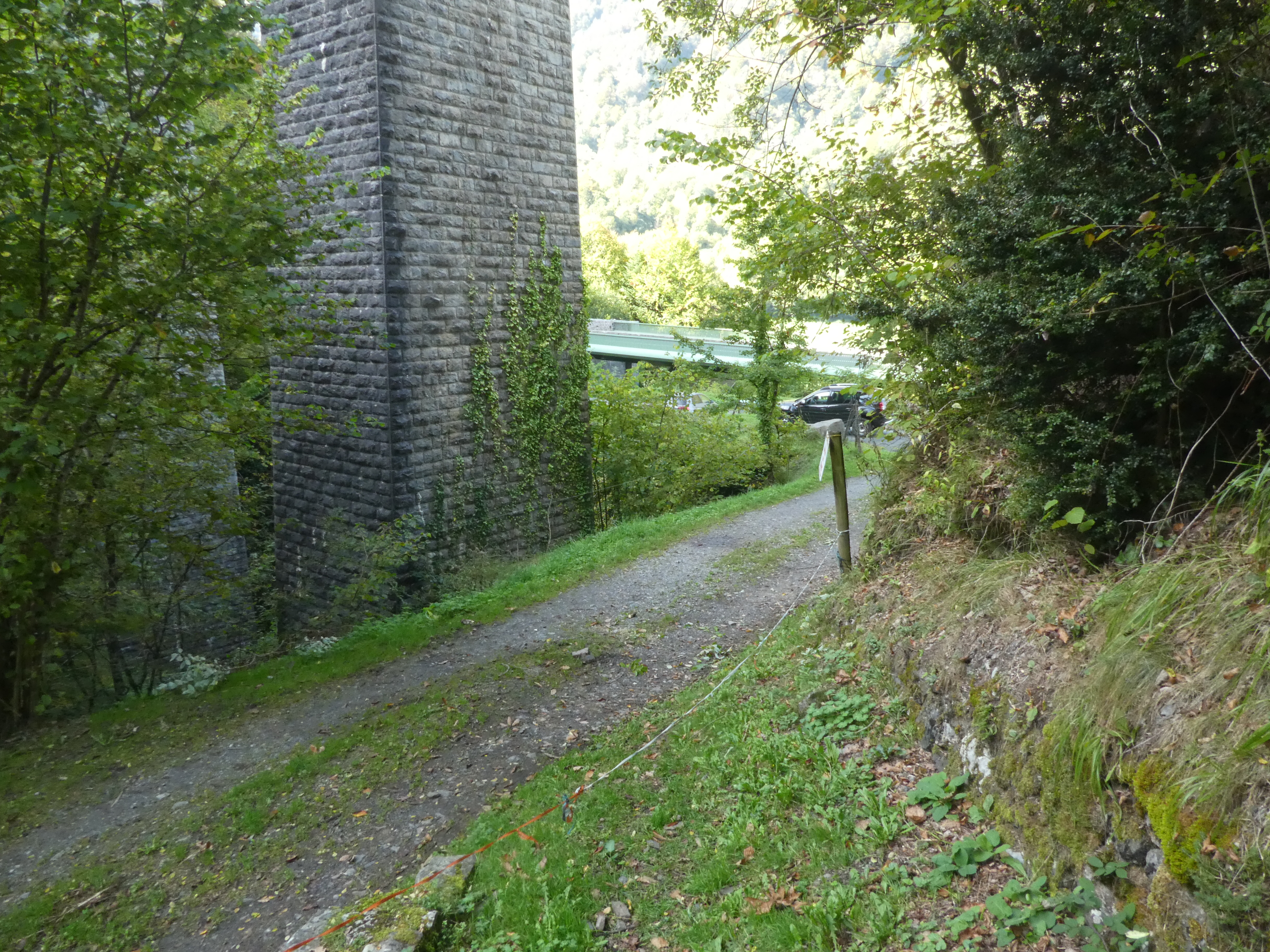 A ce croisement marqué par la présence d'un panneau directionnel situé sous le Pont d'Arnousse (500 mètres après le précédent), suivre le large chemin partant sur la droite vers le parking direction Pont d'Arnousse