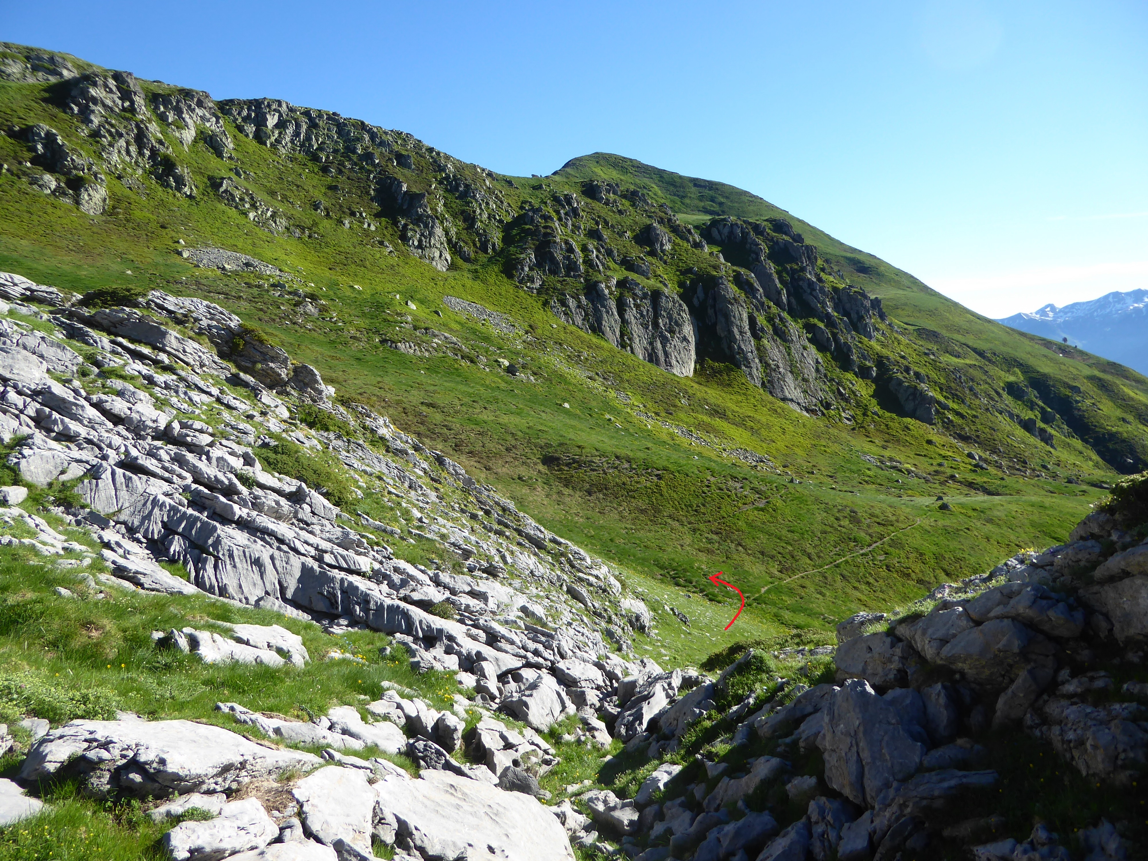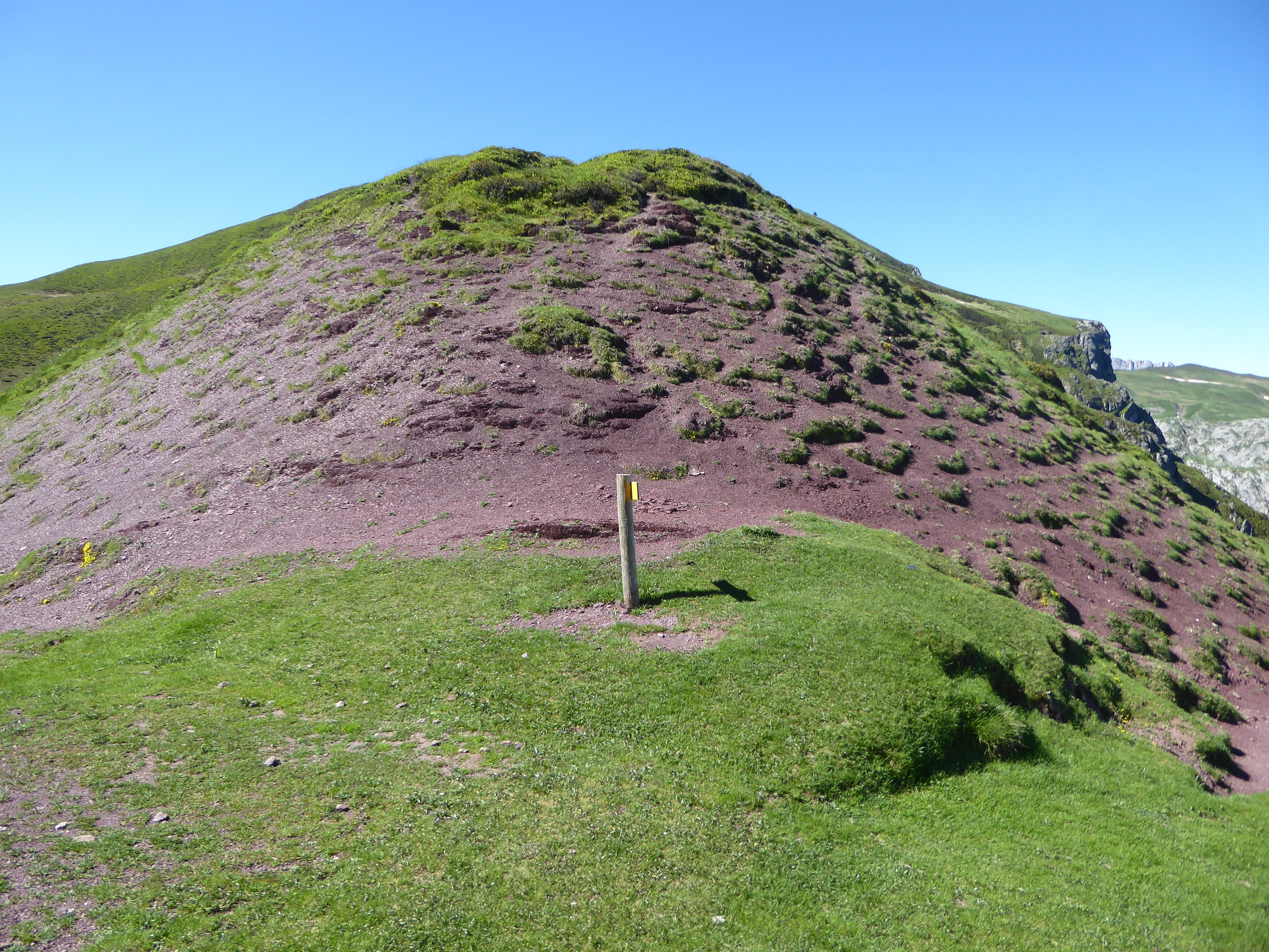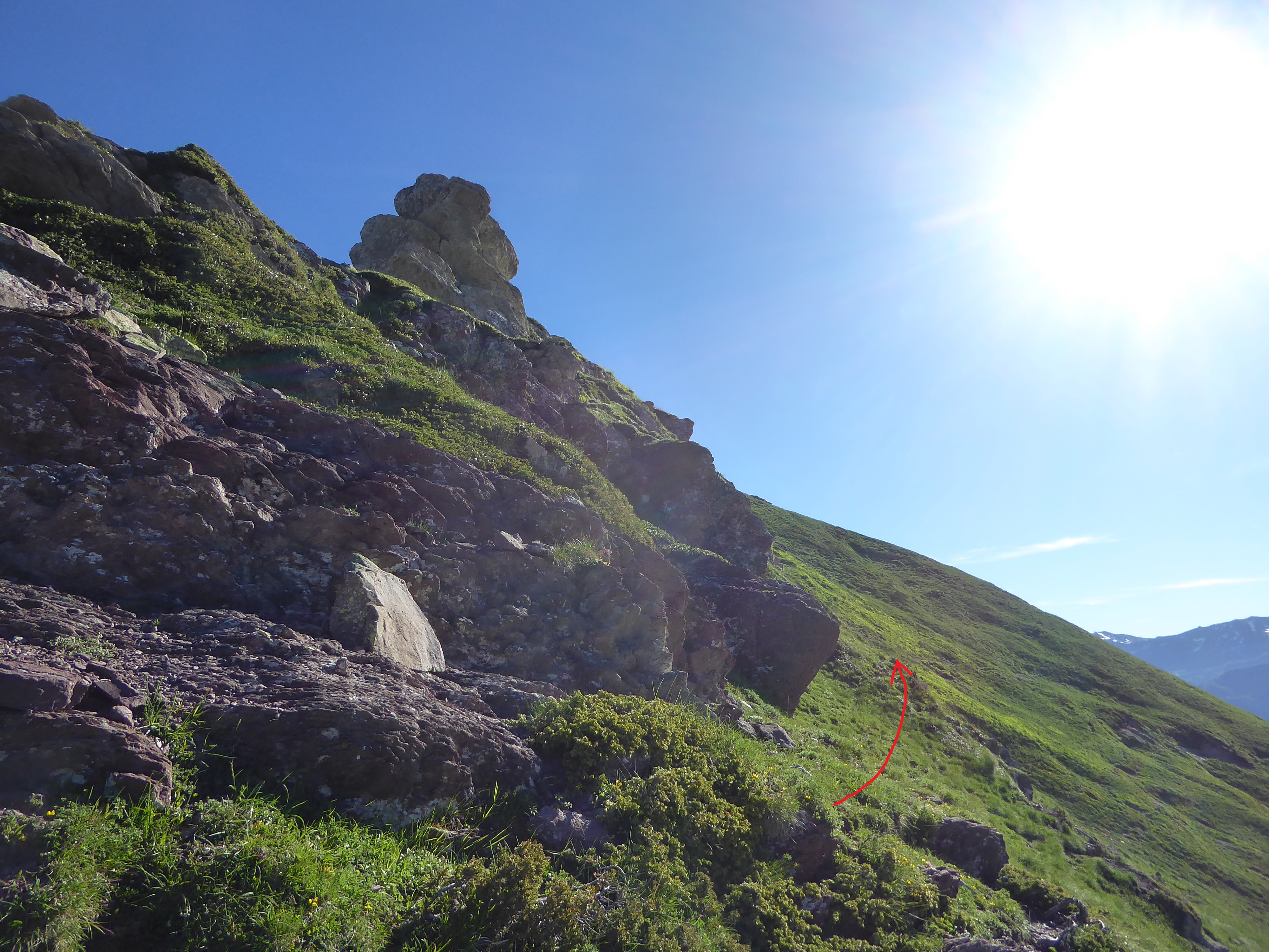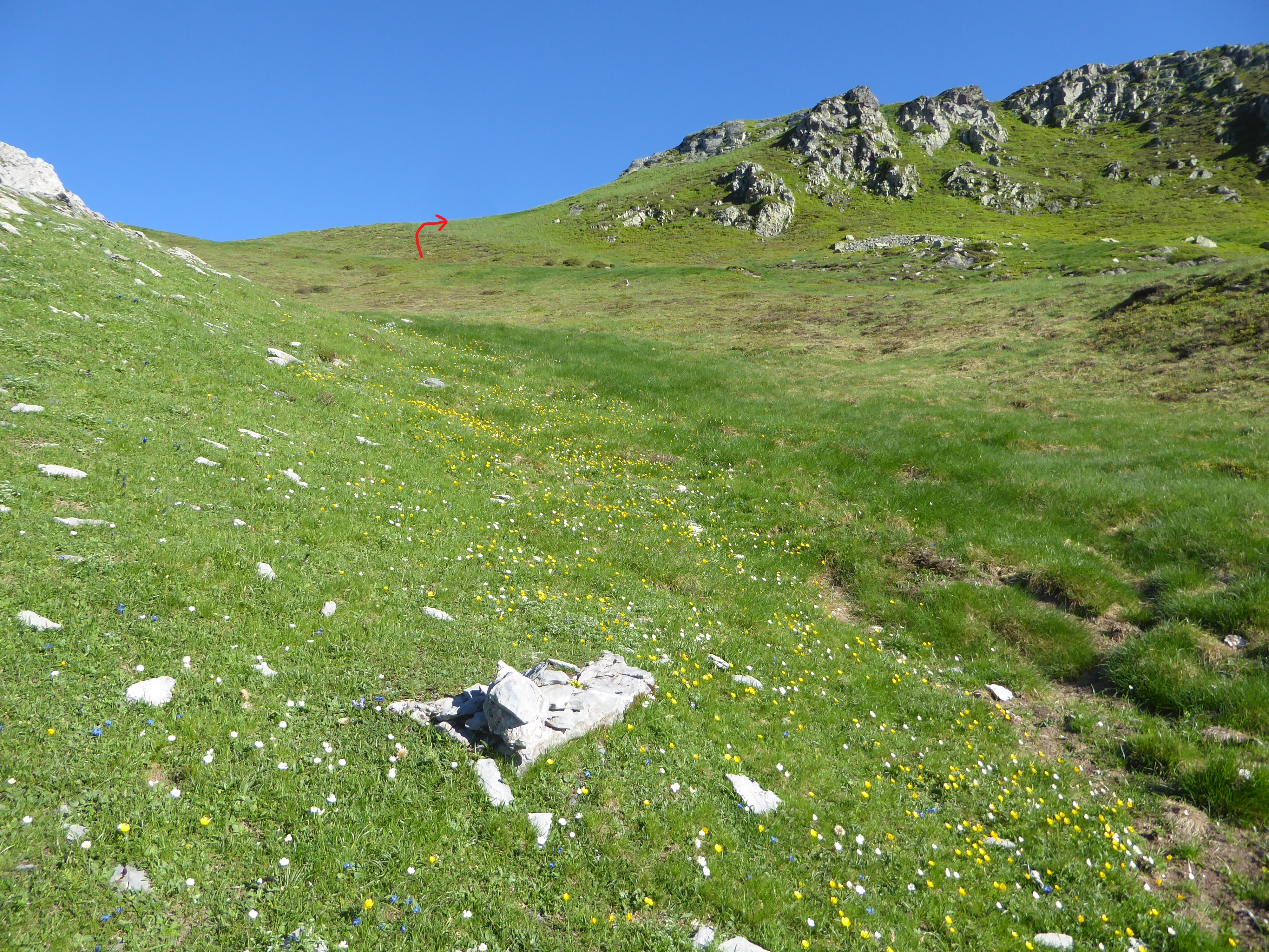 Au fameux cairn précédemment évoqué, monter hors sentier cette pente herbeuse pour rejoindre le fil de crête sur la droite direction Table de Souperret