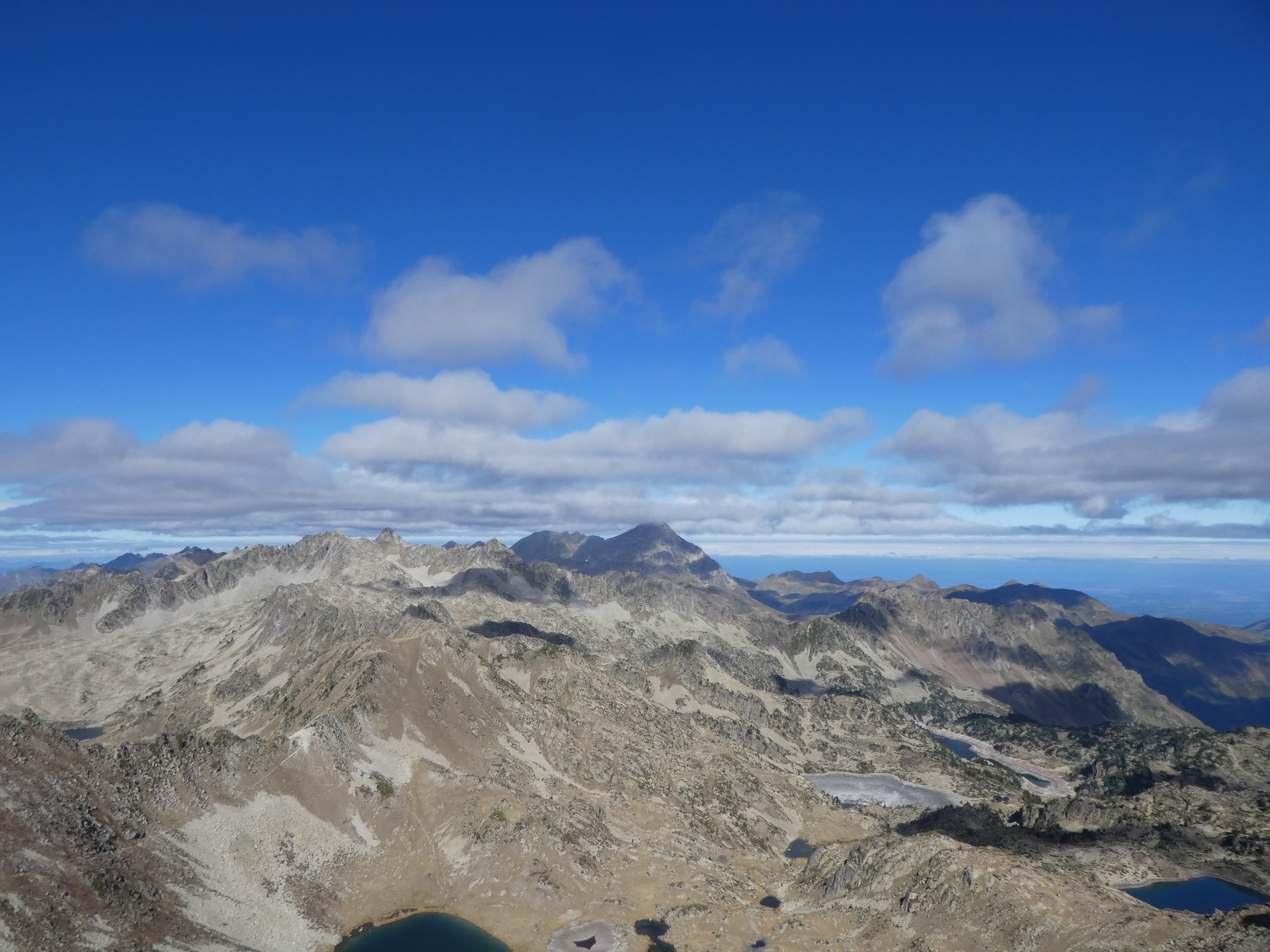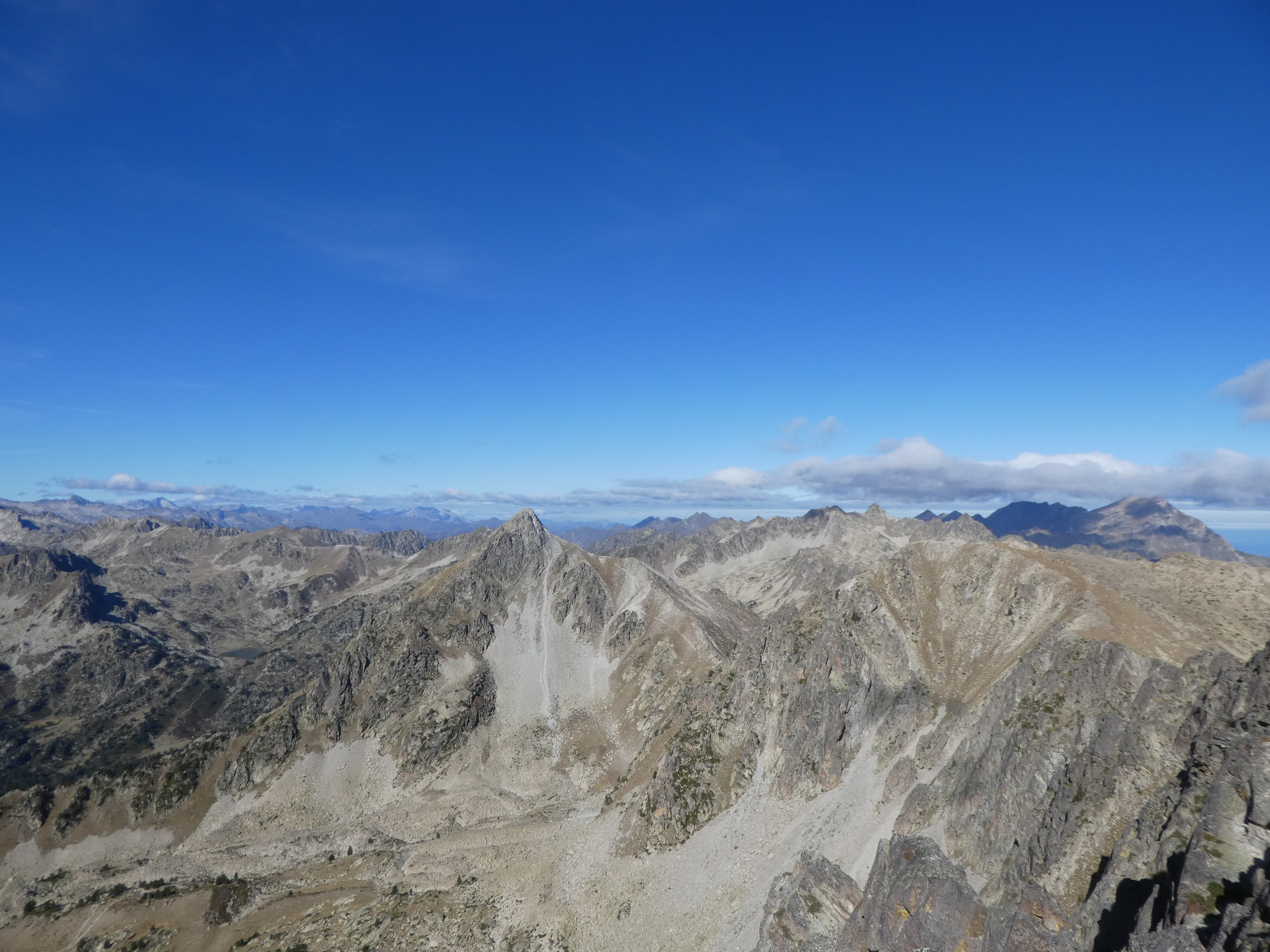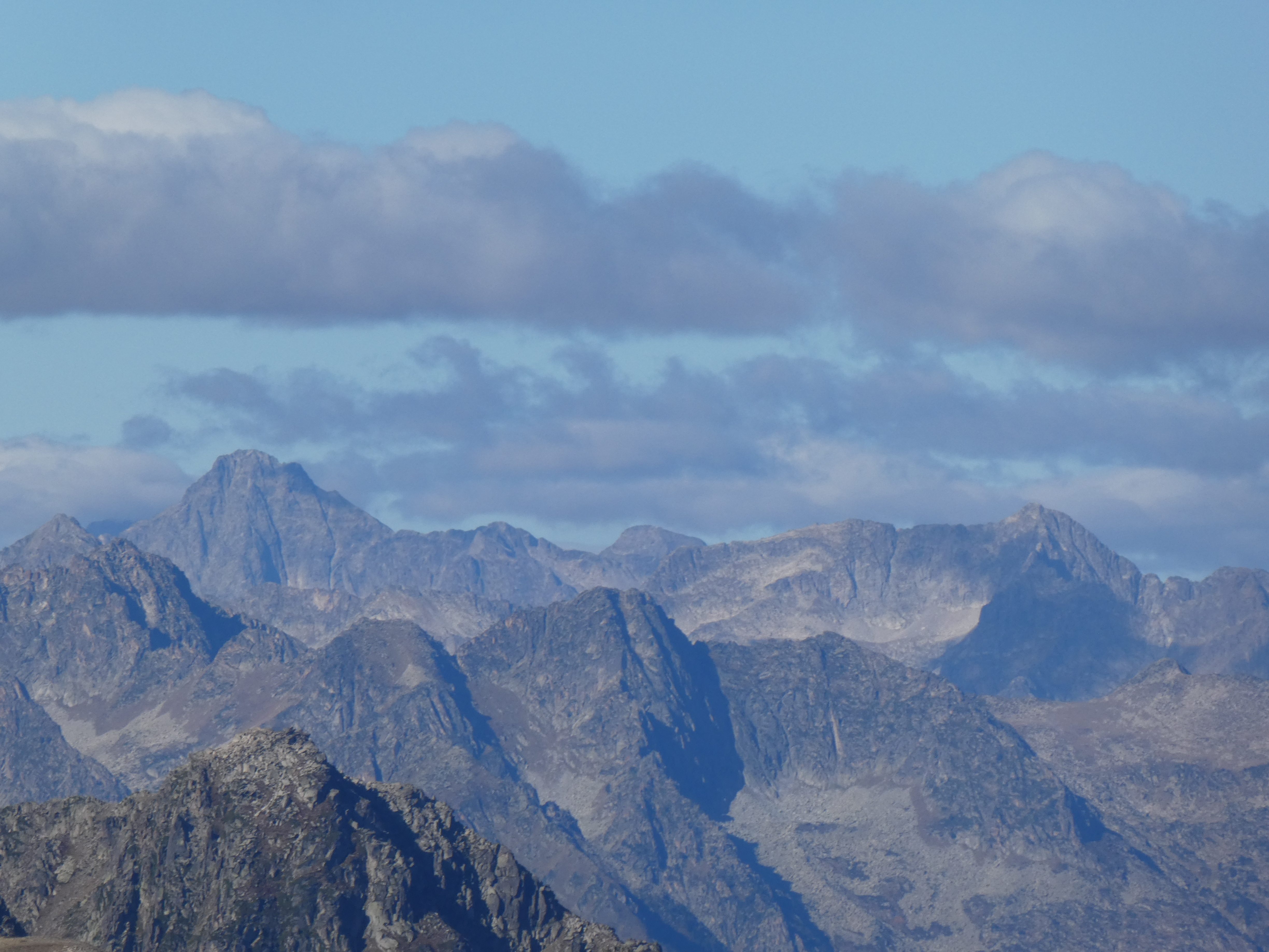 Zoom sur le Montardo (2833 m) et le Tuc de Ratèra (2863 m) à gauche, le Pic de Fonguera (2883 m) et le Gran Tuc de Colomèrs (2933 m) au centre, et le Pa de Sucre (2864 m) et le Pic de Contraix (2958 m) à droite