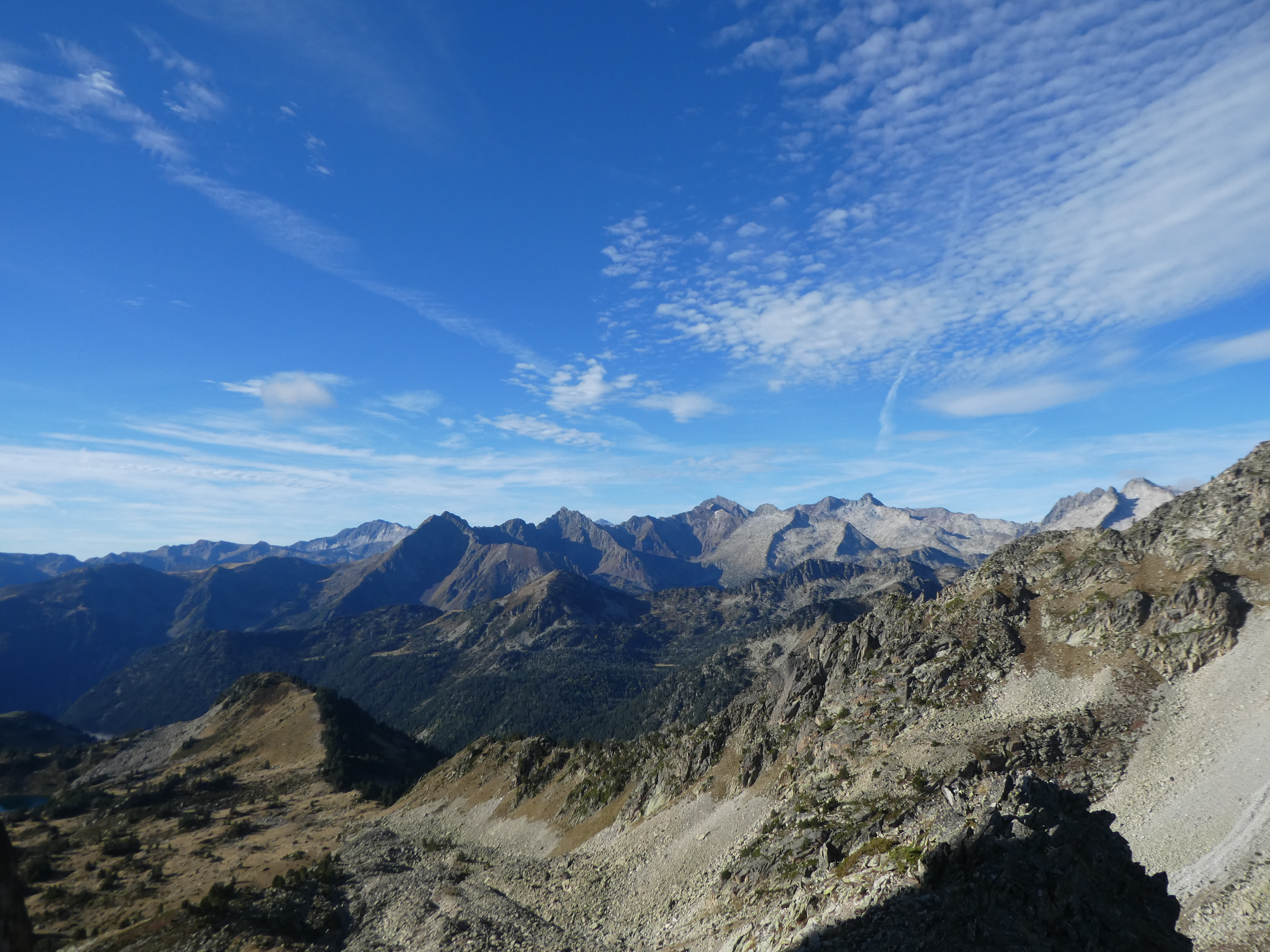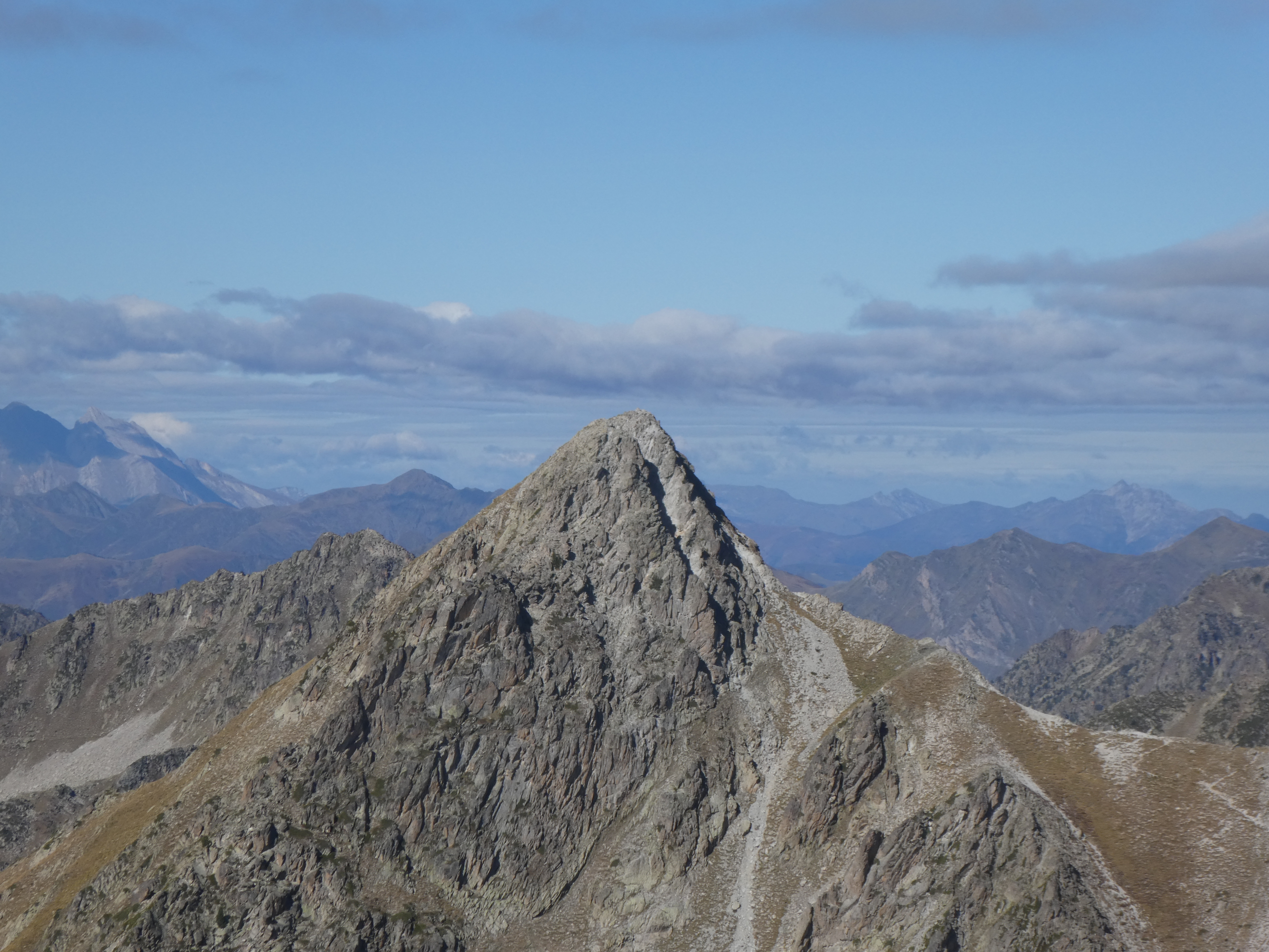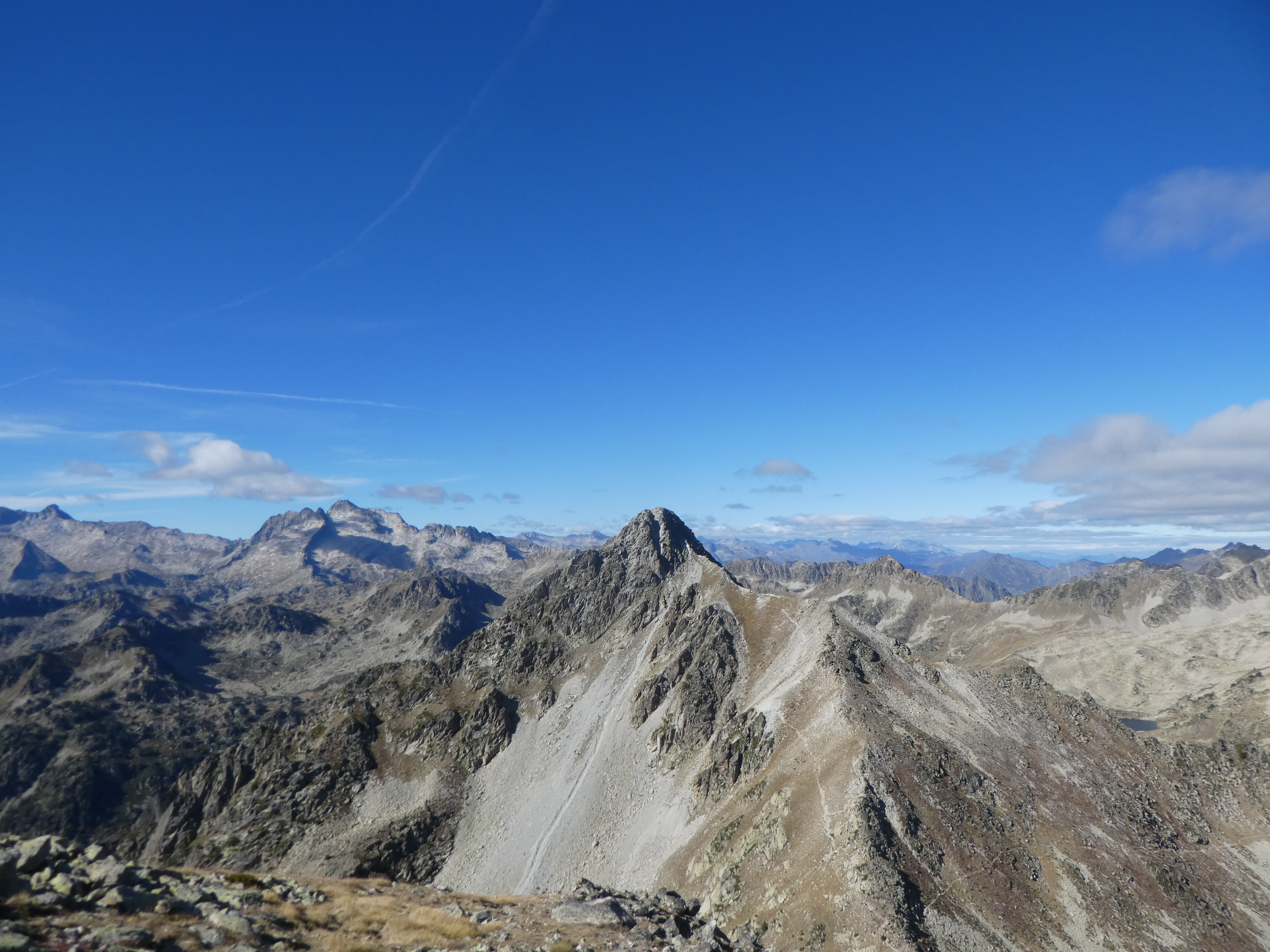 Zoom sur le Montardo (2833 m) et le Tuc de Ratèra (2863 m) à gauche, le Pic de Fonguera (2883 m) et le Gran Tuc de Colomèrs (2933 m) au centre, et le Pa de Sucre (2864 m) et le Pic de Contraix (2958 m) à droite