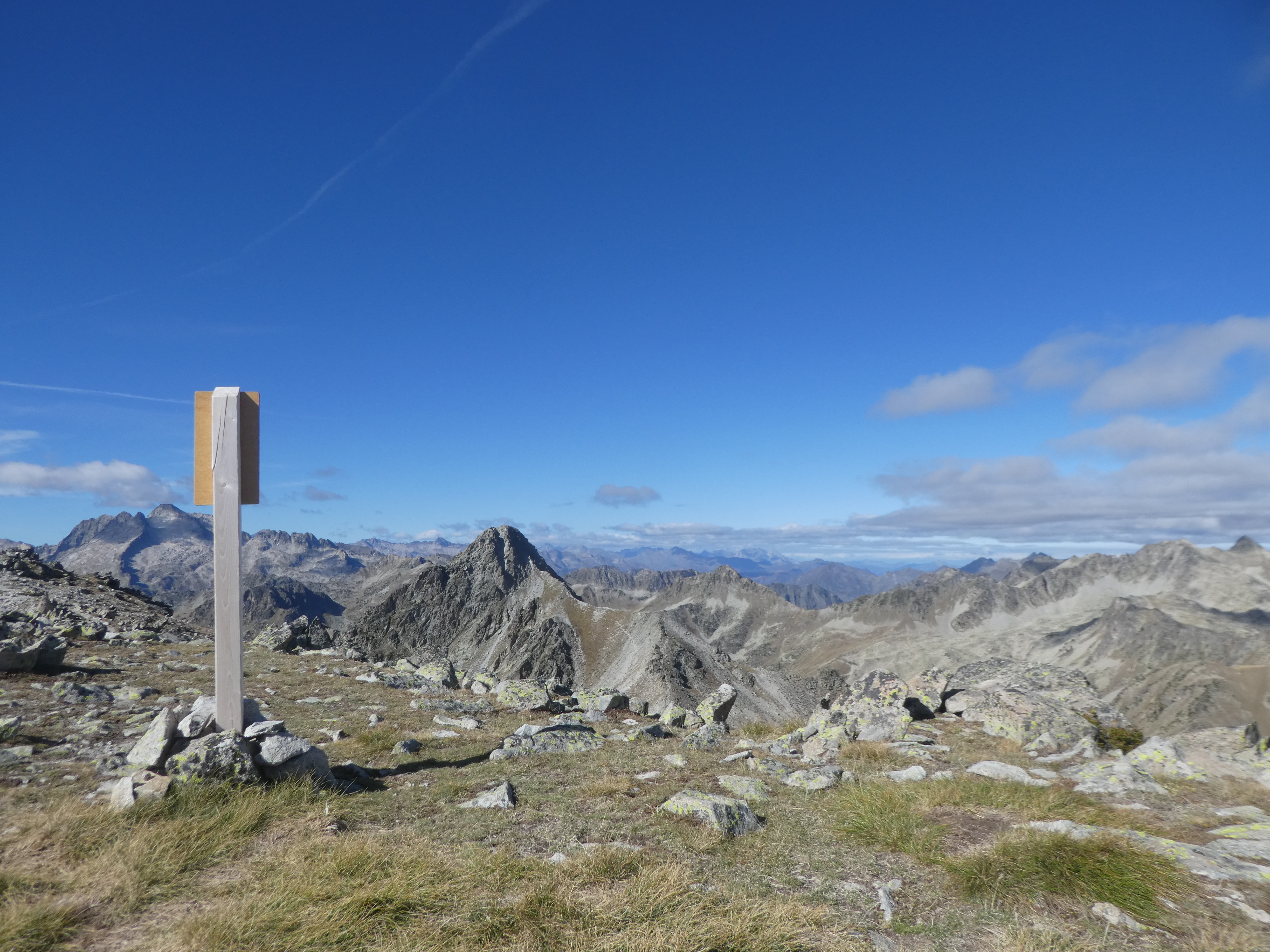 Arrivée au sommet du Pic de Portarras (2697 m) : beau panorama avec le soleil revenu sur les sommets de la Vallée d'Aure, des Pyrénées Haut-Garonnaises, du Couserans, du Val d'Aran, du Pallars Sobirà, du Sobrarbe, de la Réserve Naturelle du Néouvielle, de la Haute-Bigorre et de la Vallée des Gaves