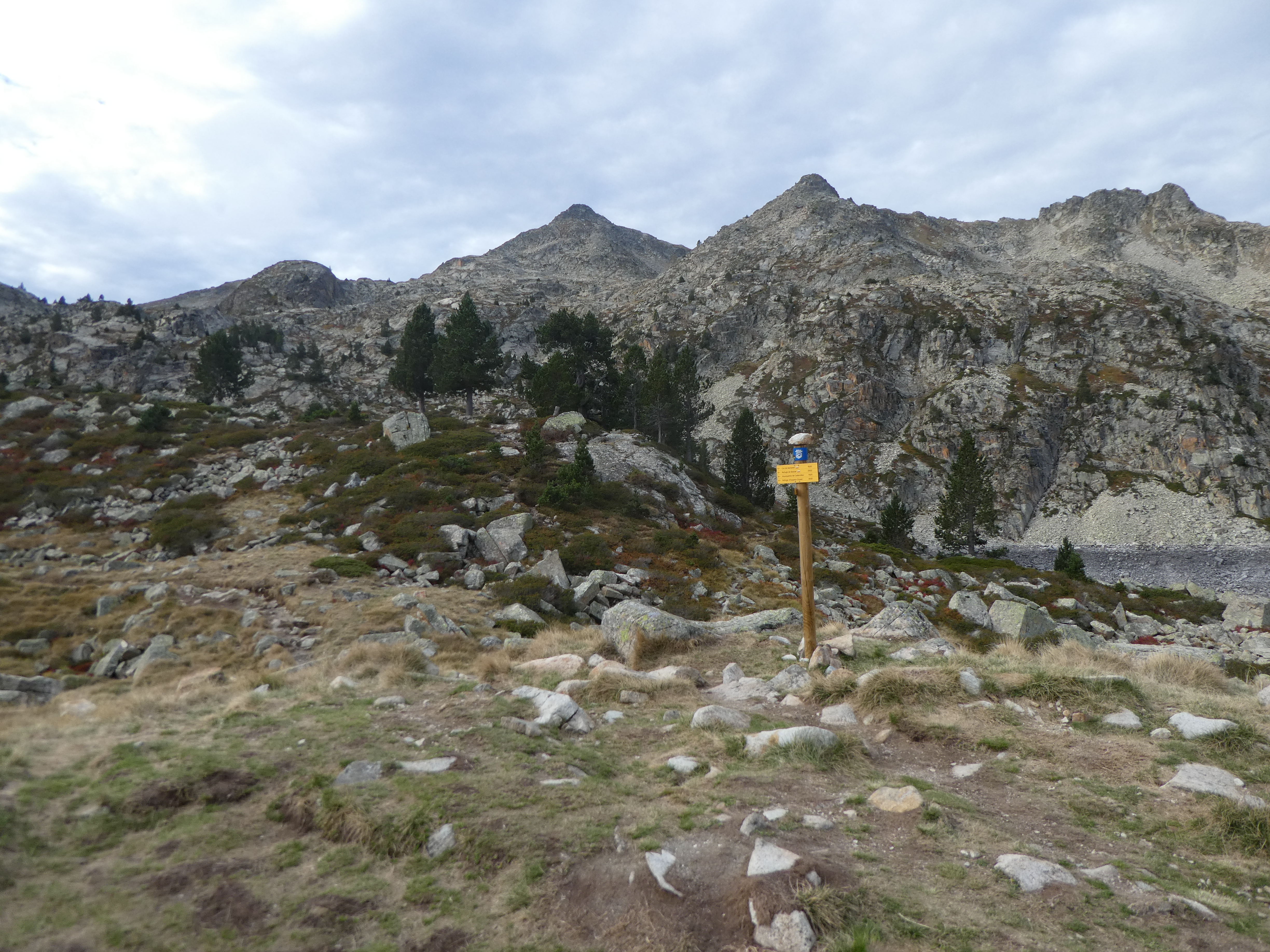 A ce croisement avec le GR10 accès marqué par la présence d'un panneau directionnel (800 mètres après le départ) (1558 m), suivre ce dernier partant sur la droite direction Refuge de Campana de Cloutou, balisé en rouge et blanc dorénavant