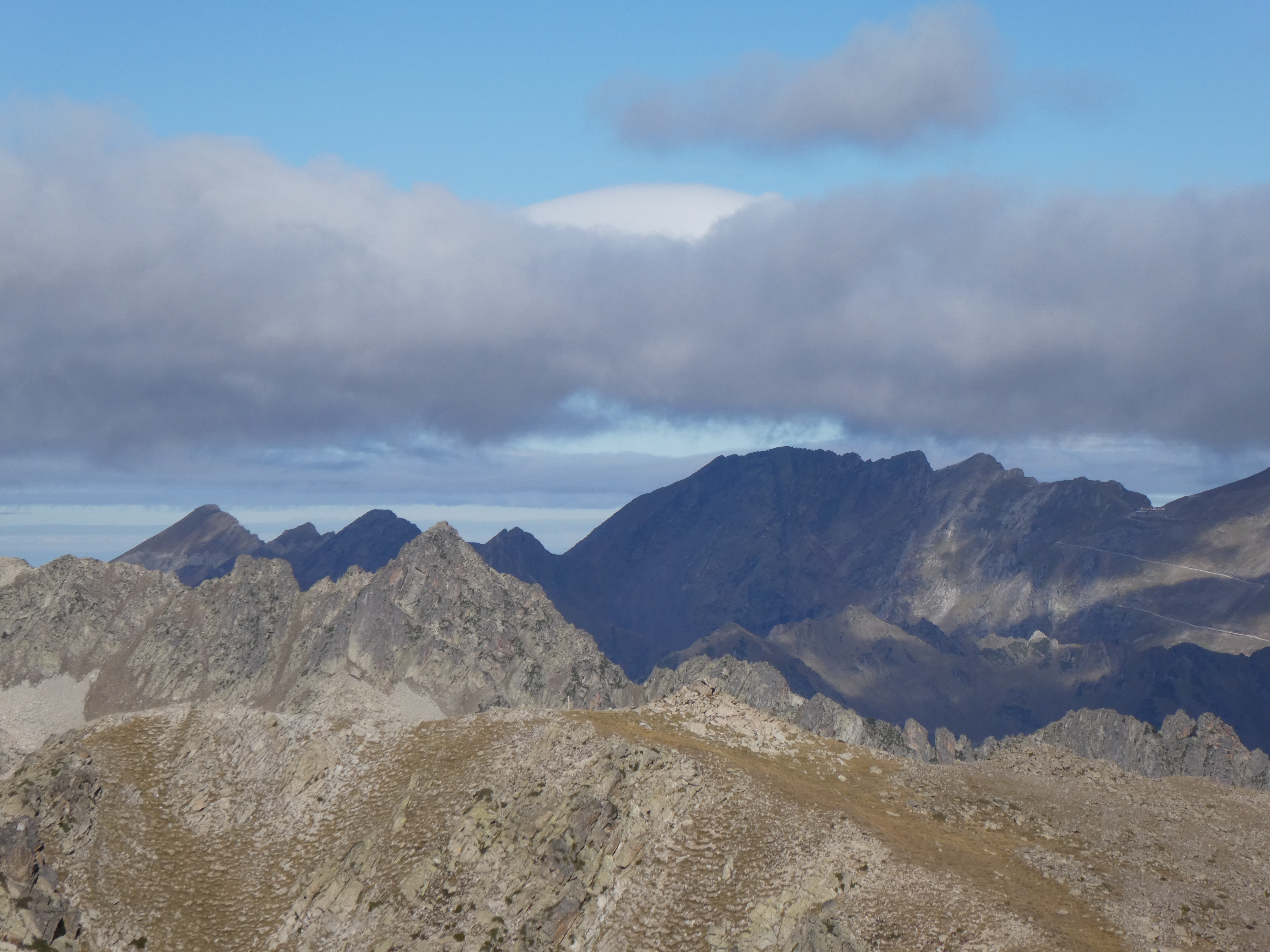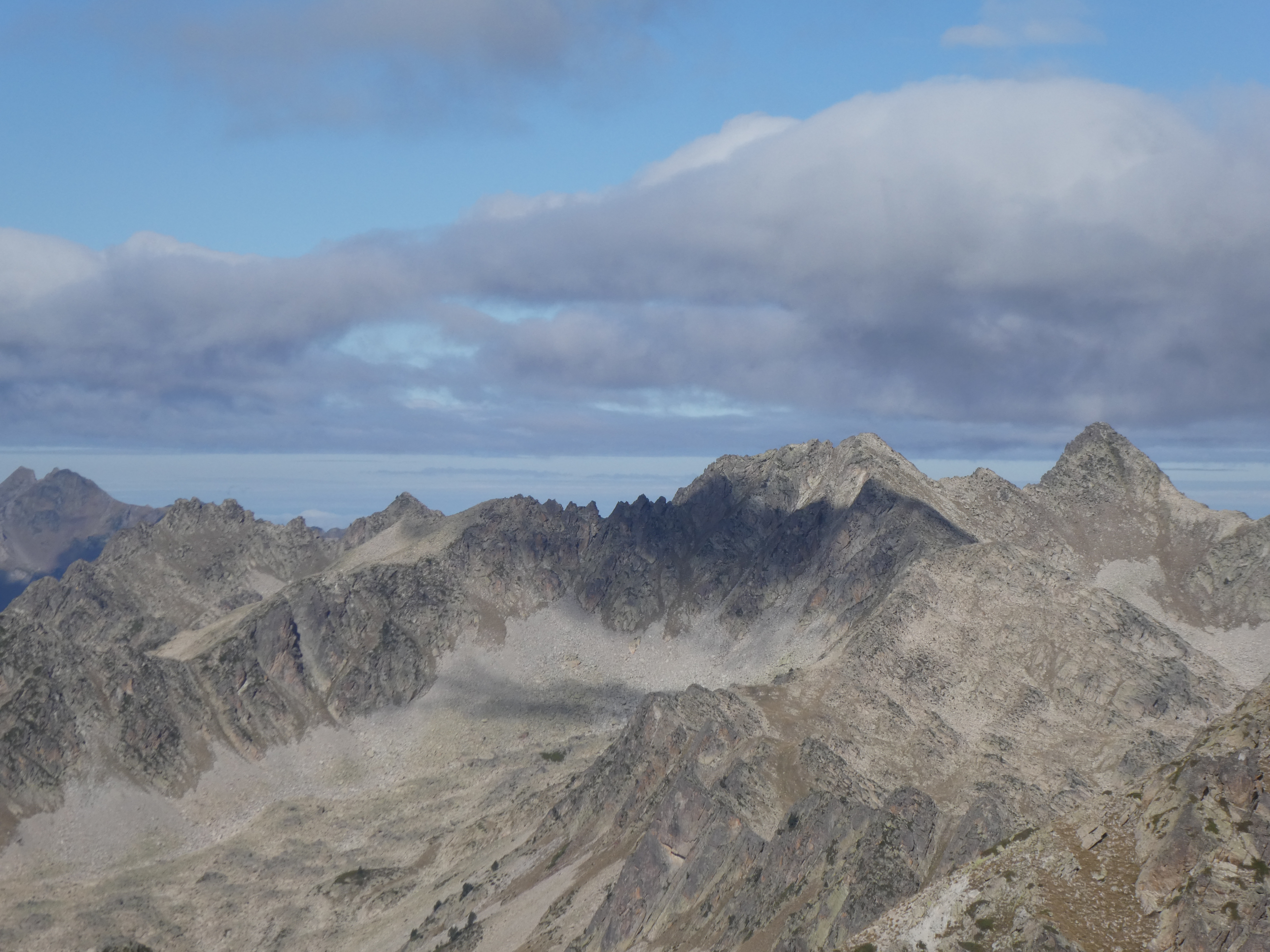 Zoom sur la Muga (2861 m) et le Tossal de Vallcivera (2846 m) à gauche, la Tossa Plana de Lles (2905 m) au centre-gauche, et la Torre de Cabús (2780 m) et les Bassiets (2760 m) à droite