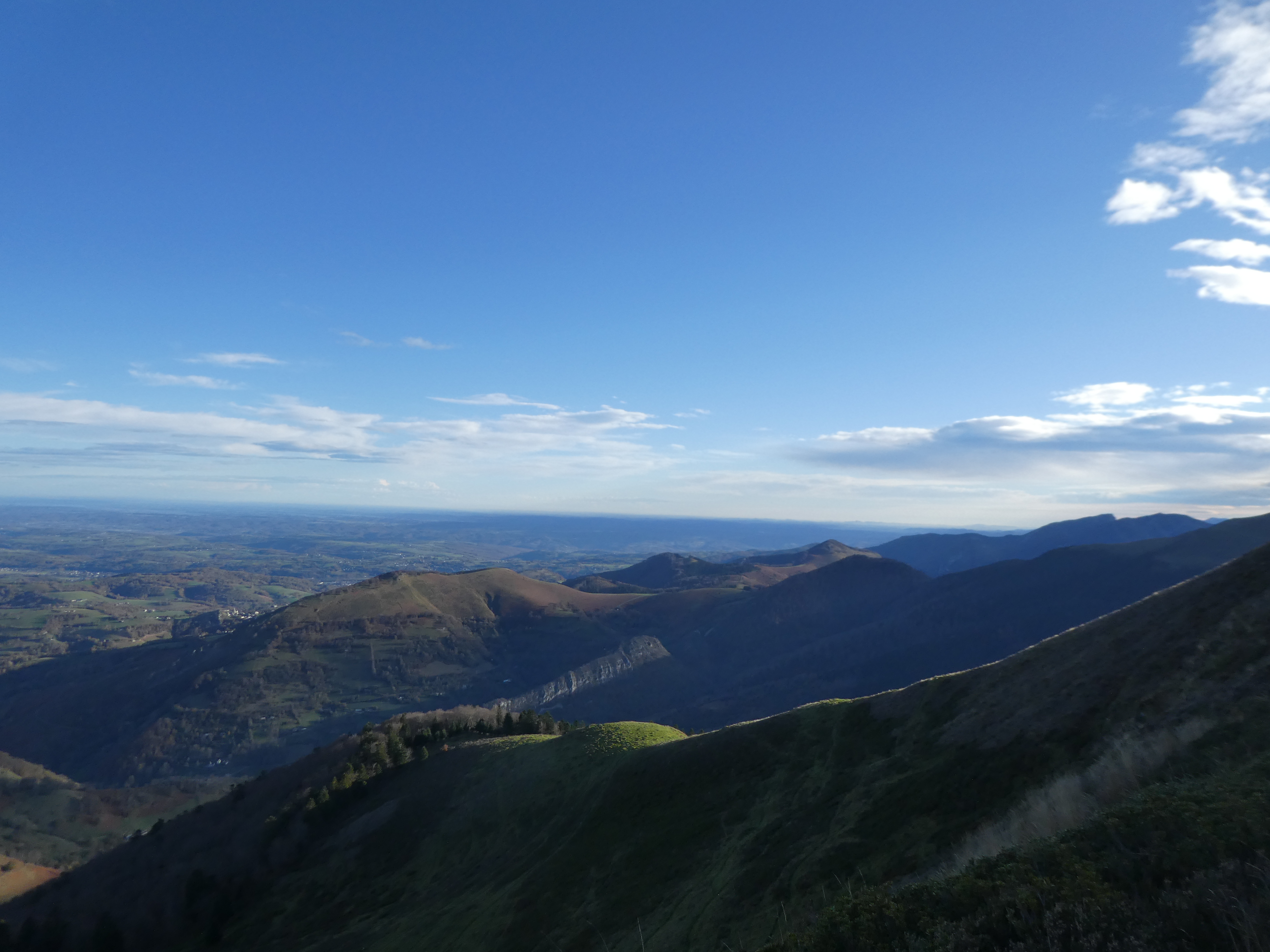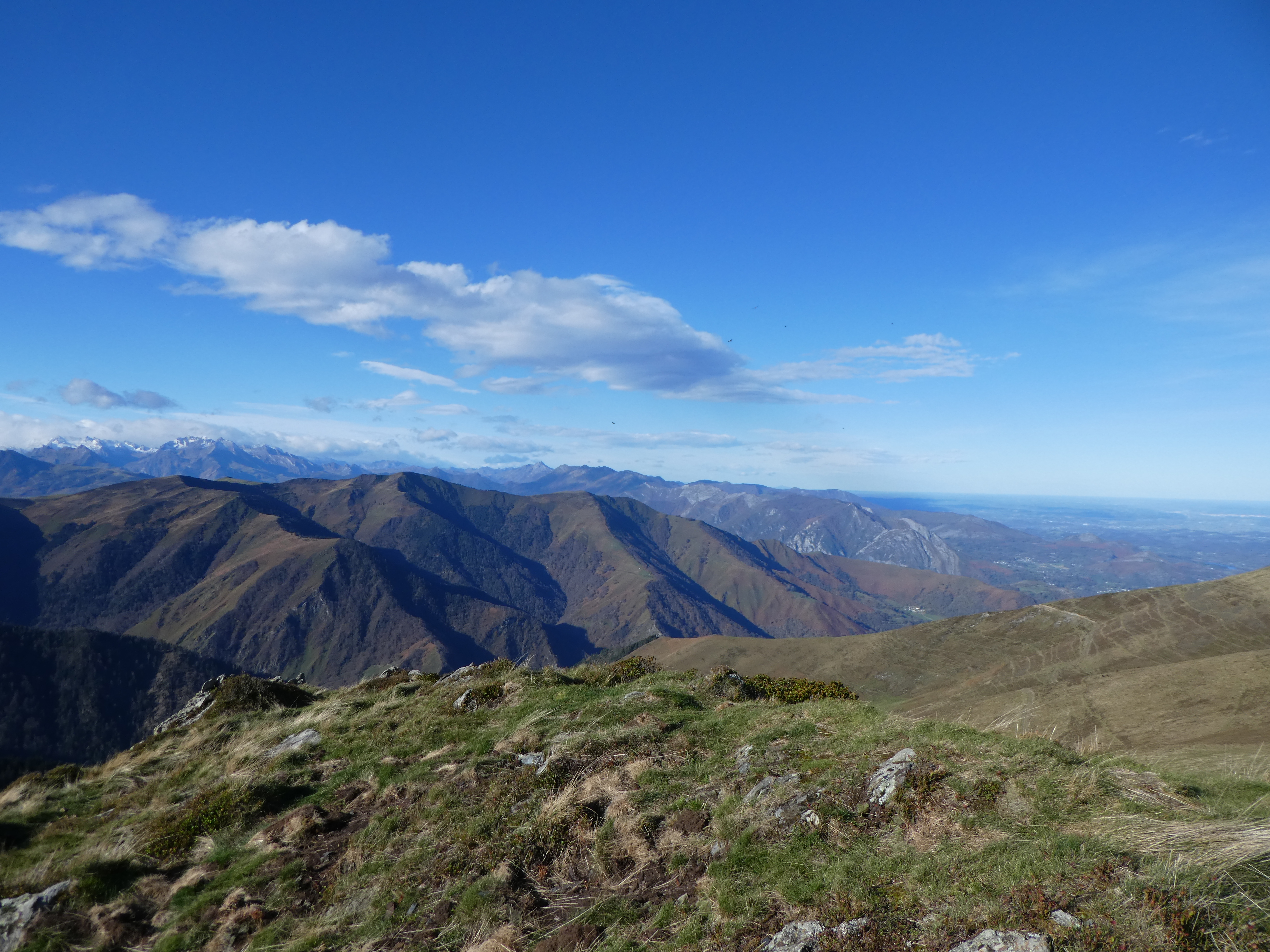 Arrivée au sommet du Cuq Crémail (1691 m) : beau panorama sur les sommets de la Vallée des Gaves, du Val d'Azun, de la Vallée du Valentin, de la Vallée de l'Ouzom, du Piémont Bigourdan ainsi que sur la plaine béarnaise et bigourdane