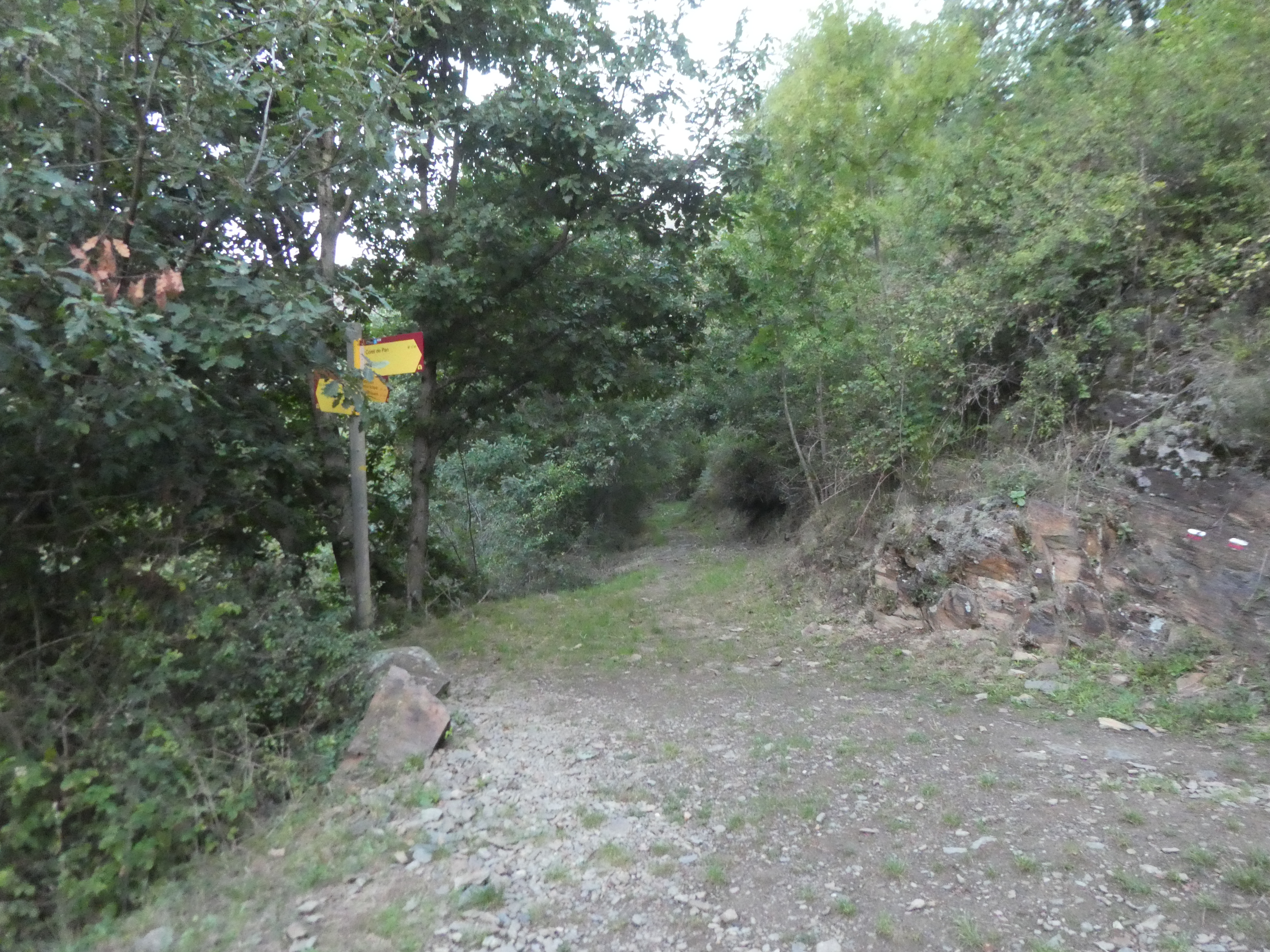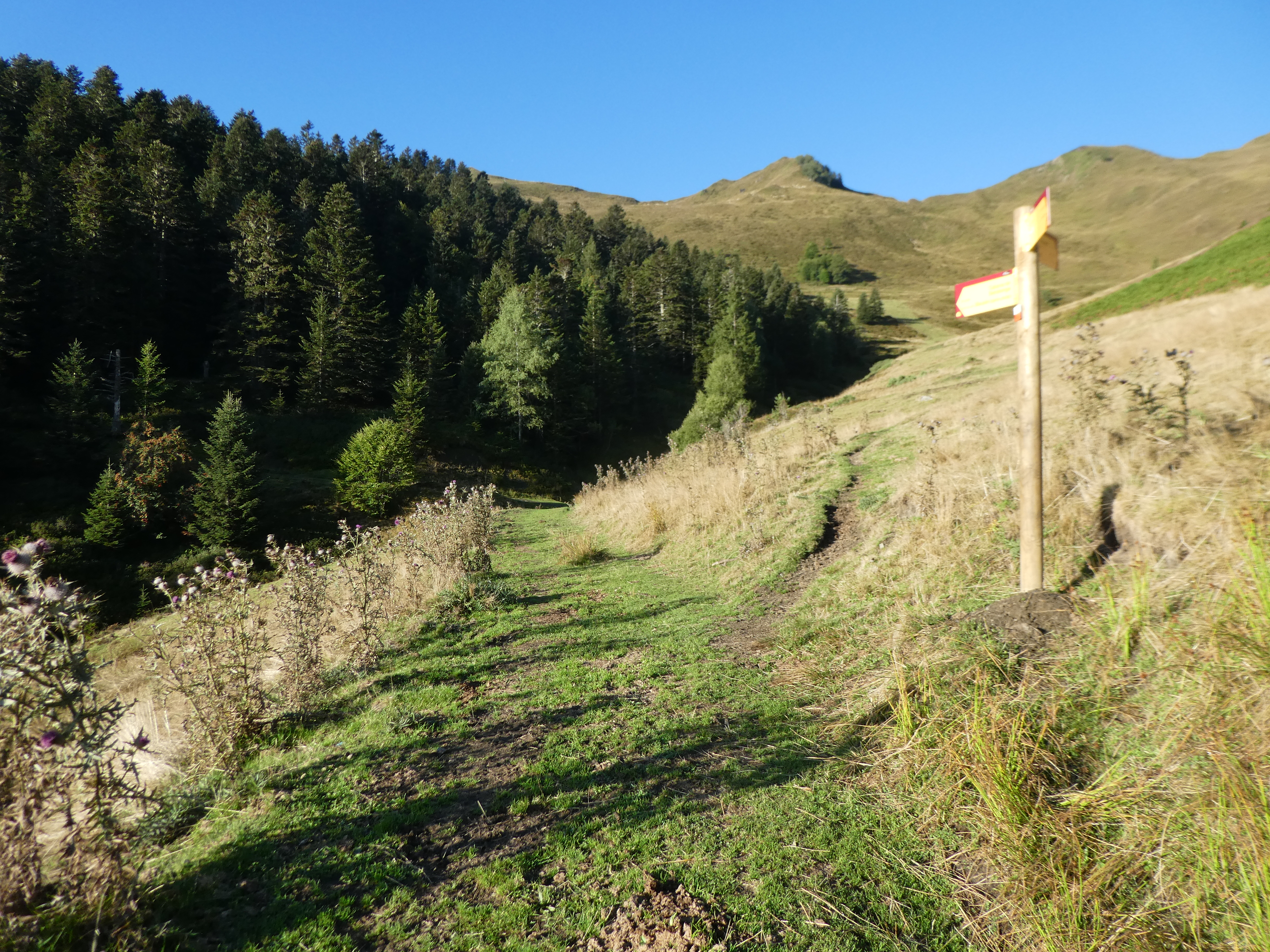 A ce croisement marqué par la présence d'un panneau directionnel (1100 mètres après le Coret de Pan), suivre le chemin partant sur la gauche direction Bausen, balisé en rouge et blanc, et sporadiquement en jaune dorénavant (boucle bouclée)