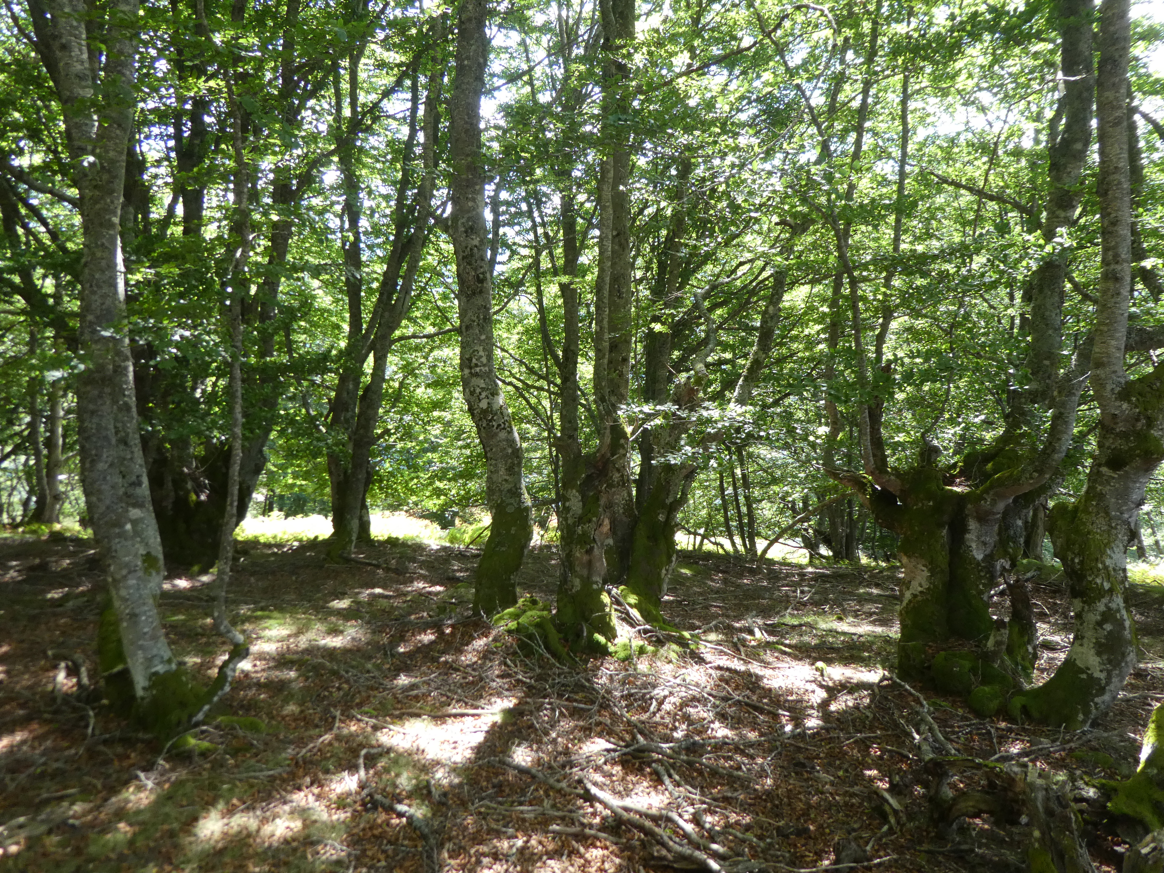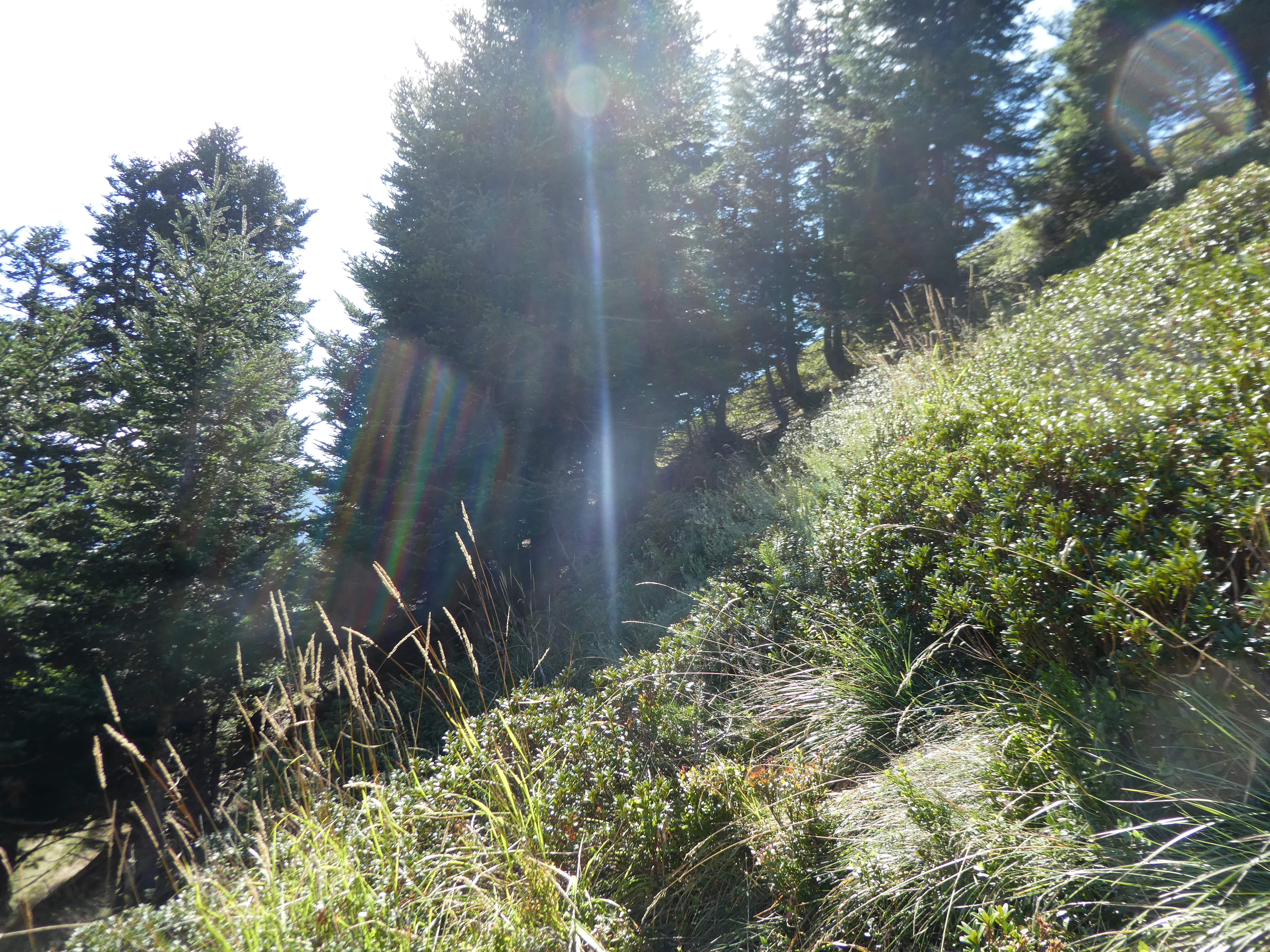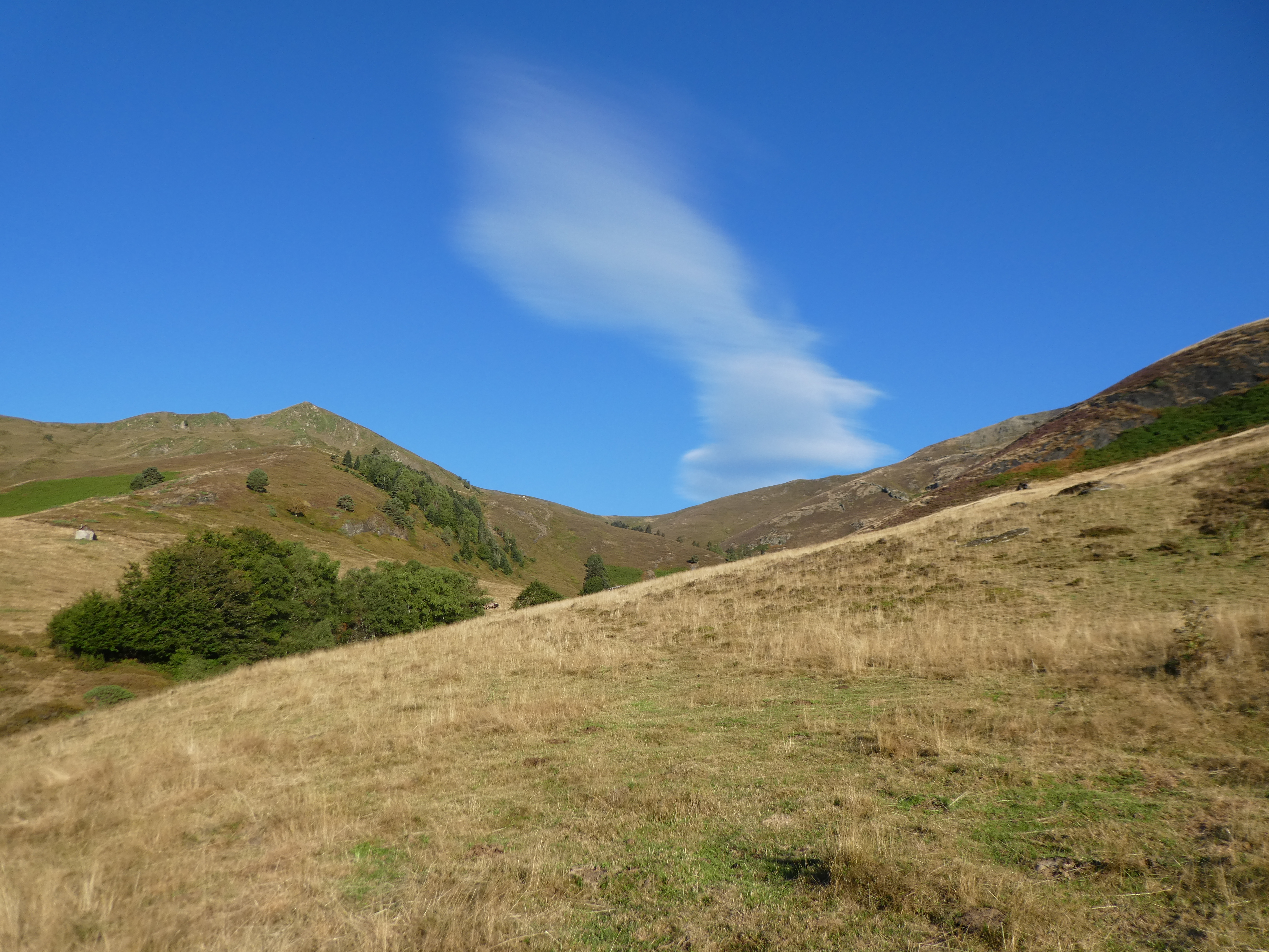 Au niveau de la présence de ces arbres caractéristiques cote 1448 m (1200 mètres après avoir rejoint la crête de Plansorda), continuer à progresser sur la gauche en suivant de loin la lisière de la forêt sans en sortir direction Coret de Pan